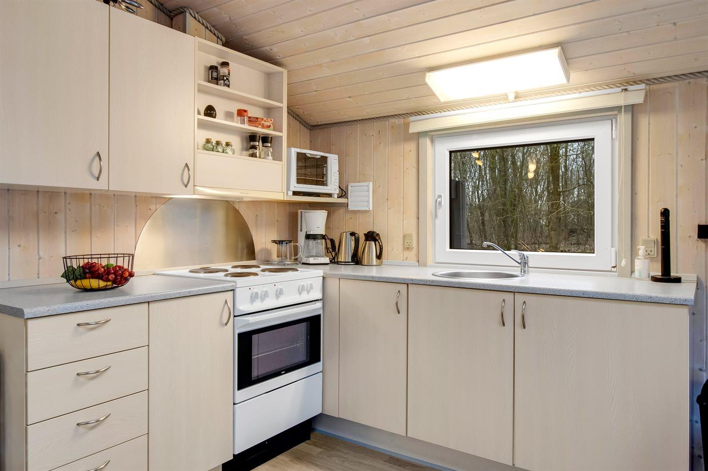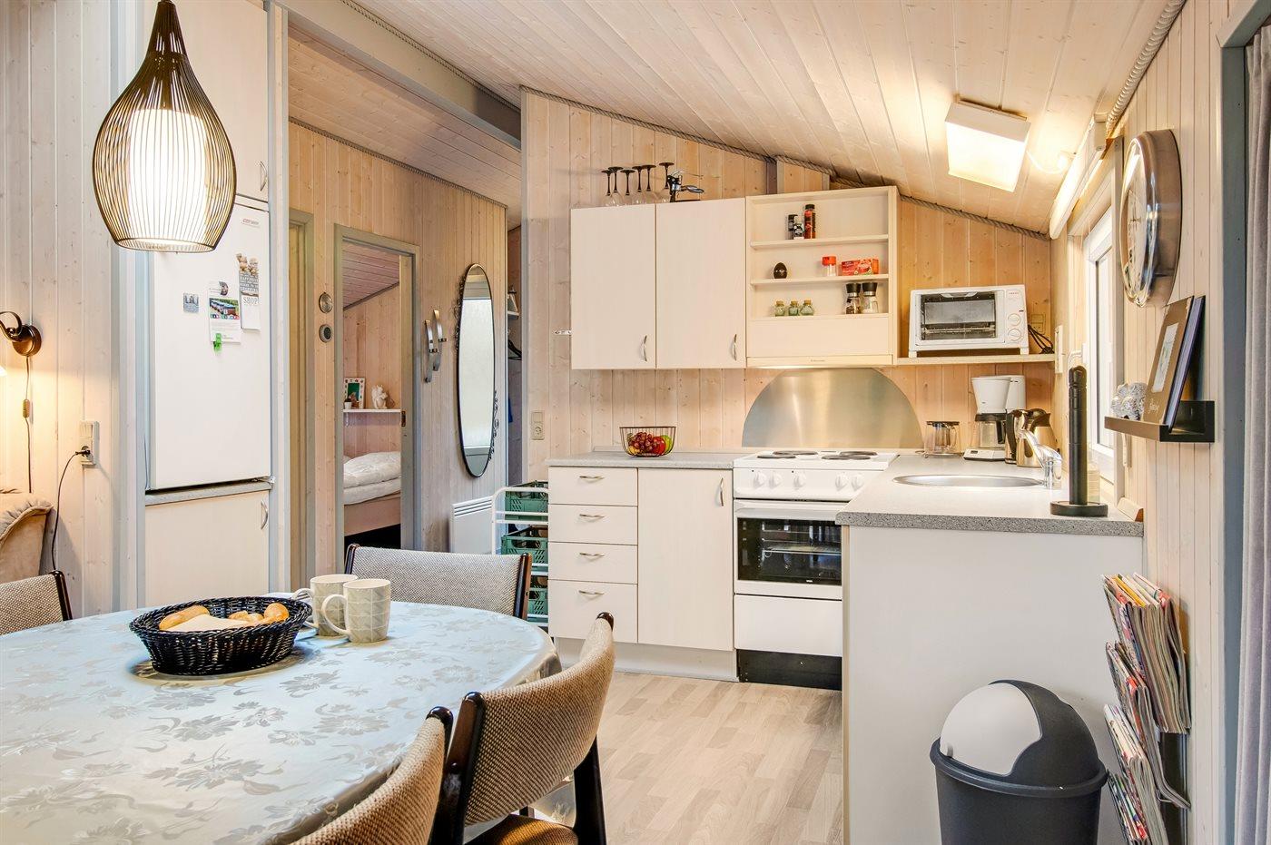 Køkkenet er udstyret med 1 køleskab. Der er 4 elkogeplader, miniovn, varmluftovn.