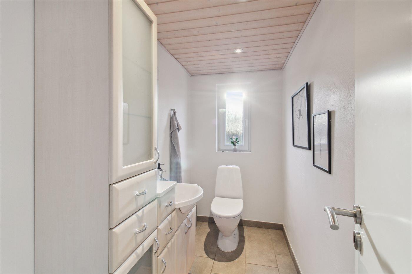 Der er 1 badeværelse med bruseniche og 2 toiletter, heraf 1 gæstetoilet. Der er gulvvarme på 1 badeværelse.. Badekar.