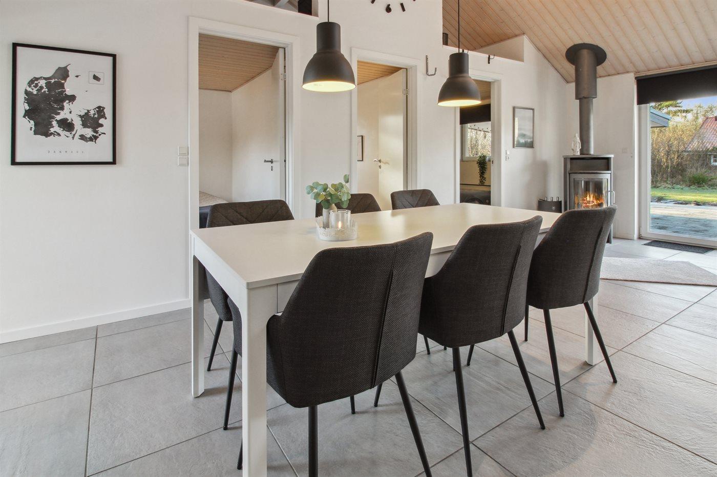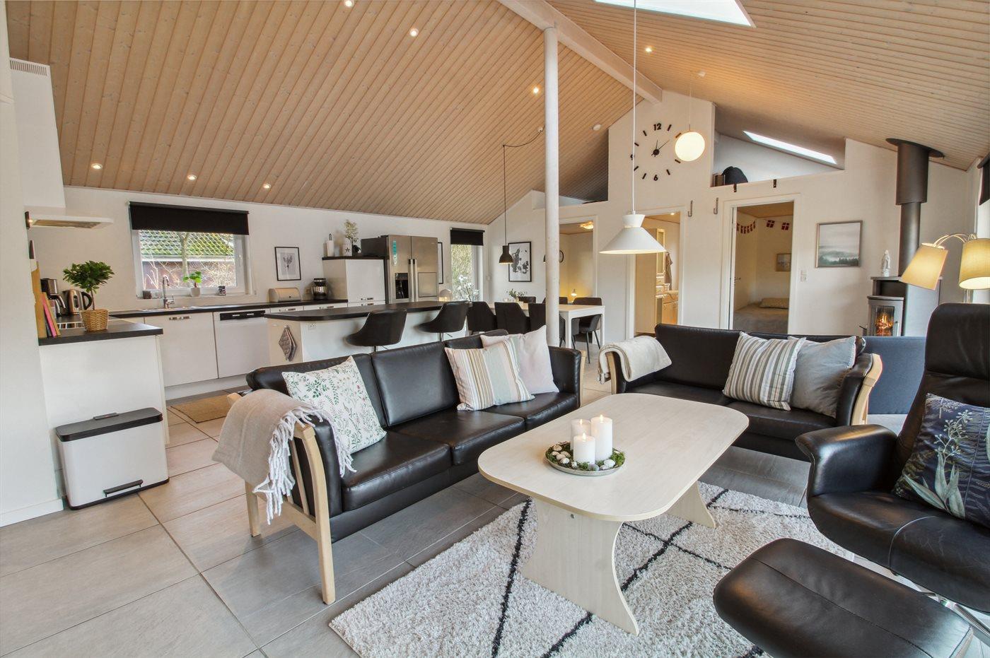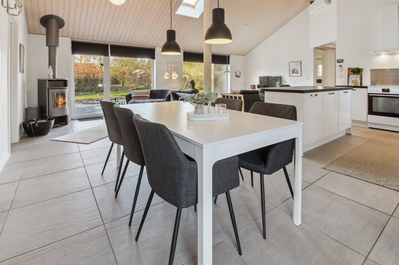 Feriehuset har et stort lyst køkken/alrum med lofter til kip og direkte udgang til den store, delvist overdækkede terrasse.