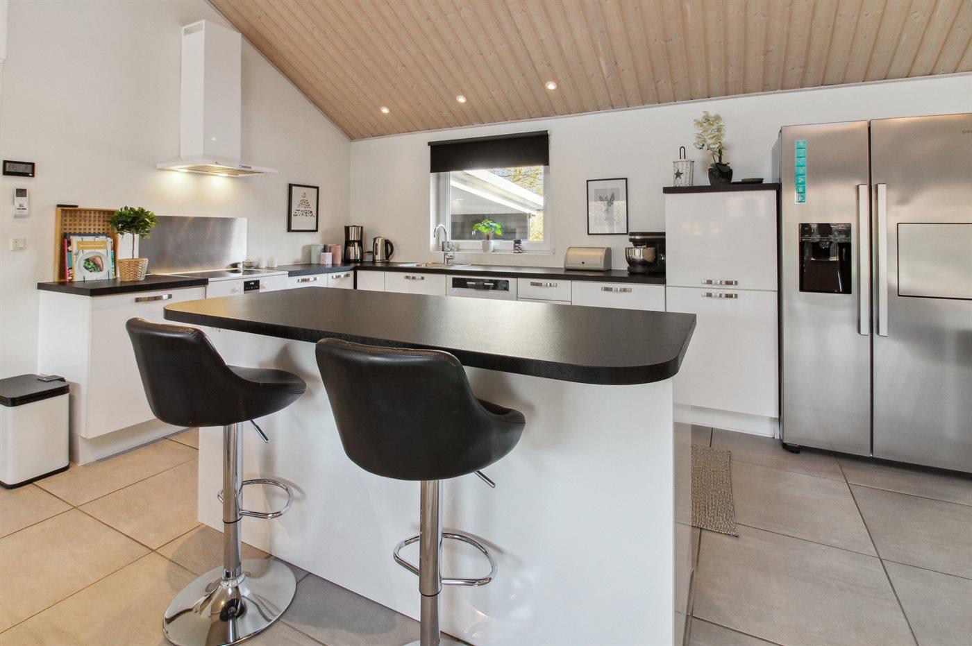 Køkkenet er udstyret med 1 køleskab. Der er 4 induktionskogeplader, miniovn, varmluftovn, mikrobølgeovn samt opvaskemaskine Der er gulvvarme i køkkenet.