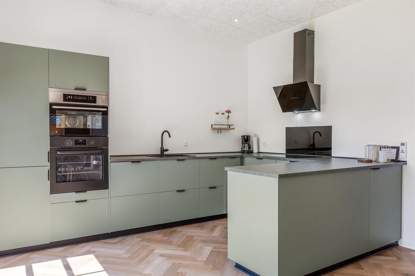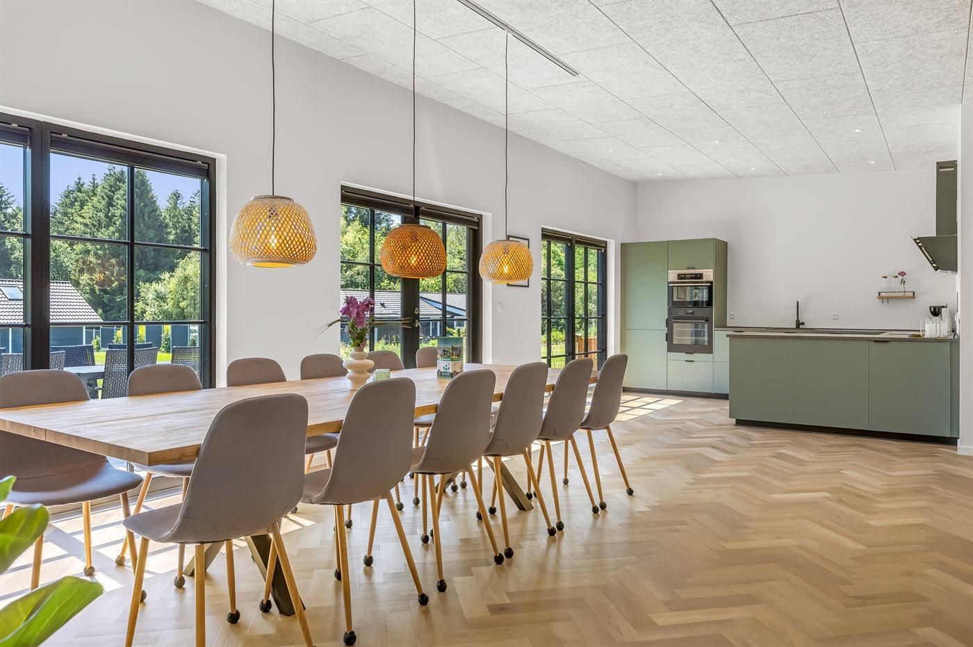 Køkkenet er udstyret med 1 køleskab. Der er 4 induktionskogeplader, varmluftovn, mikrobølgeovn samt opvaskemaskine.