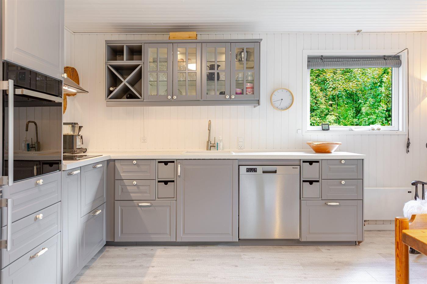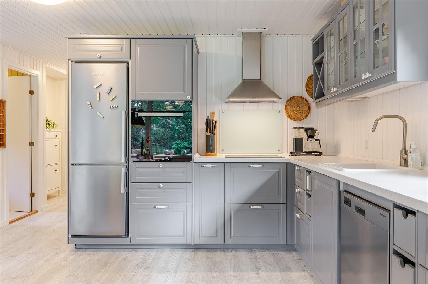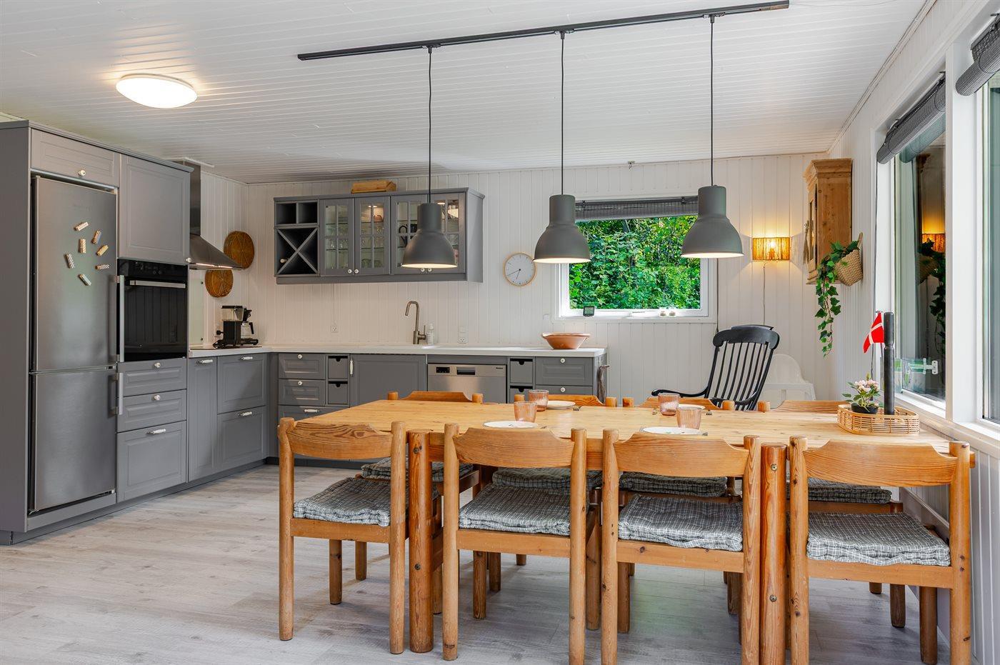 Køkkenet er udstyret med 1 køleskab. Frysekapacitet på 60 liter. Der er 4 induktionskogeplader, varmluftovn, mikrobølgeovn samt opvaskemaskine.