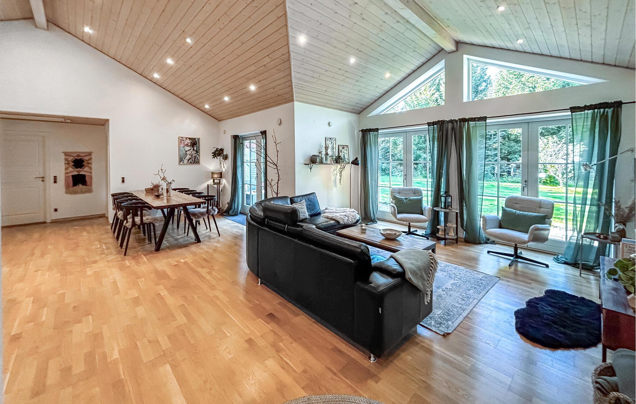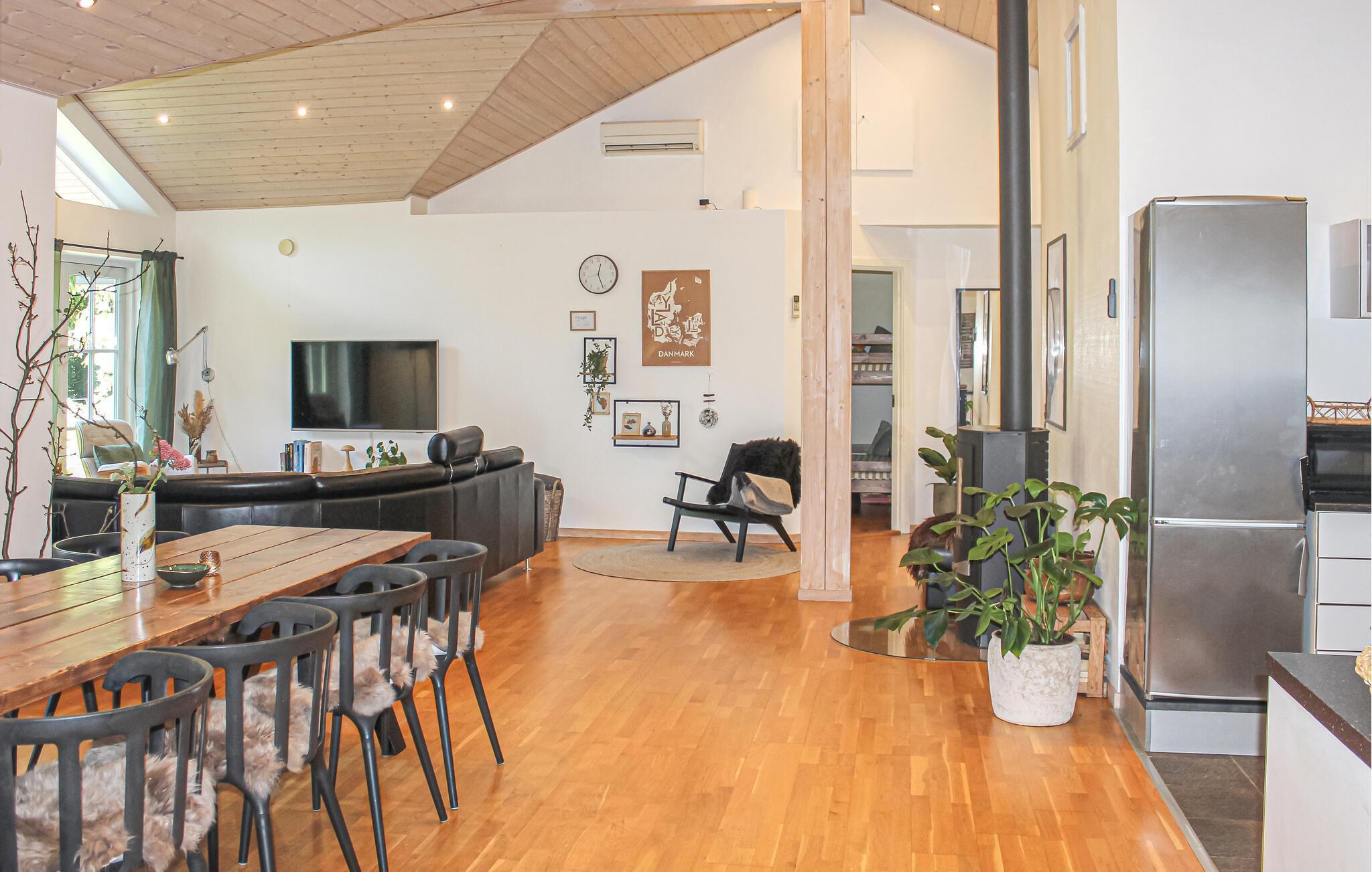 Skønt svensk-inspireret bjælkehus i Arrild Ferieby med brændeovn, spabad og stor, åben grund.