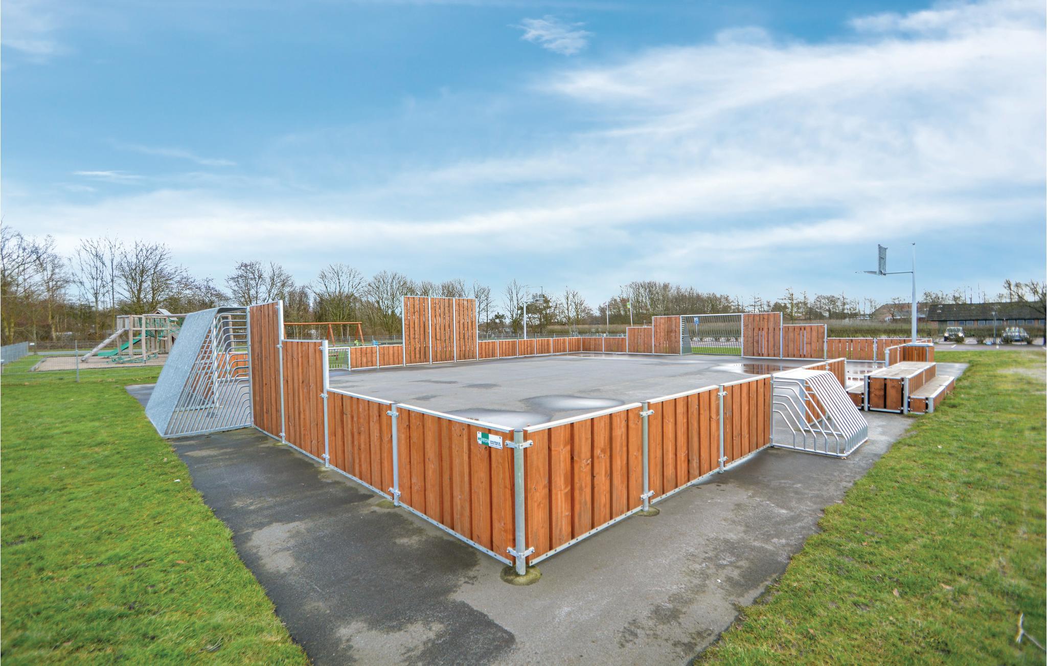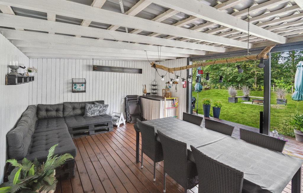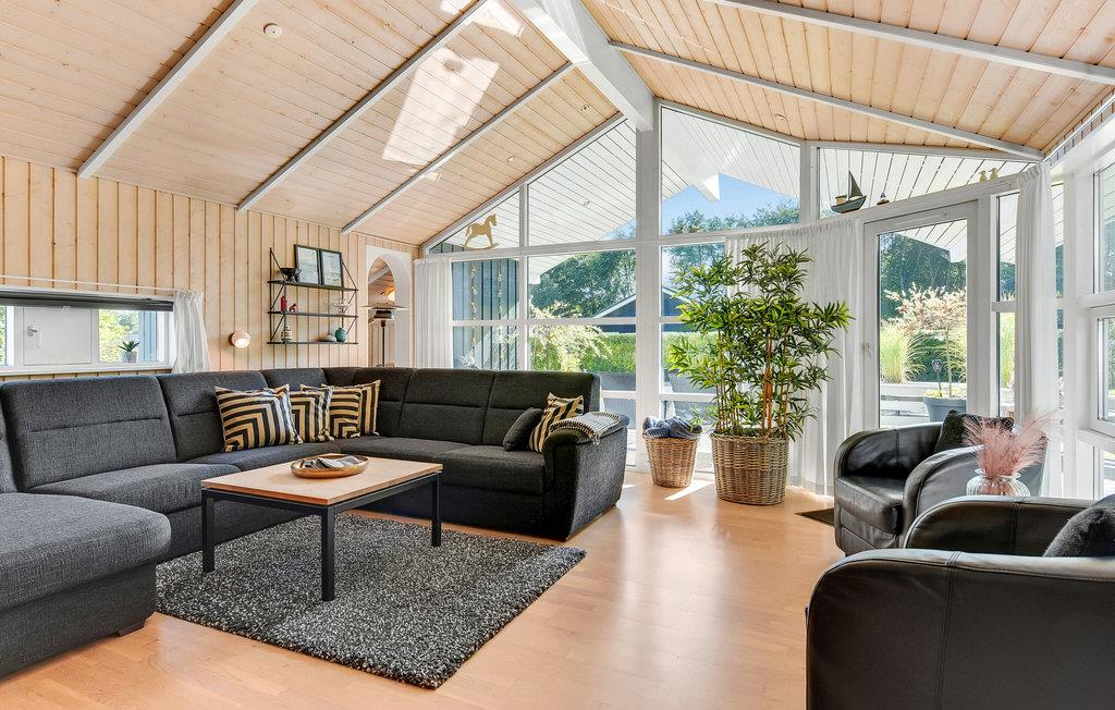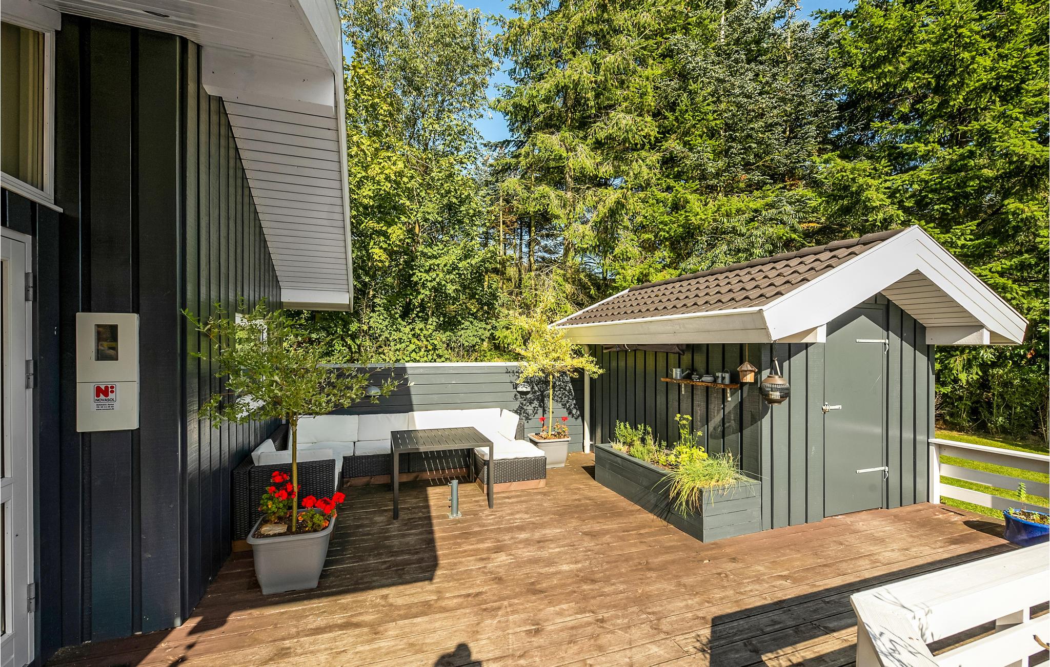 Dejligt træferiehus i Arrild Ferieby med spabad, sauna og stor terrasse nær fiskesø og aktiviteter.