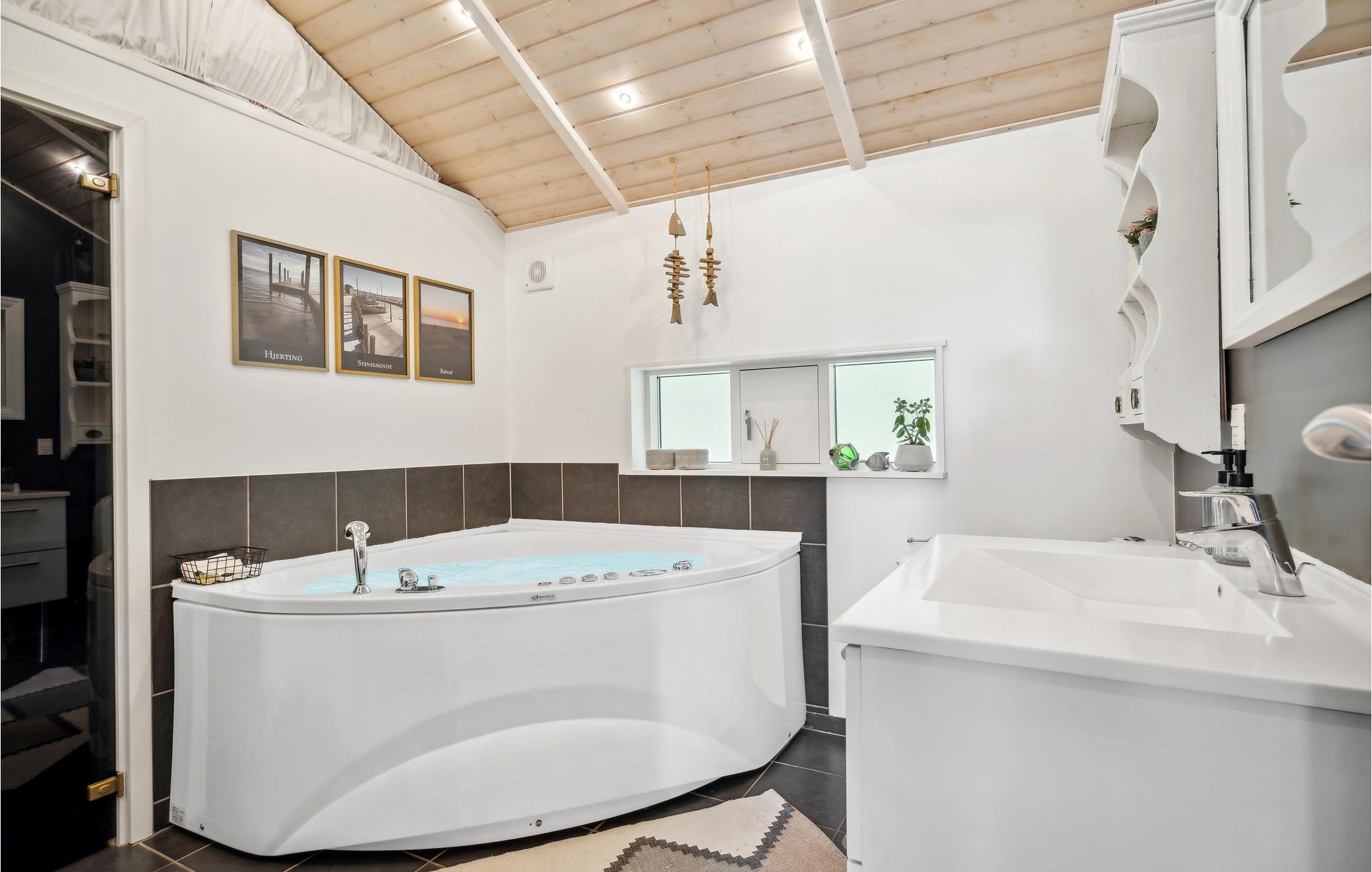 Dette dejlige træferiehus ligger på en god, stor grund i et område med andre kvalitetshuse. Tæt på fiskesøen og i et trygt og børnevenligt område. Feriehuset er lyst, moderne og udstyret med pæne kvalitetsmøbler. Med to badeværelser, spabad, sauna og alkove i tilknytning til stuen, er huset særdeles velegnet til storfamilen, to familier eller vennepar. En del af den enorme terrasse er overdækket. Et meget populært hus til en skøn ferie.