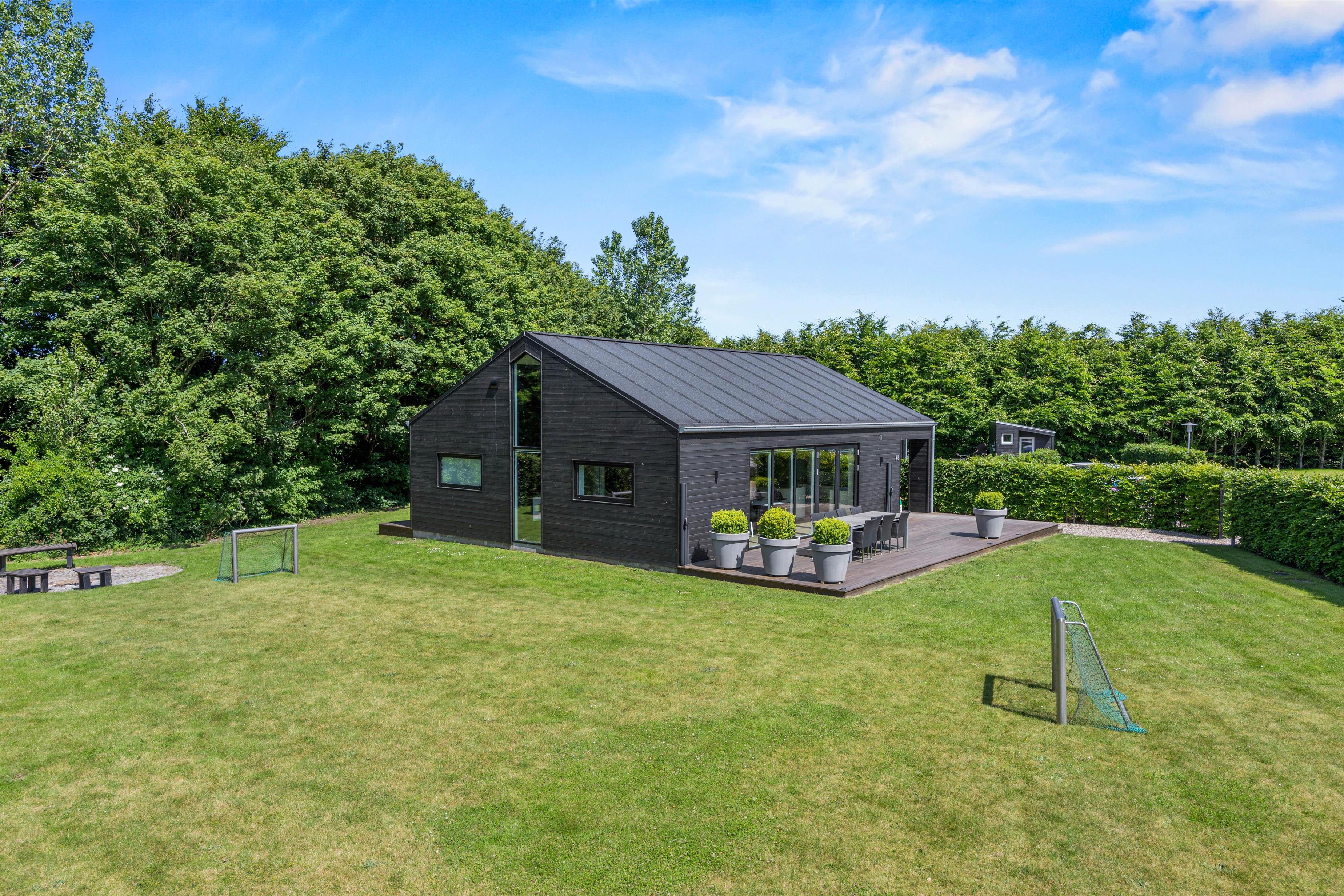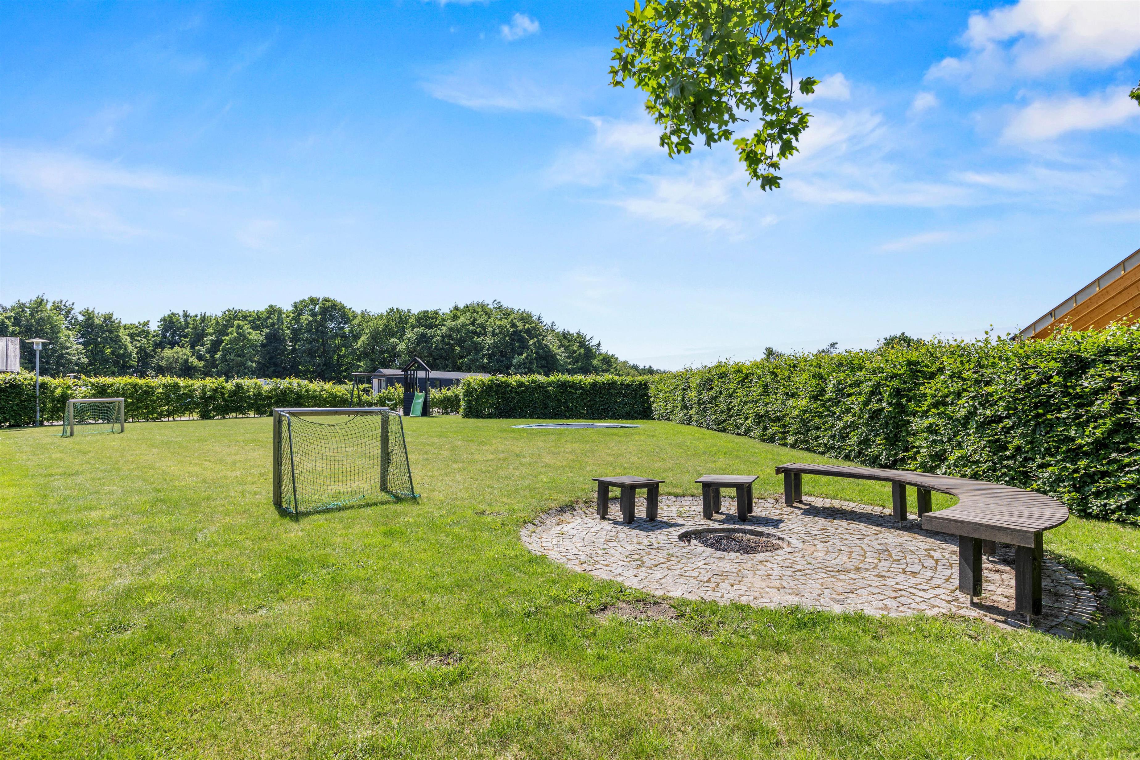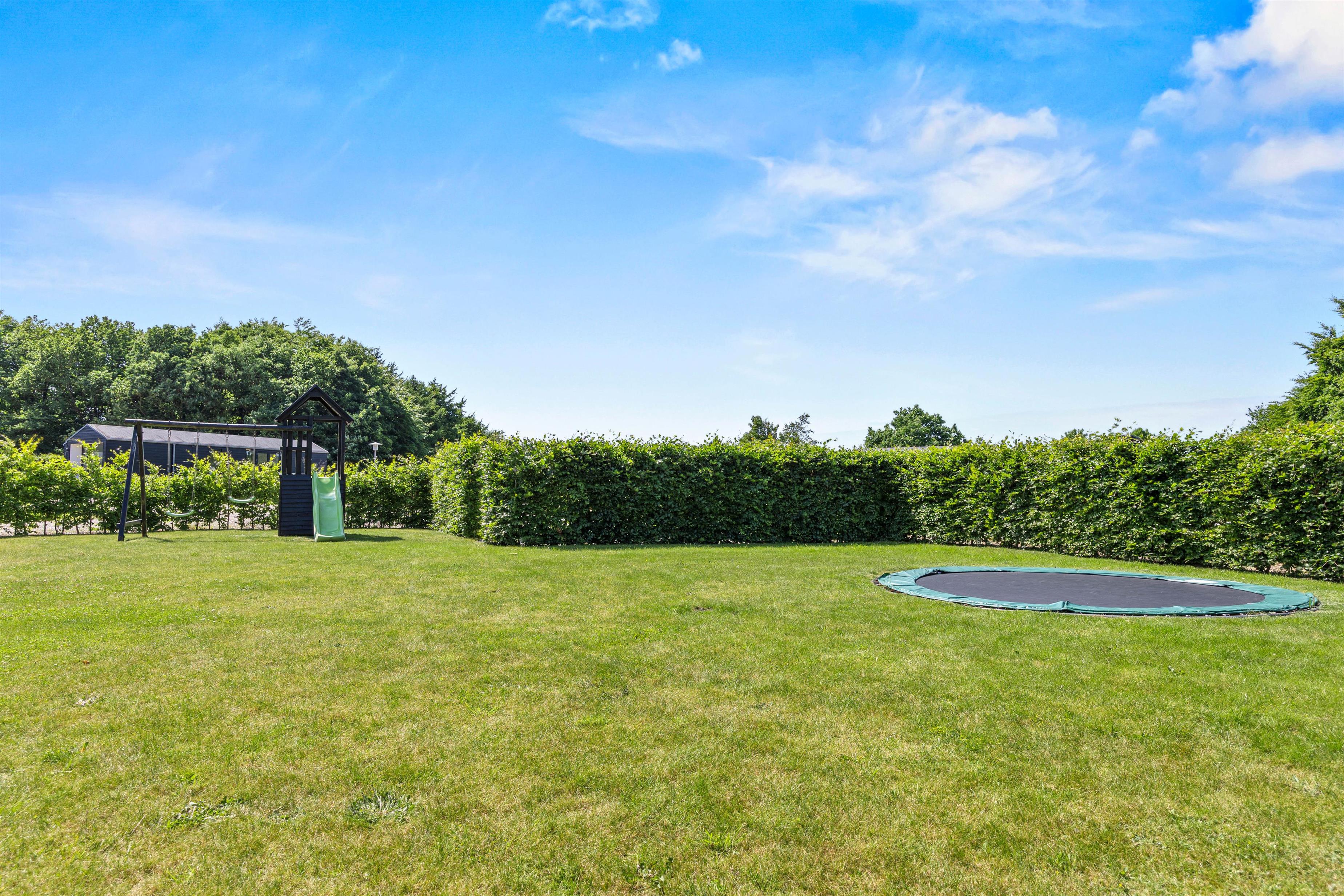 Grillen indbyder til fælles grillmiddage, mens gynge, trampolin, rutschebane og åbent areal giver plads til leg og bevægelse i trygge rammer. Når duggen falder, kan I tænde lyset på terrassen og lade aftenen fortsætte under stjernerne, omgivet af det rolige landskab.