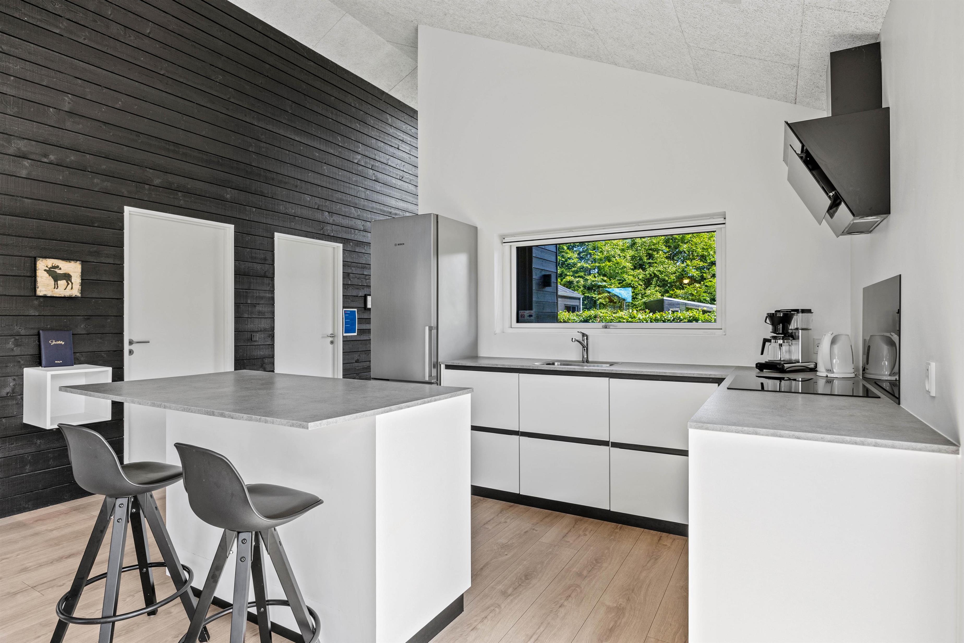 Det funktionelle køkken står i åben forbindelse med spisestuen og indbyder til fælles madlavning. Udstyret med ovn, opvaskemaskine, mikroovn, køleskab med frostboks og induktionskomfur er det både effektivt og indbydende at trylle lækre retter frem. Lysindfaldet fra de store vinduer skaber en indbydende ramme om spisebordet, hvor I kan nyde aftenens måltider i stearinlysets skær.