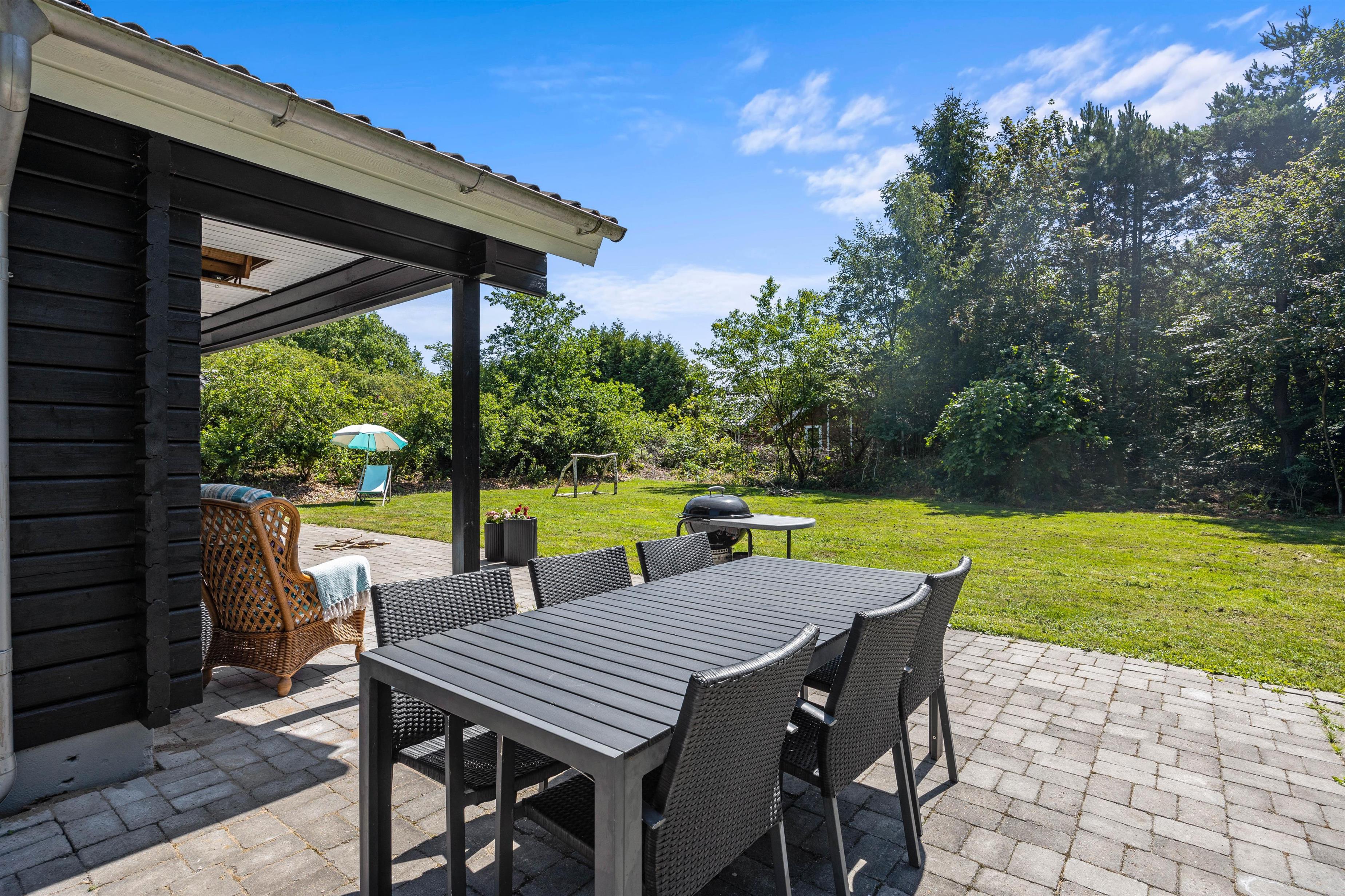 Om aftenen kan I også samles på terrassen og spise en smagfuld middag tilberedt på sommerhusets grill. På denne fredelige grund er I afskærmet bag træerne, så I kan blot nyde hinandens selskab. Slut evt. af med et hyggeligt spil kongespil på den grønne plæne eller gå en tur ved Vesterhavet, der ligger en køretur på små 25 minutter fra huset.