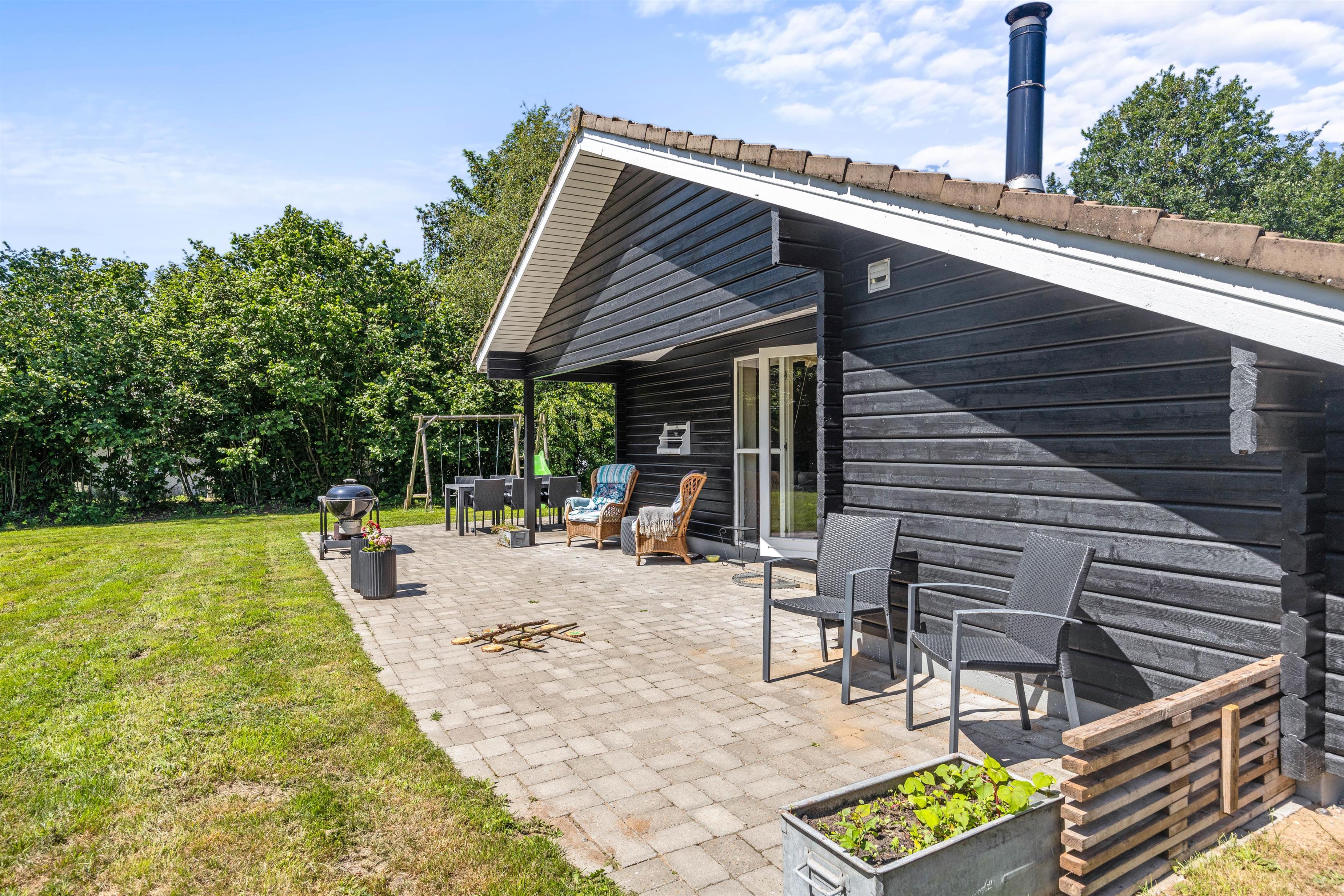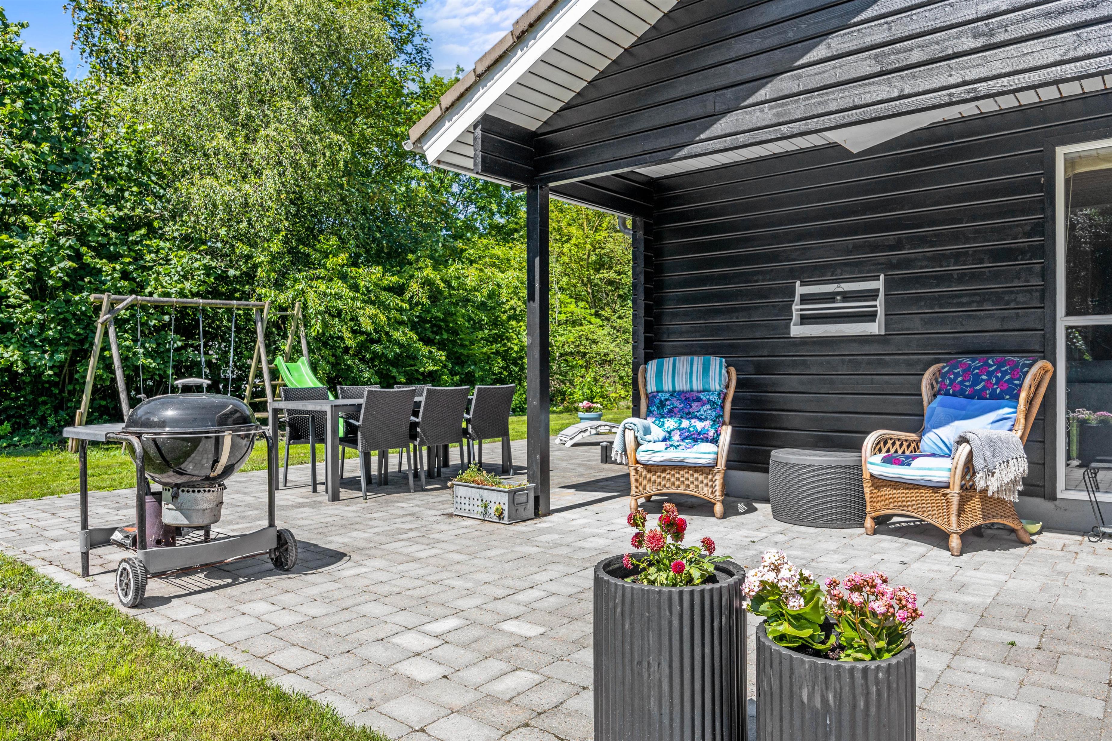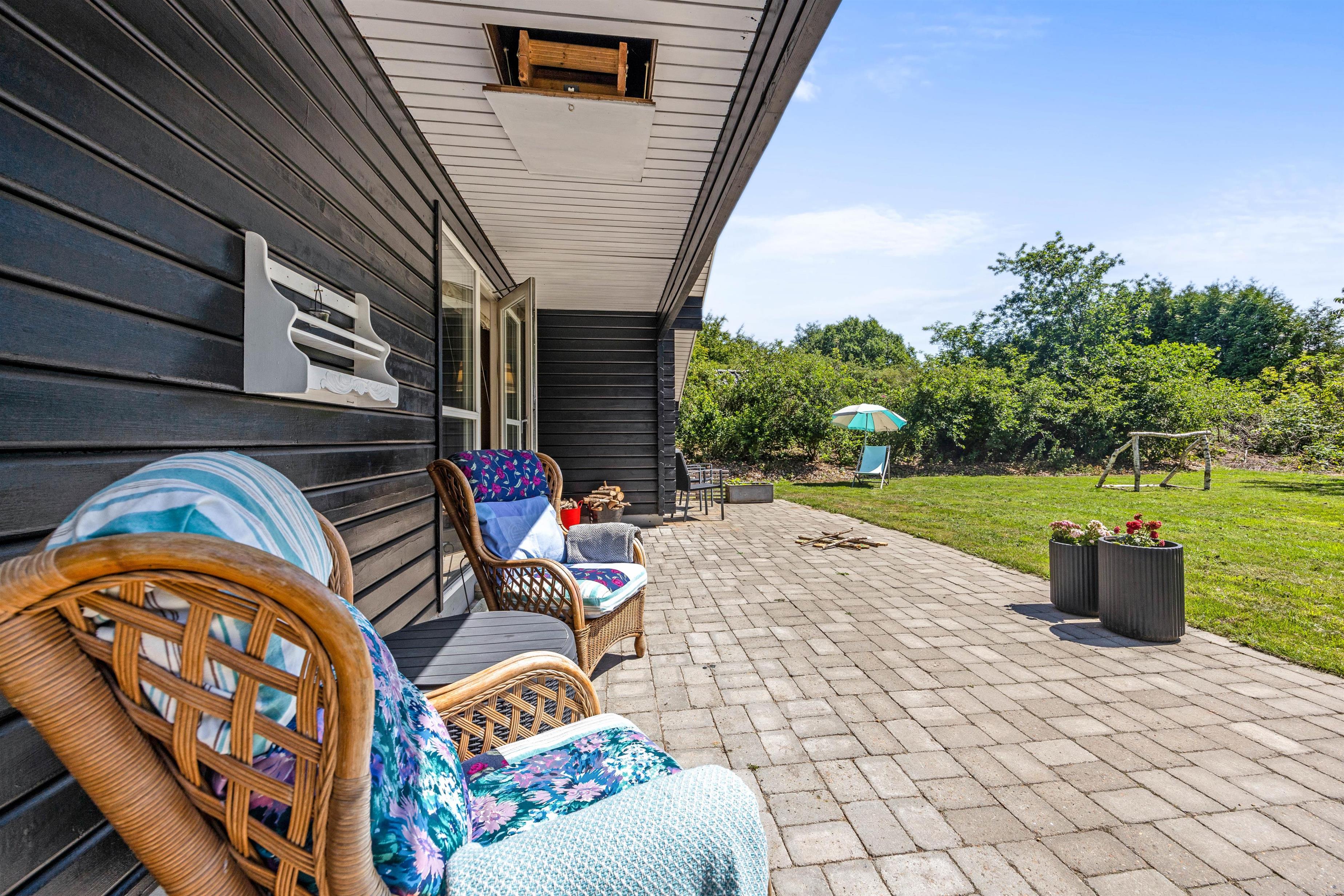 Fra stuen har i udgang til den fine terrasse og have. Her finder I mange hyggelige spots, hvor I kan slå jer ned og nyde morgenkaffen under halvtaget, en god bog eller de lune aftentimer med blik over den fredelige have. På græsplænen kan børnene spille fodbold, samtidig med hunden kan boltre sig løs på den indhegnede grund. Til de yngste venter her sandkasse og rutsjebane, som de helt sikkert vil kunne få glæde af.