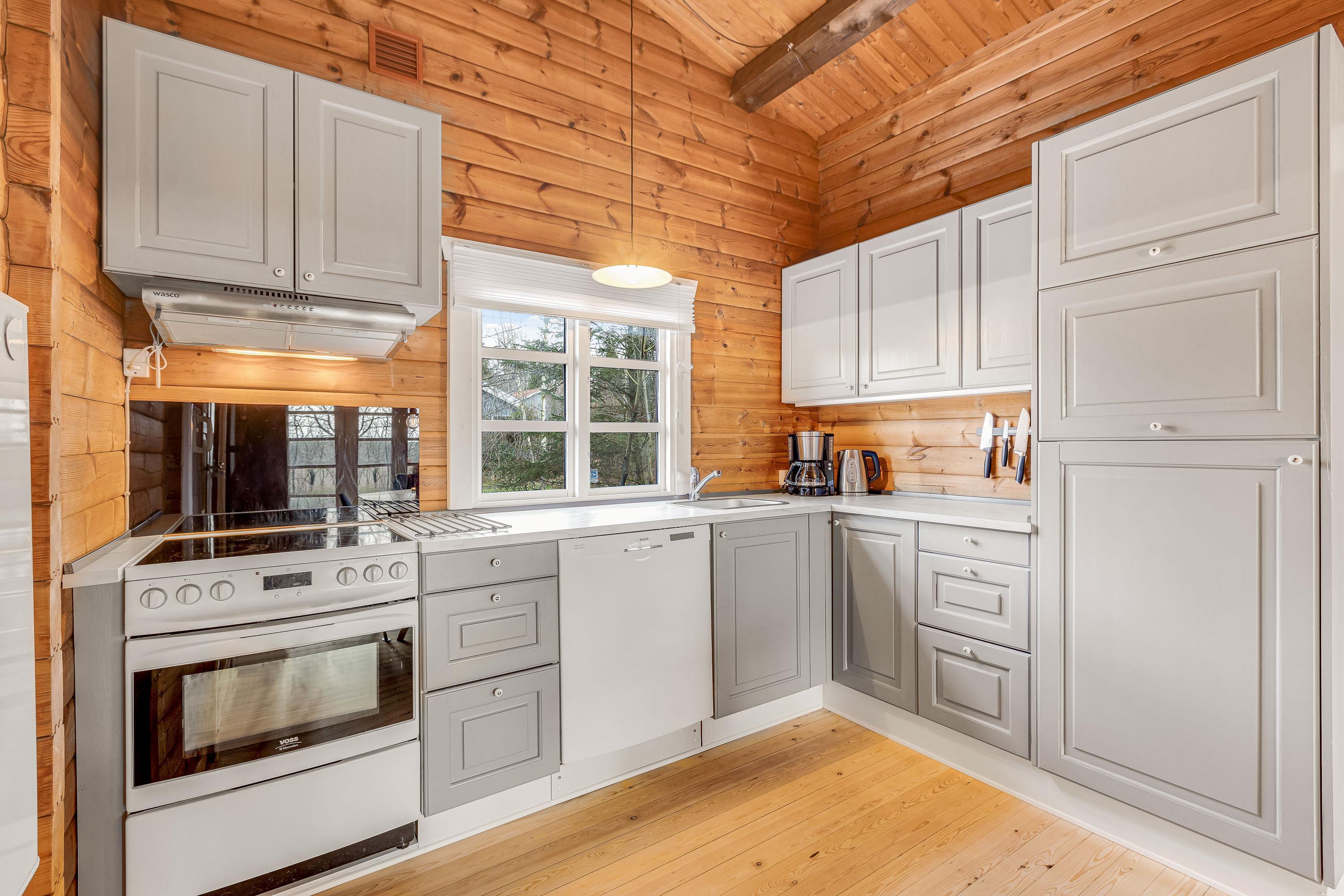 Køkkenet er udstyret med opvaskemaskine, mikroovn og en fryser (60L) og ligger i åben forbindelse med spisestuen og stuen.