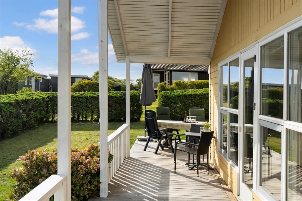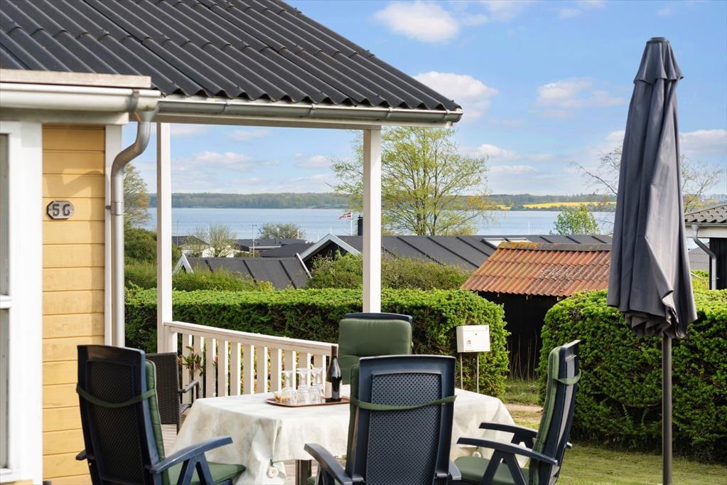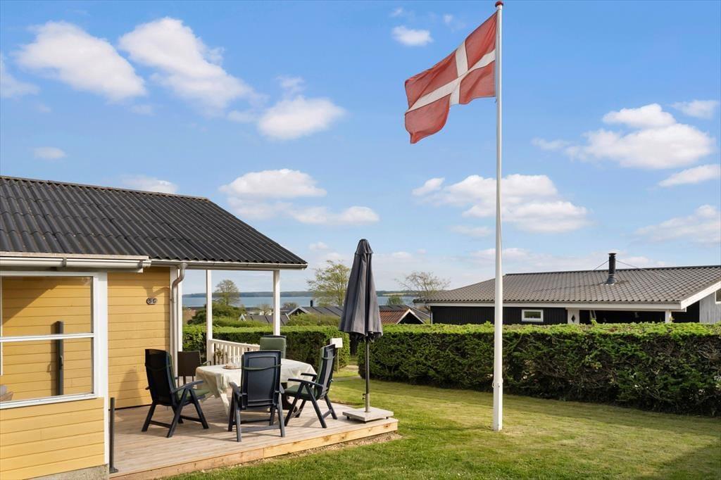 Sommerhuset ligger højt på en grund, hvilket giver en dejlig udsigt over området og mod fjorden. Her finder du flere terrasser med små hyggekroge, så du altid kan finde den perfekte plads – hvad enten du vil nyde morgensolen, spise frokost i læ eller sidde under den overdækkede del, når aftenen falder på. Haven indbyder til leg og afslapning, og beliggenheden for enden af en rolig vej skaber trygge rammer for både børn og voksne. Den korte afstand til legepladsen gør det ekstra nemt for børnene at få nye oplevelser, mens de voksne kan nyde en stille stund på terrassen med udsigten som selskab.