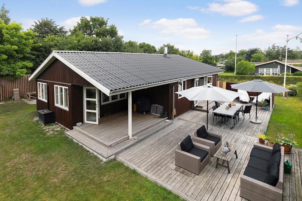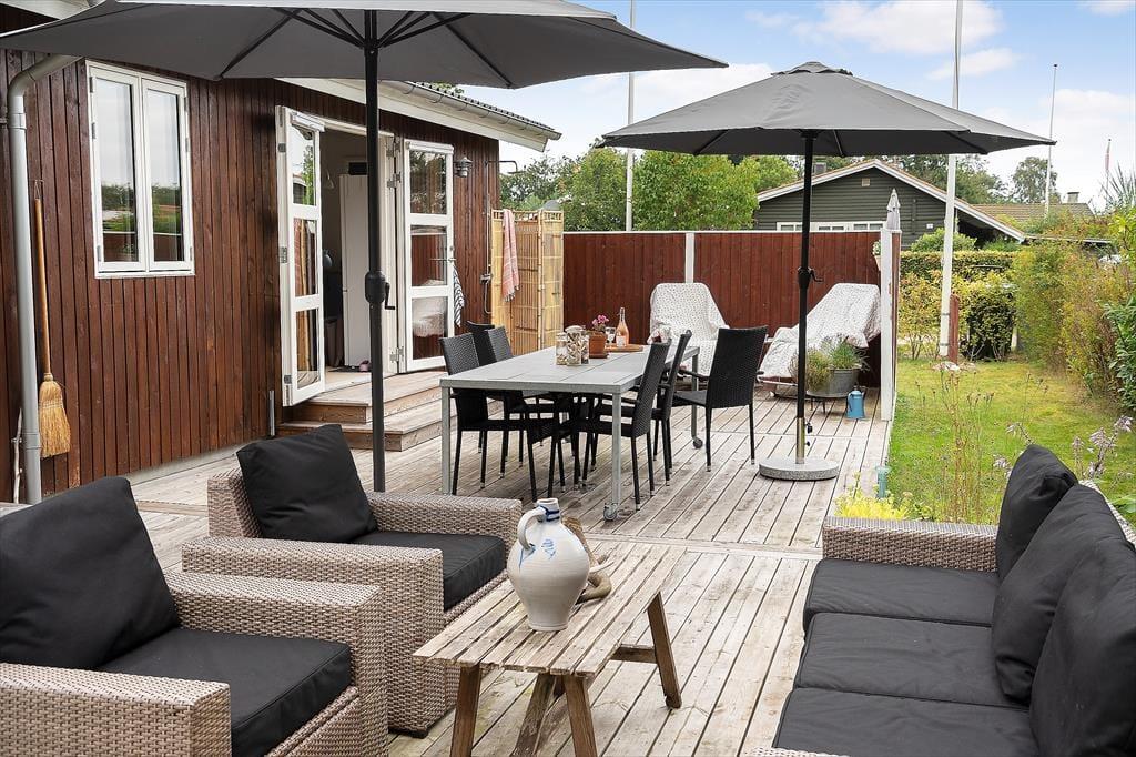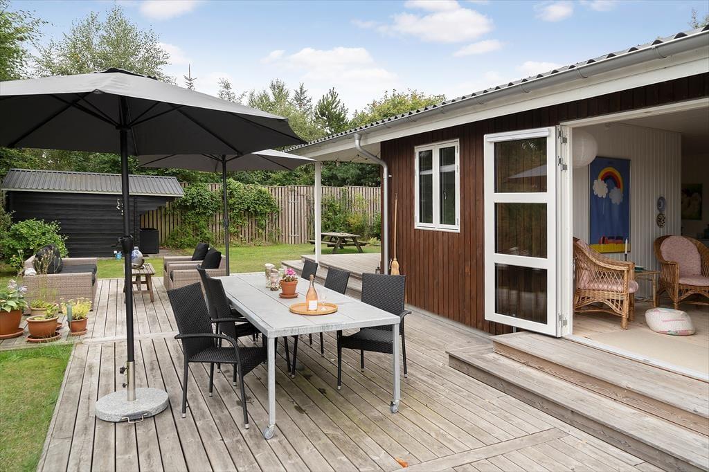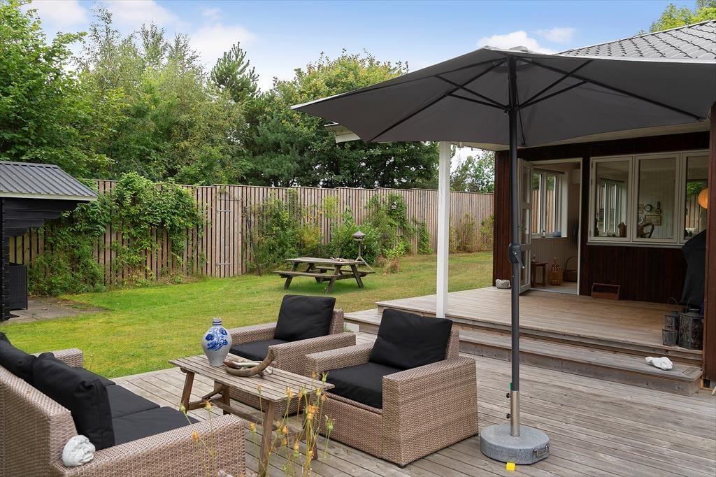 Sommerhuset er omgivet af flere solrige træterrasser, hvor I kan nyde sommeren i havemøblerne eller slappe af i liggestolene under parasollen. Om aftenen kan grillen tændes, og I kan nyde feriestemningen under den overdækkede terrasse – måske med et glas vin, mens solen går ned.