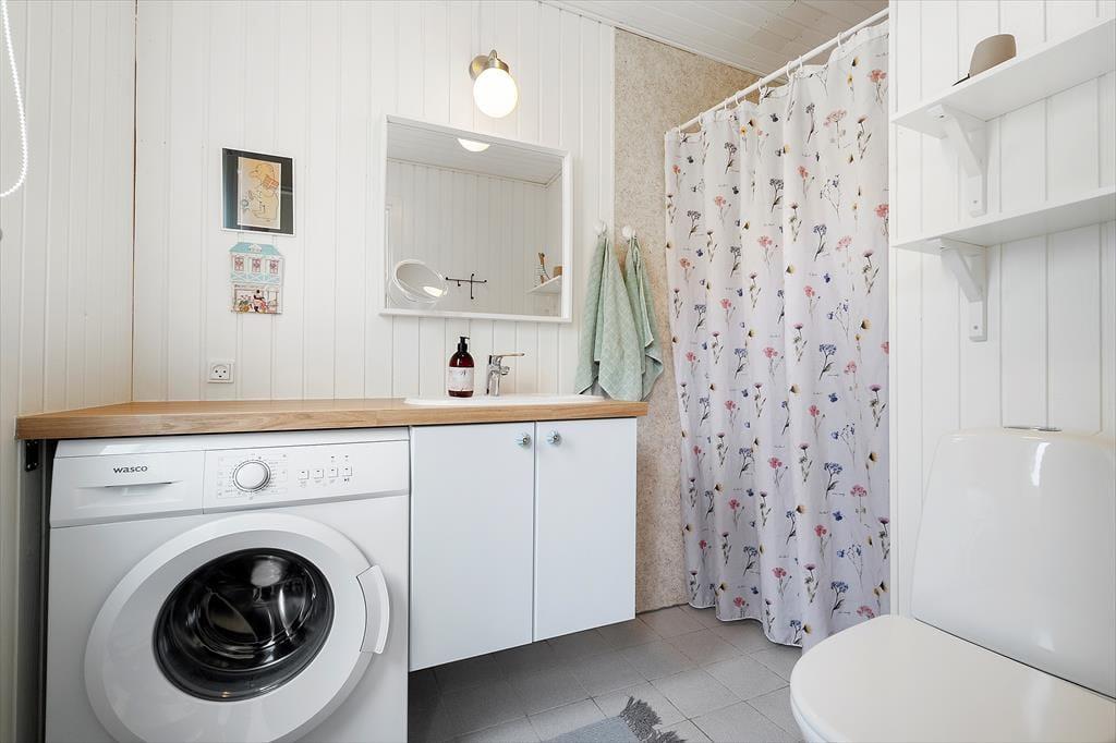 I husets hjerte finder I den store stue med åbent køkken – et naturligt samlingspunkt med brændeovn til de kølige aftener og direkte udgang til den hyggelige terrasse. Her kan I samles til brætspil, feriemiddage og lange snakke. Fra både køkkenet og udestuen er der adgang til haven og den dejlige, delvist overdækkede terrasse. Badeværelset er lyst og funktionelt indrettet med bruseniche og vaskemaskine.