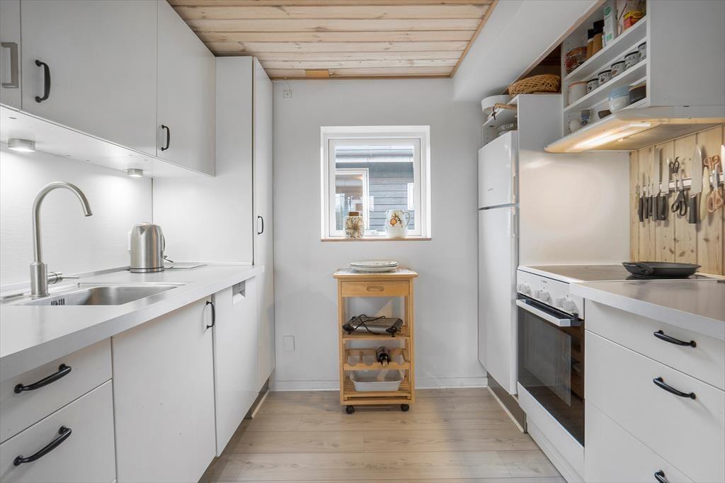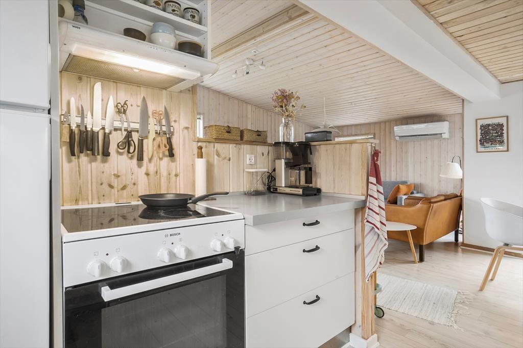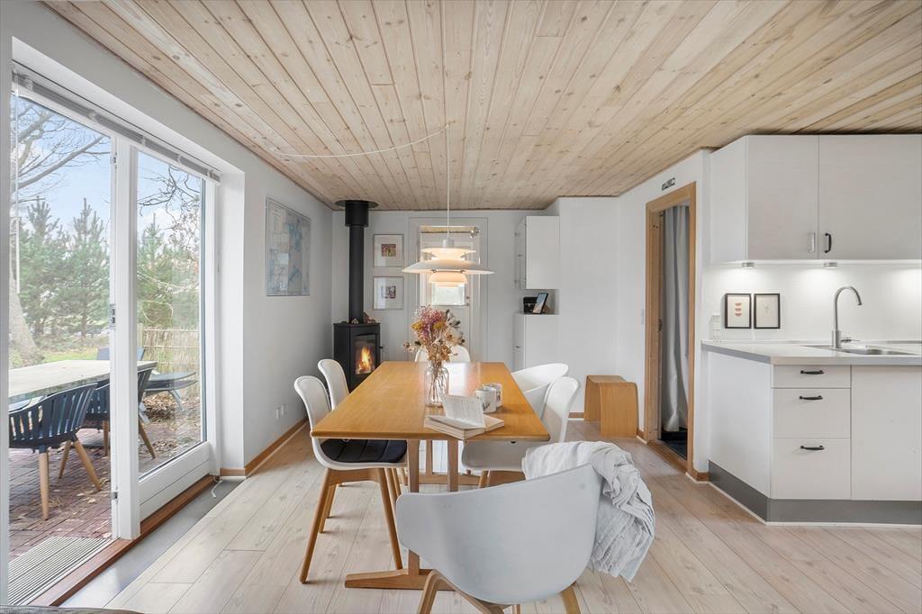 Stuen og køkkenet er husets samlingsrum, og det åbne køkken gør det muligt at forberede aftensmaden, mens du stadig kan tale om dagens oplevelser med dem, der sidder i stuen. Køkkenet er et funktionelt sommerhuskøkken, hvor du kan kigge ud på omgivelserne og har alle nødvendige køkkenfaciliteter ved hånden. Spisebordet er i forlængelse af køkkenet, og her er der plads til, at I alle kan spise sammen eller spille et spil. Ved siden af spisebordet og stuen er en havedør ud til en terrasse, så det er også dejligt at tage måltiderne med udenfor og nyde udsigten til haven.