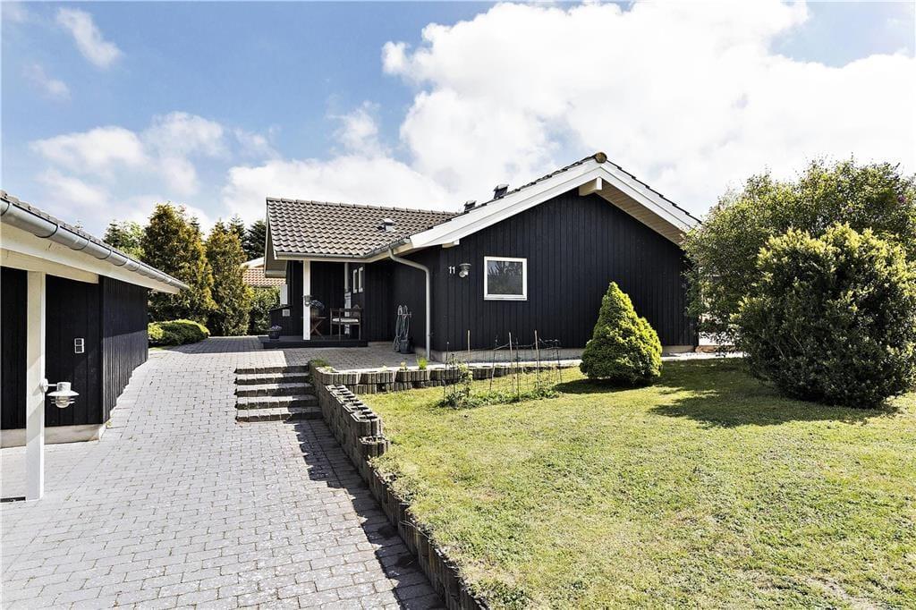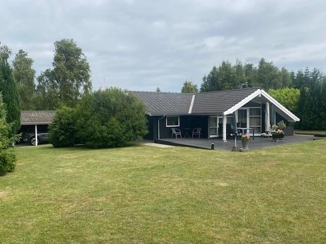 Den store græsplæne indbyder til en rask lille omgang fodbold eller badminton eller kroket. Her er gyngestativ og sandkasse til børnene og plads til at grille. Grunden ligger fint placeret tæt på åbne marker og i et fredeligt sommerhusområde, hvor I ikke har langt til stranden ved Høve Skov. Den overdækkede terrasse, forlænger de kølige sommerafteners udeliv og hygge.