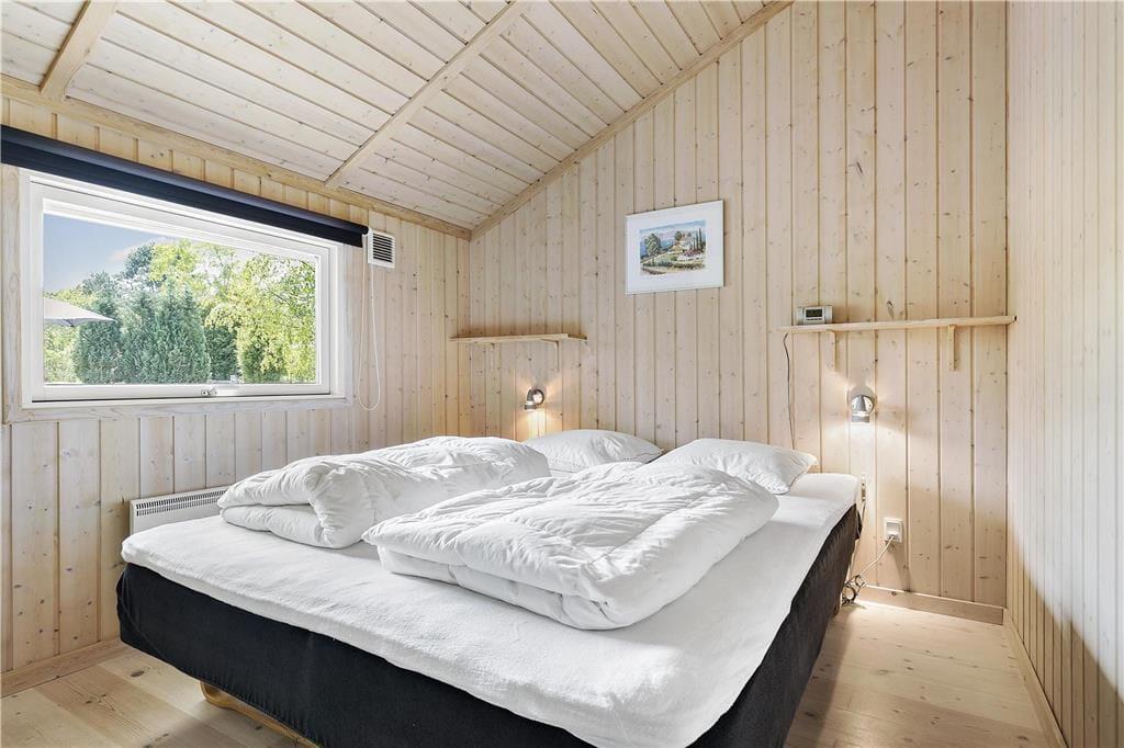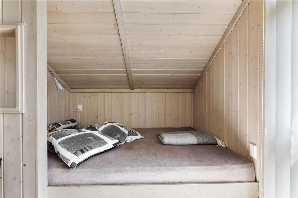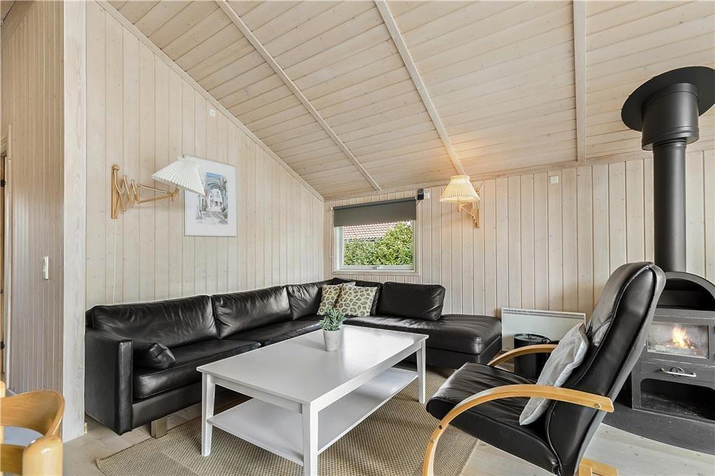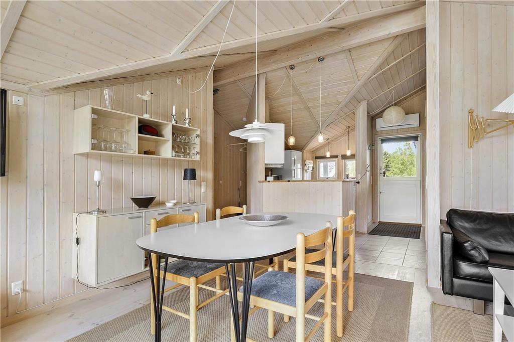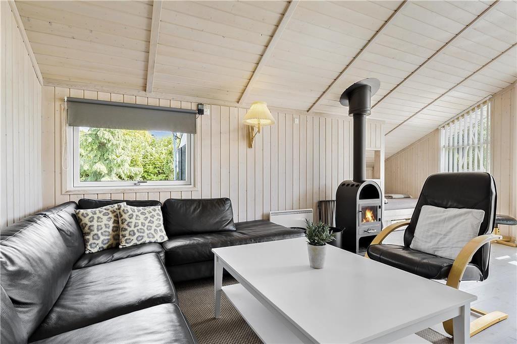 Du vil befinde dig godt i dette lyse sommerhus med loft til kip, som giver en ekstra fornemmelse af rum og plads. I stuen kan du hygge ved brændeovnen med kik til haven gennem terrassevinduerne fra gulv til loft. Find et spil frem, måske 500 eller Canasta eller Ludo, og brug nogle timer på fælles familiehygge her. Fra spisebordet har I også fint udkik i haven og kan tilbringe gode stunder til spisetiderne morgen, middag og aften. Har du eller børnene brug for en lille lur er der plads i den hyggelige alkove i hjørnet af stuen. Huset har en god planløsning som gør at det virker meget rummeligt.