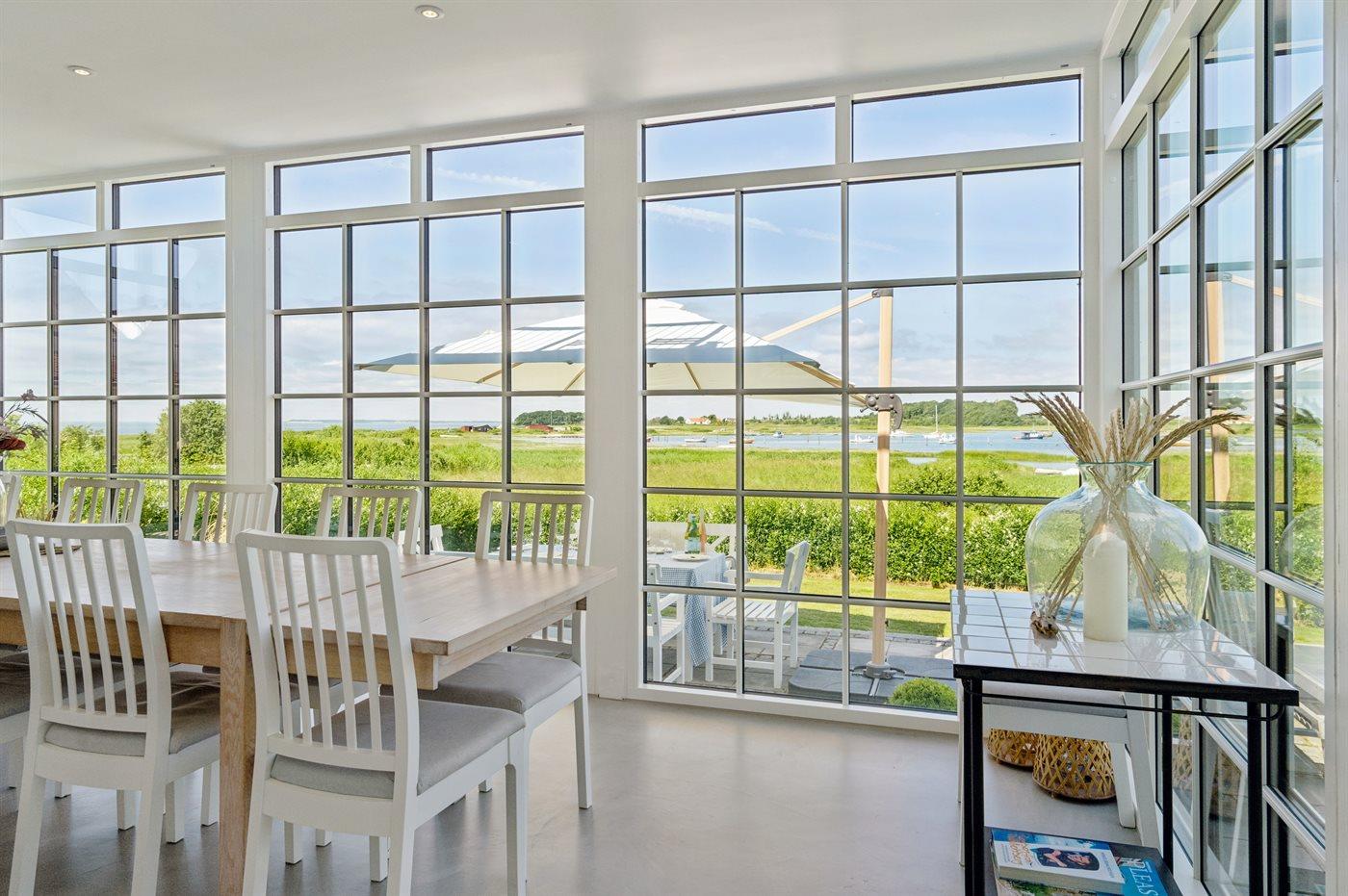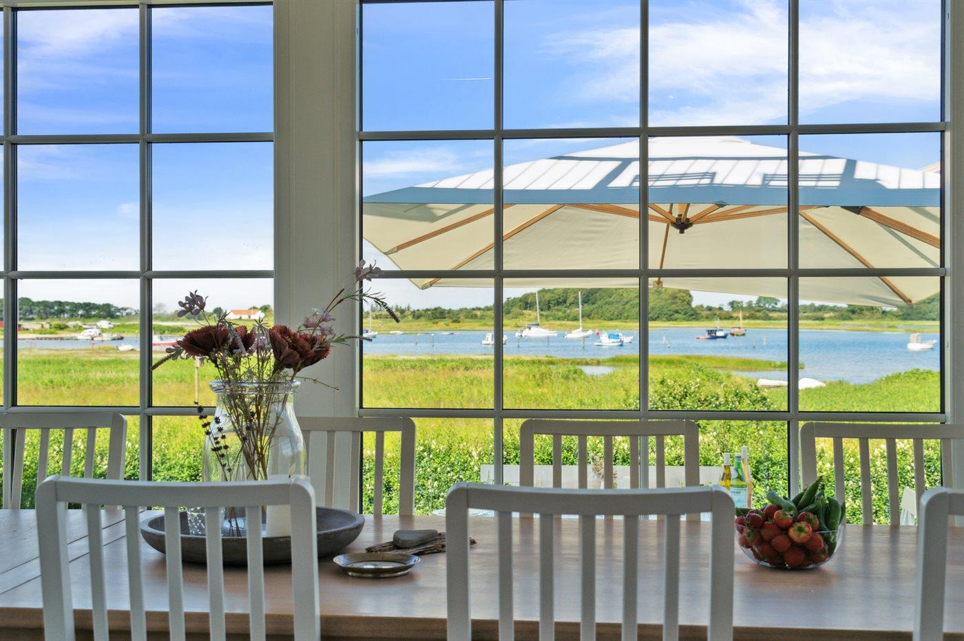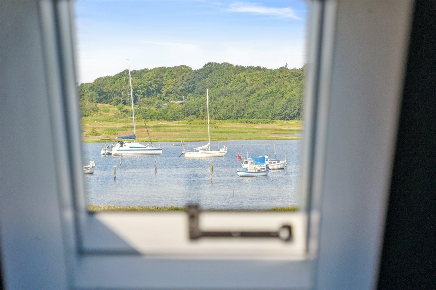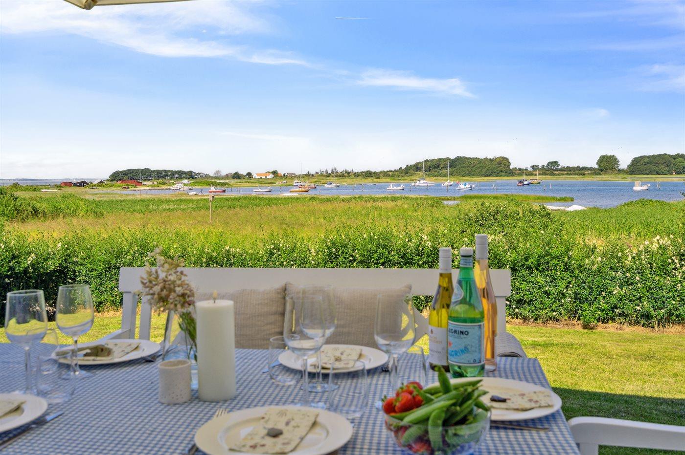 Sommerhuset ligger i første række til vandet og har udsigt til både vand, natur og solnedgang fra både huset, den lækre tagterrasse på 1. salen og fra haven. Bag huset er der en hyggelig gårdhave med morgensol. Huset er i 2020 totalt renoveret med lækre materialer og er flot indrettet og godt udstyret.