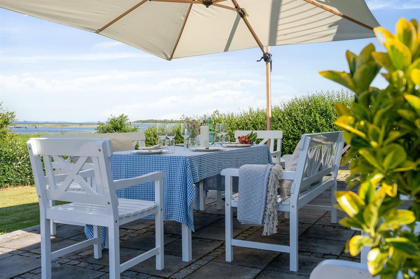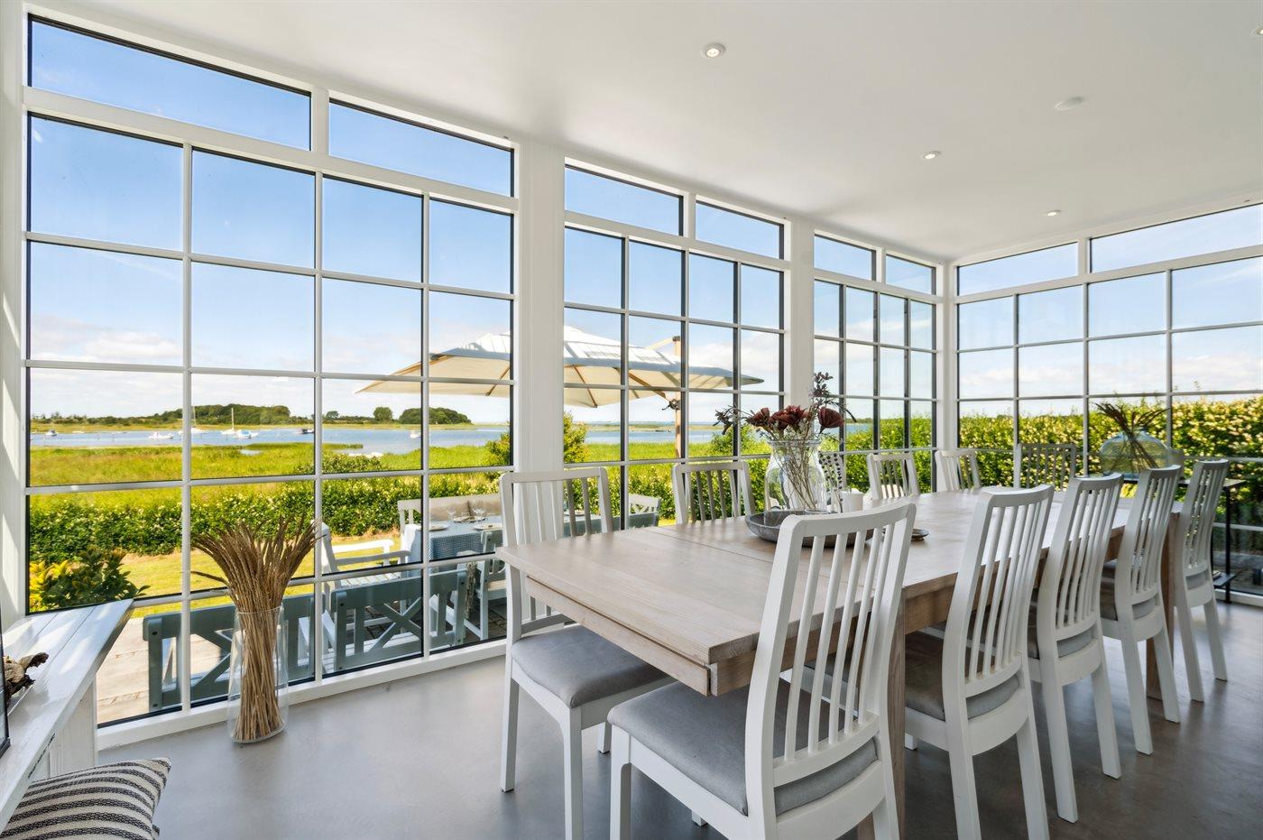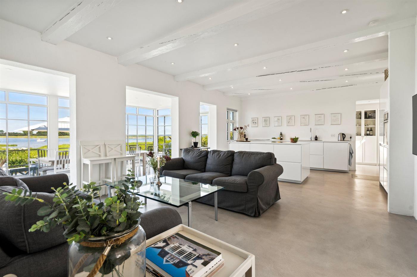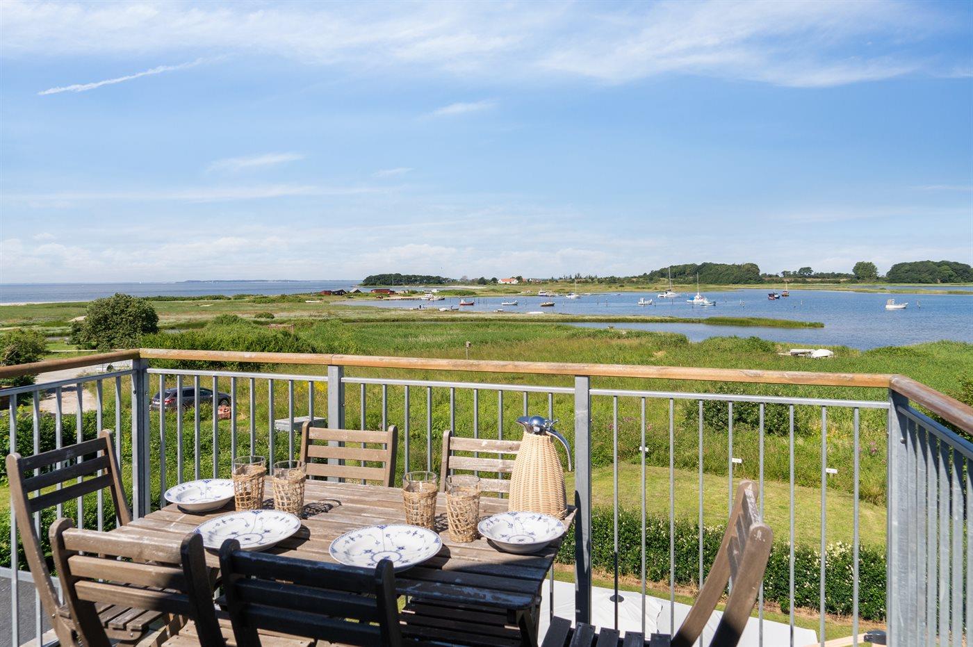 Sommerhuset ligger i første række til vandet og har udsigt til både vand, natur og solnedgang fra både huset, den lækre tagterrasse på 1. salen og fra haven. Bag huset er der en hyggelig gårdhave med morgensol. Huset er i 2020 totalt renoveret med lækre materialer og er flot indrettet og godt udstyret.