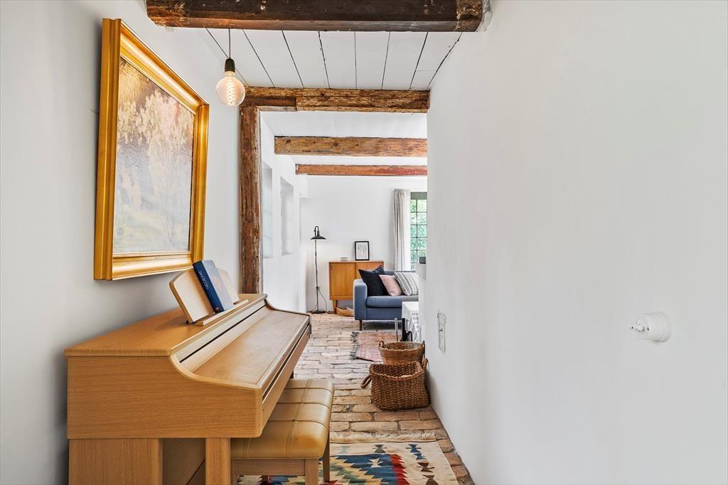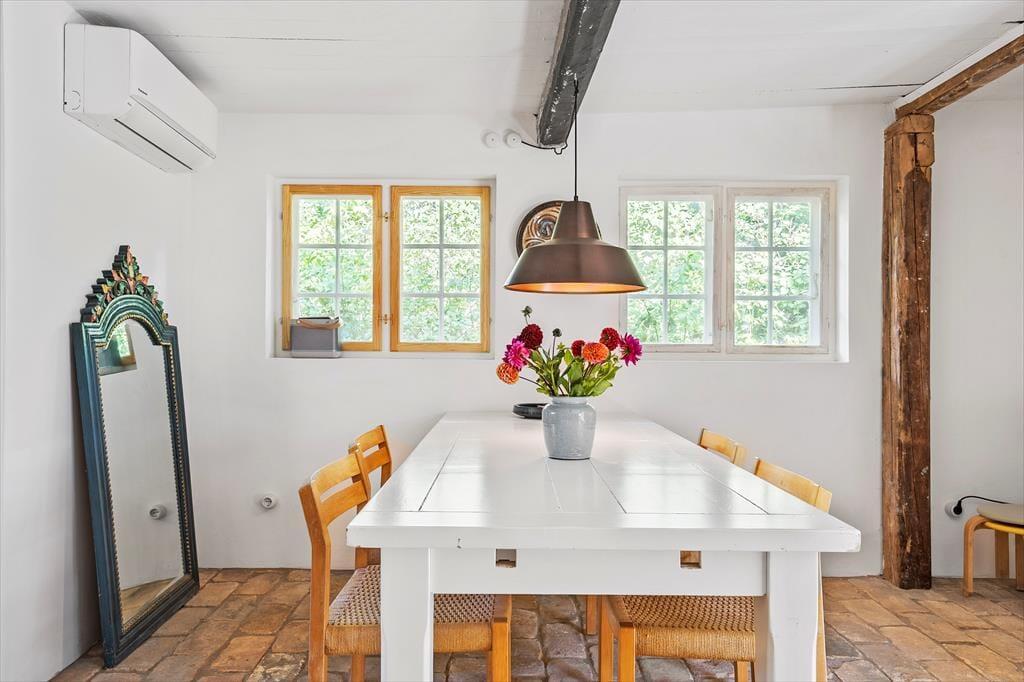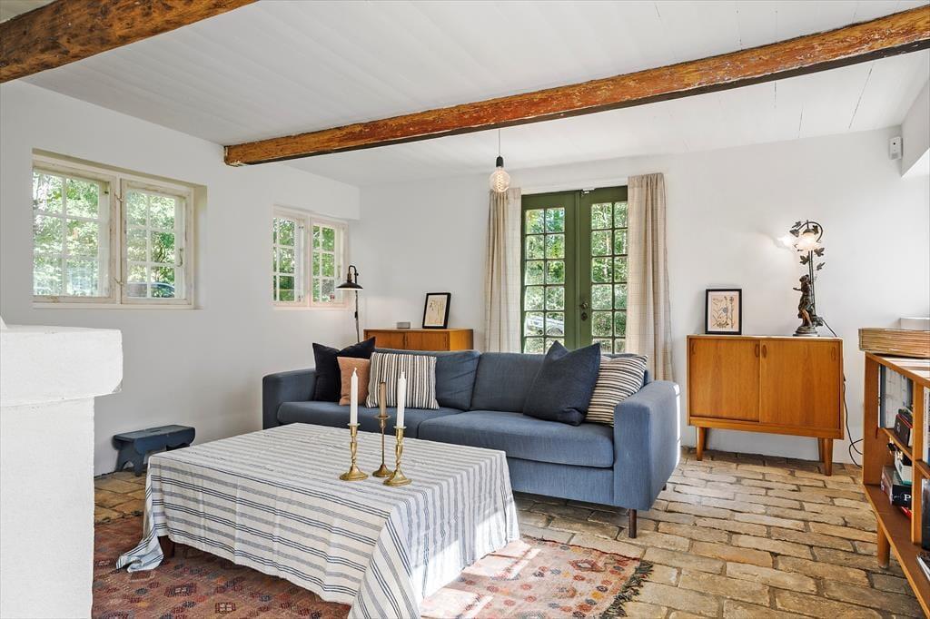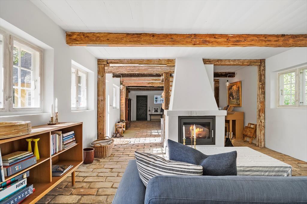 Når du træder indenfor i dette stemningsfulde sommerhus, mødes du af et hyggeligt opholdsrum med rustikke fliser på gulvet og en pejs, der spreder varme og hygge på kølige aftener. Stuen er indrettet med komfortable møbler og skaber et samlingspunkt for familien, hvor brætspil og gode samtaler kan nydes.