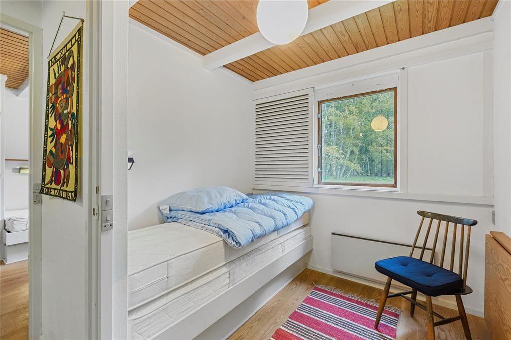 Sommerhuset har tre værelser, der giver mulighed for både hvile og arbejdsro. Det største soveværelse har to indbyggede enkeltsenge, mens de to andre værelser har henholdsvis en enkeltseng med arbejdsplads og en enkeltseng, der kan slås ud som en sovesofa for ekstra soveplads. Badeværelsesfaciliteterne består af et separat toilet og et separat bad, begge placeret side om side.