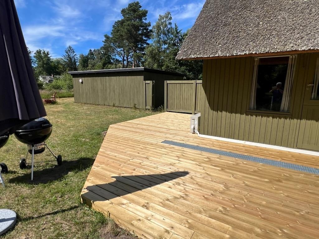 Foran huset findes en overdækket terrasse, hvor du kan sidde i ly og nyde de skiftende årstider. Området er perfekt til en afslappet ferie væk fra hverdagens stress – her er ingen forstyrrelser, kun ren natur og fred.