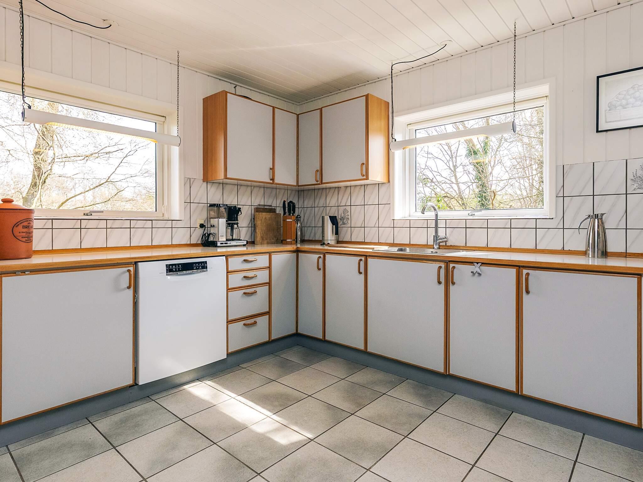 Køkken: Høj stol, el-komfur, køle-frys, mikroovn, kaffemaskine, opvaskemask.