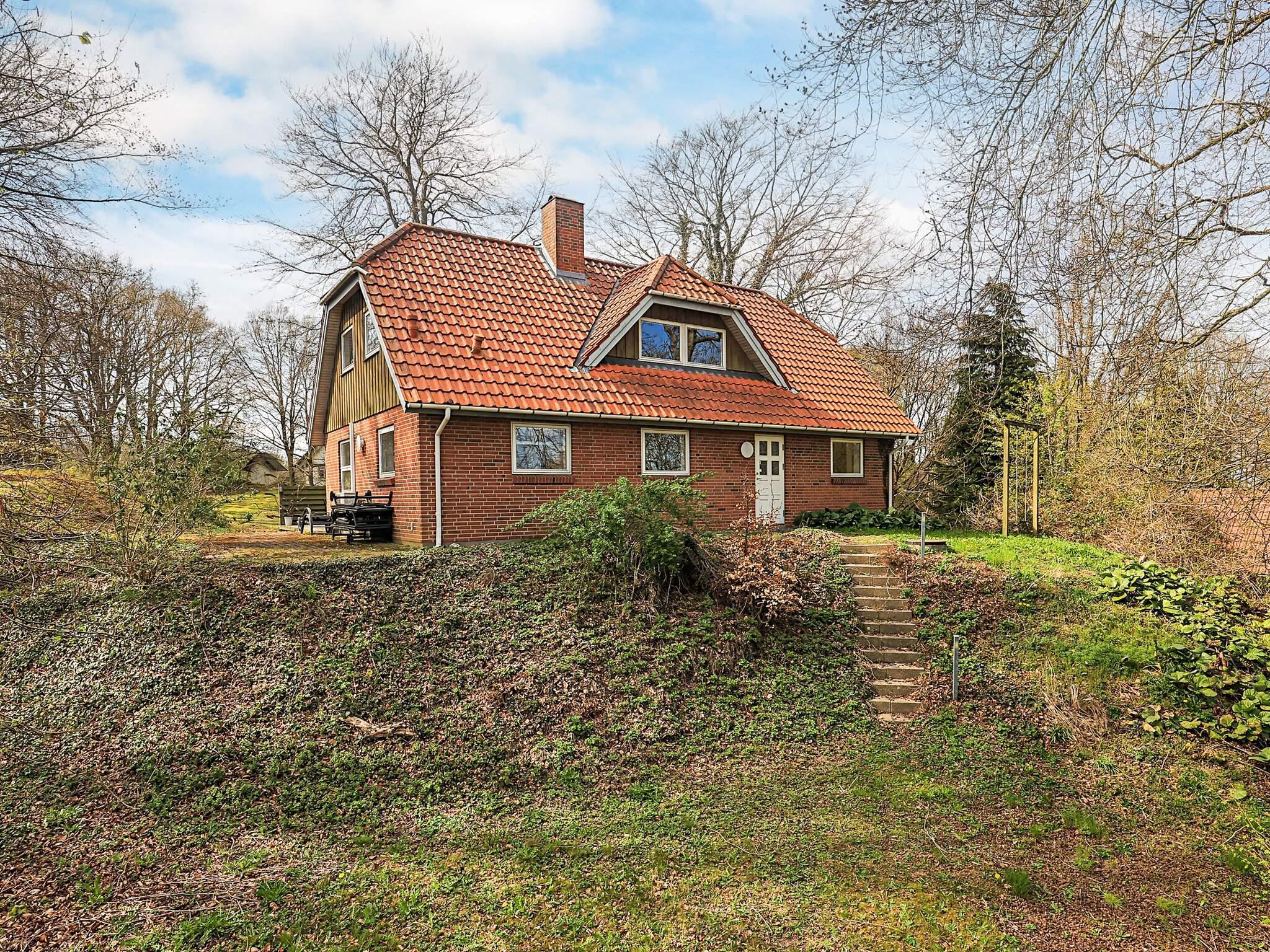 Huset er unikt placeret på en bakketop, tilgængelig via trapper fra begge sider, og omgivet af en stor naturgrund med beplantning. Kun en kort gåtur væk ligger den børnevenlige Båring Strand med fint sand og en badebro – ideelt til dage fyldt med sol og hav.
