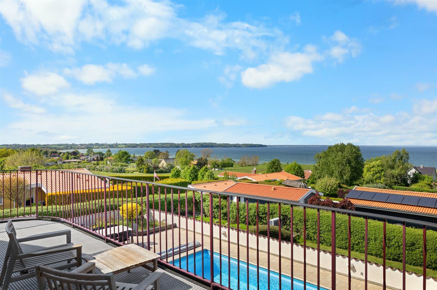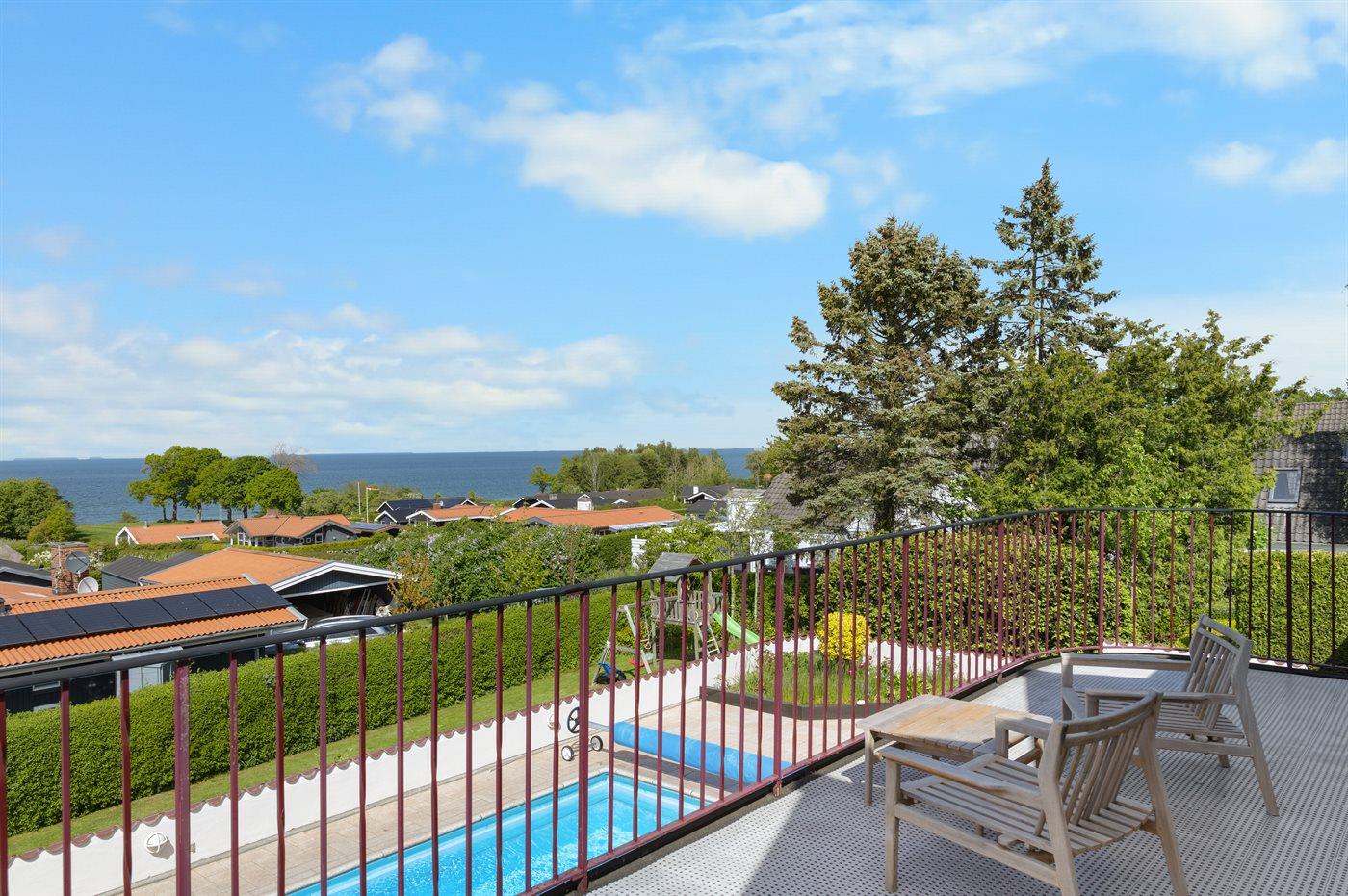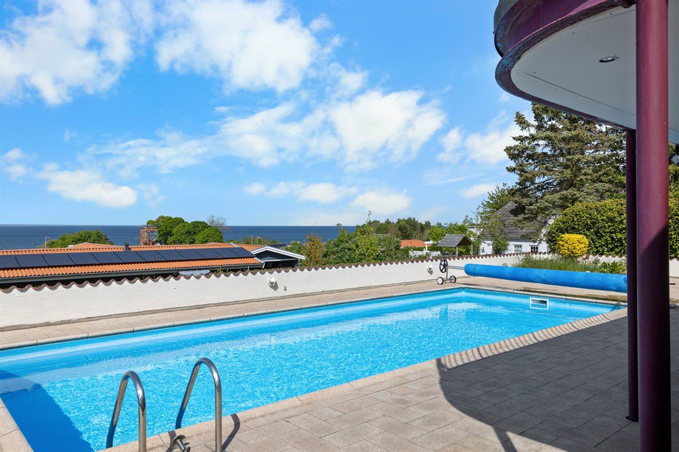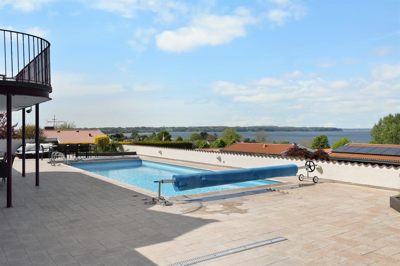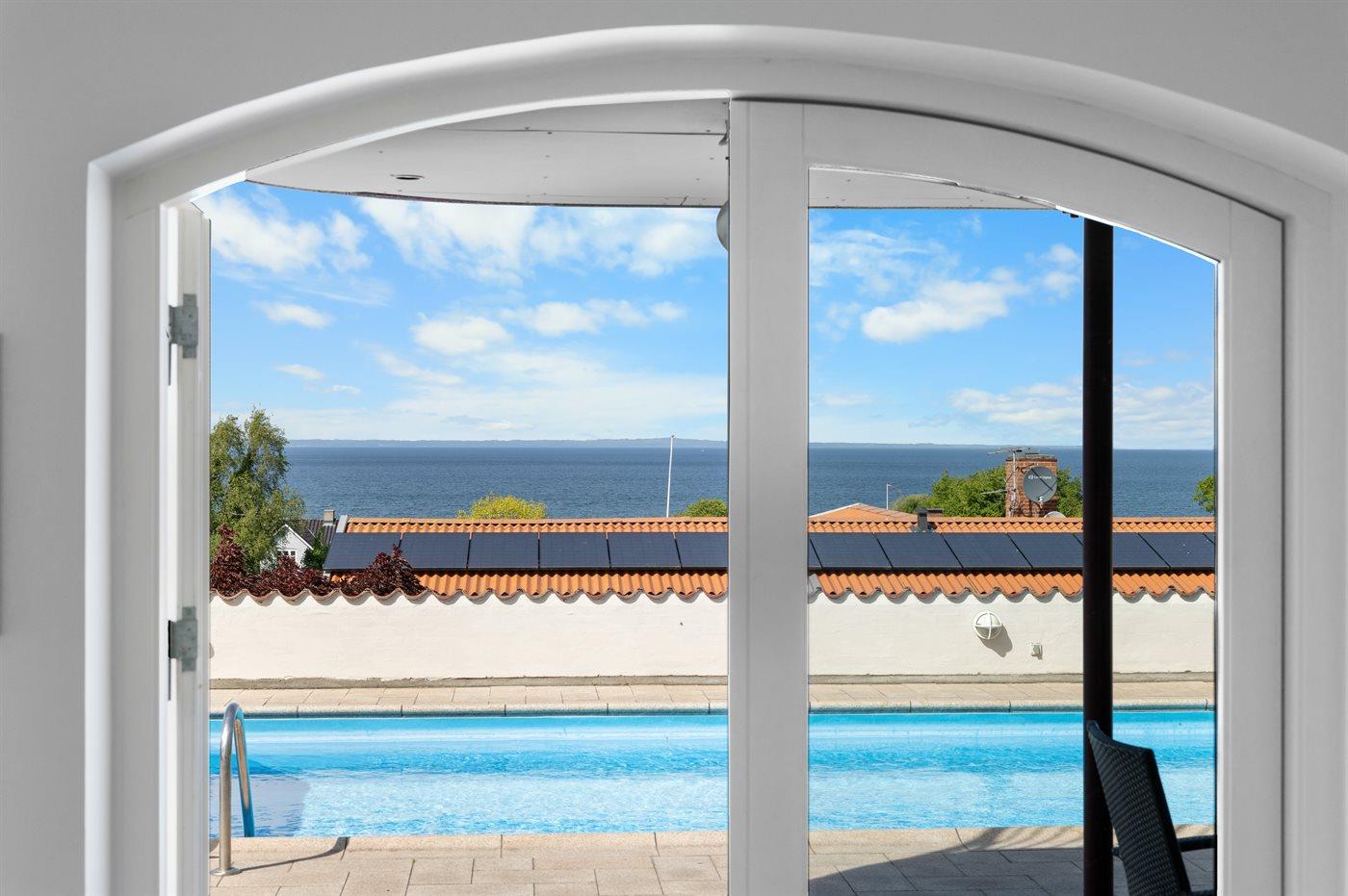 Den store udendørs pool ligger centralt på terrassen og er åben i hele udlejningsperioden. Fra både huset, terrassen og balkonen er der en flot udsigt ud over vandet helt til Jylland og Vejle Fjord. Fra huset er der via vejen kort afstand ned til stranden, hvor der i sommerhalvåret er badebro.