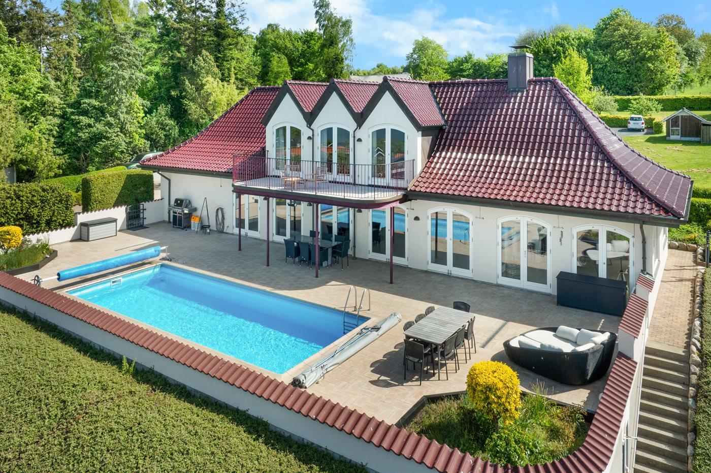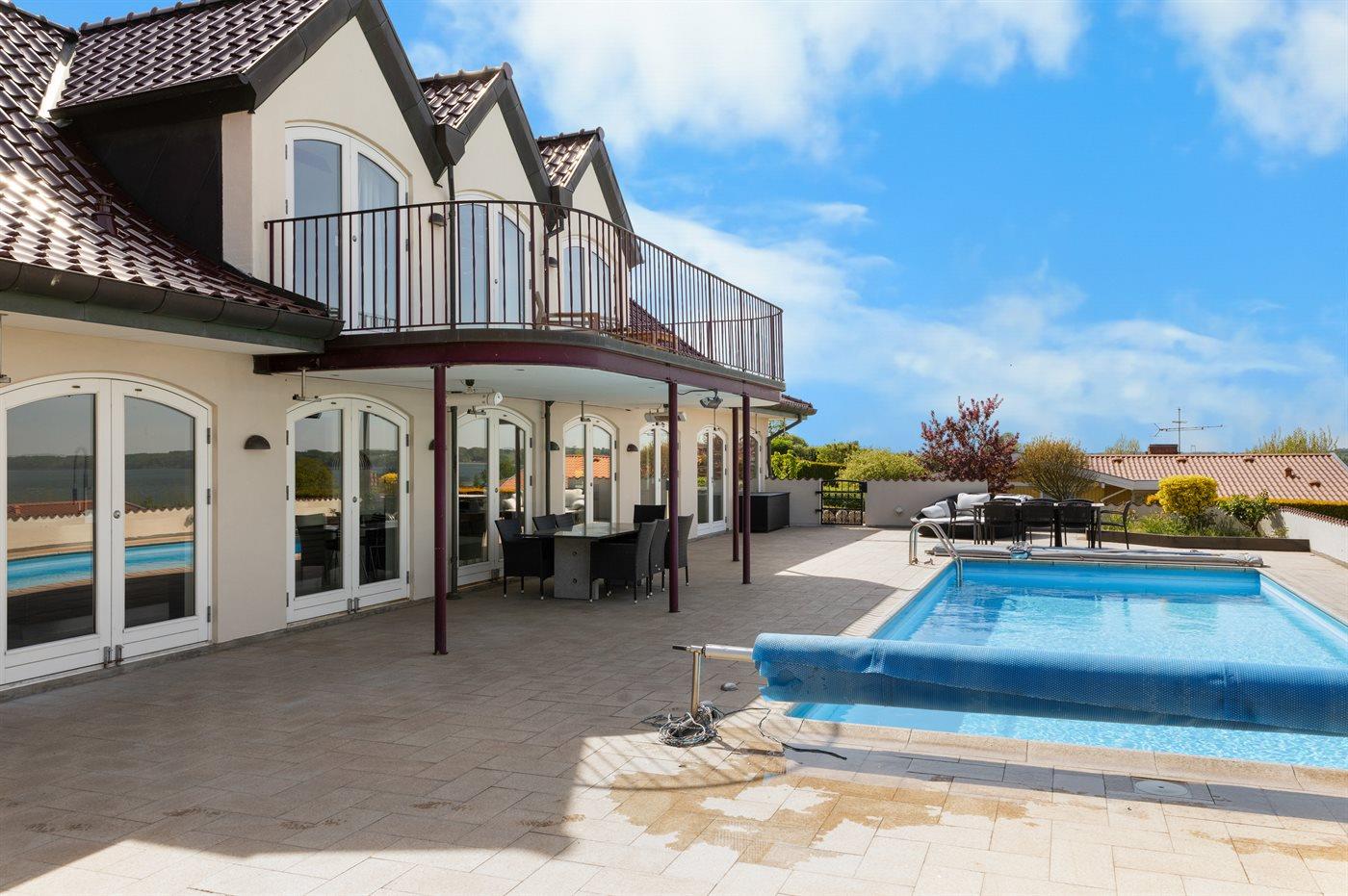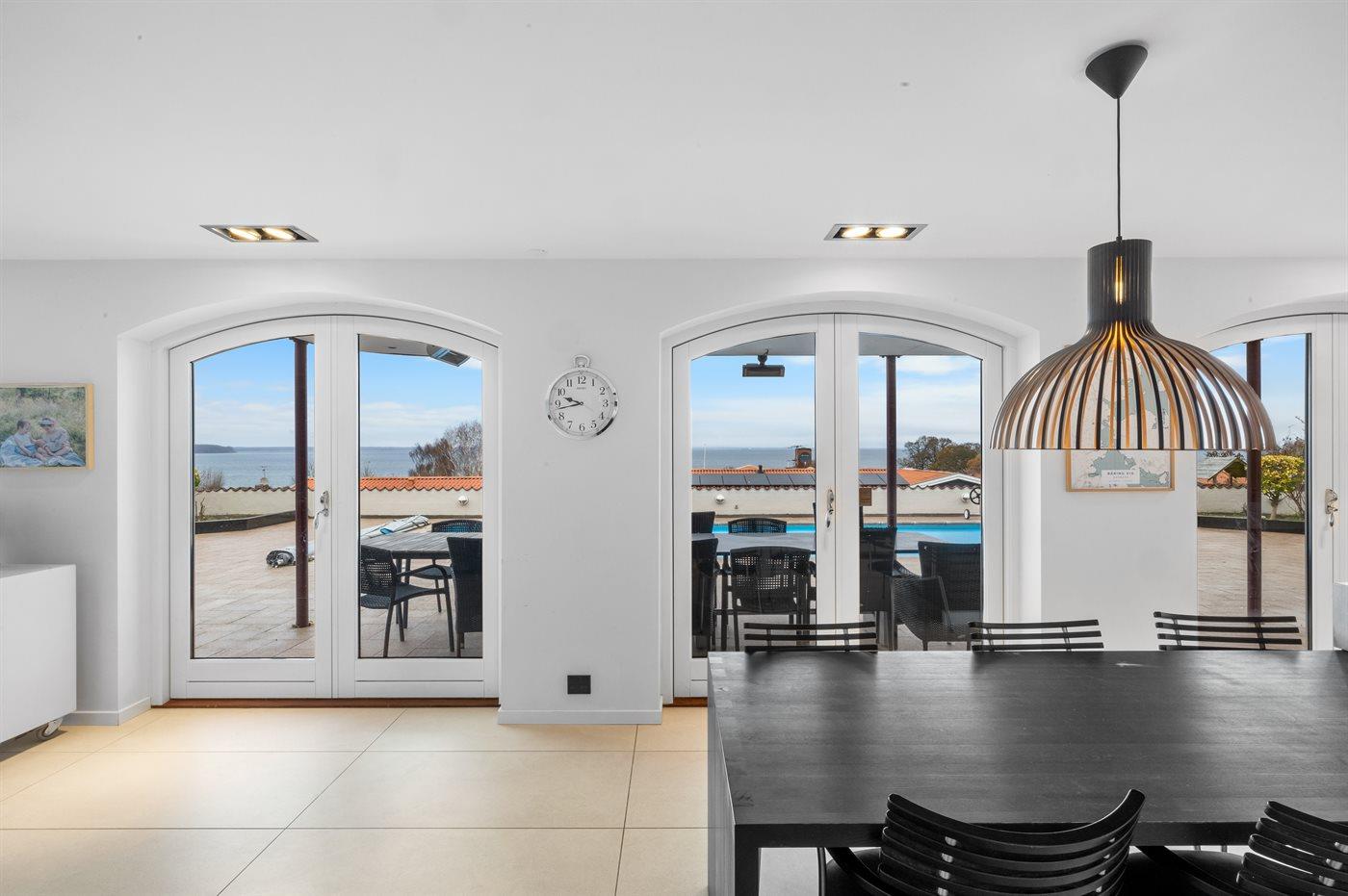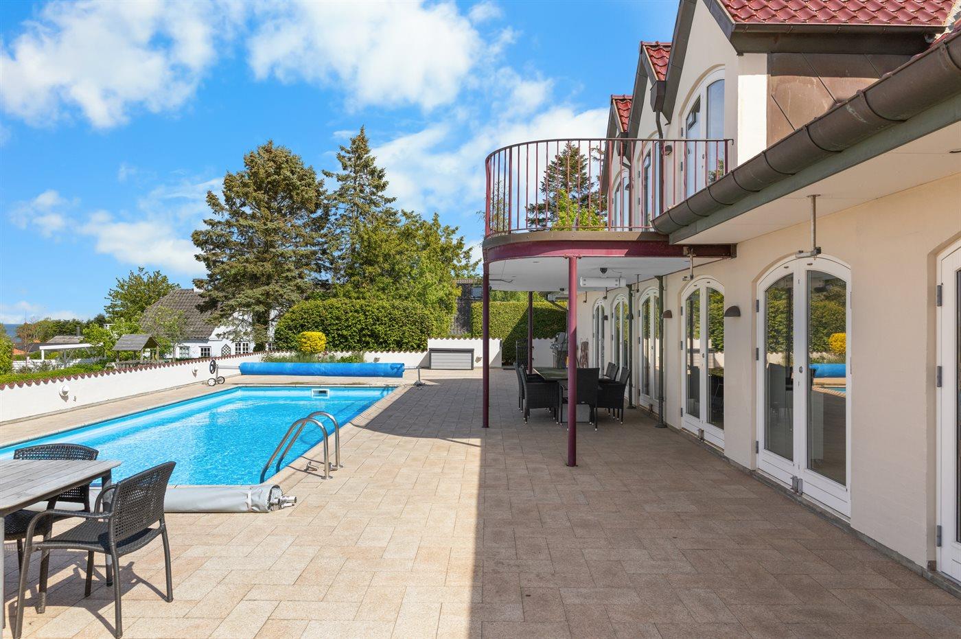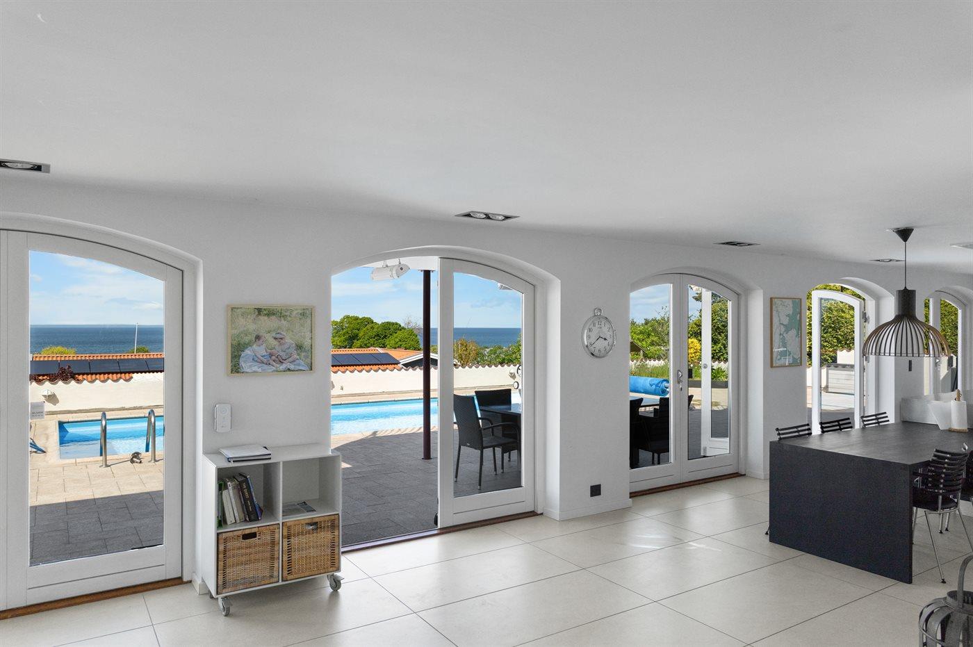 Den store udendørs pool ligger centralt på terrassen og er åben i hele udlejningsperioden. Fra både huset, terrassen og balkonen er der en flot udsigt ud over vandet helt til Jylland og Vejle Fjord. Fra huset er der via vejen kort afstand ned til stranden, hvor der i sommerhalvåret er badebro.