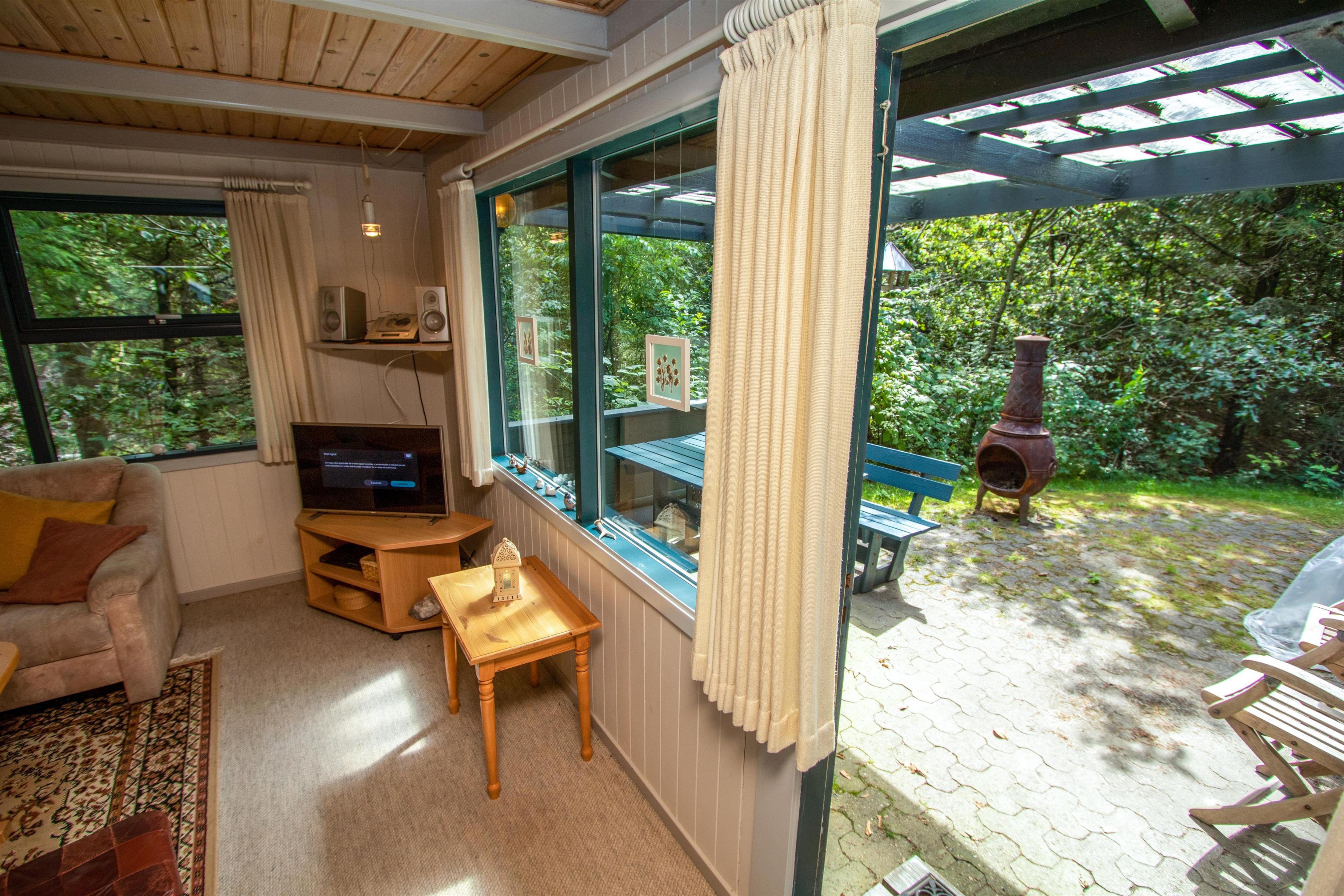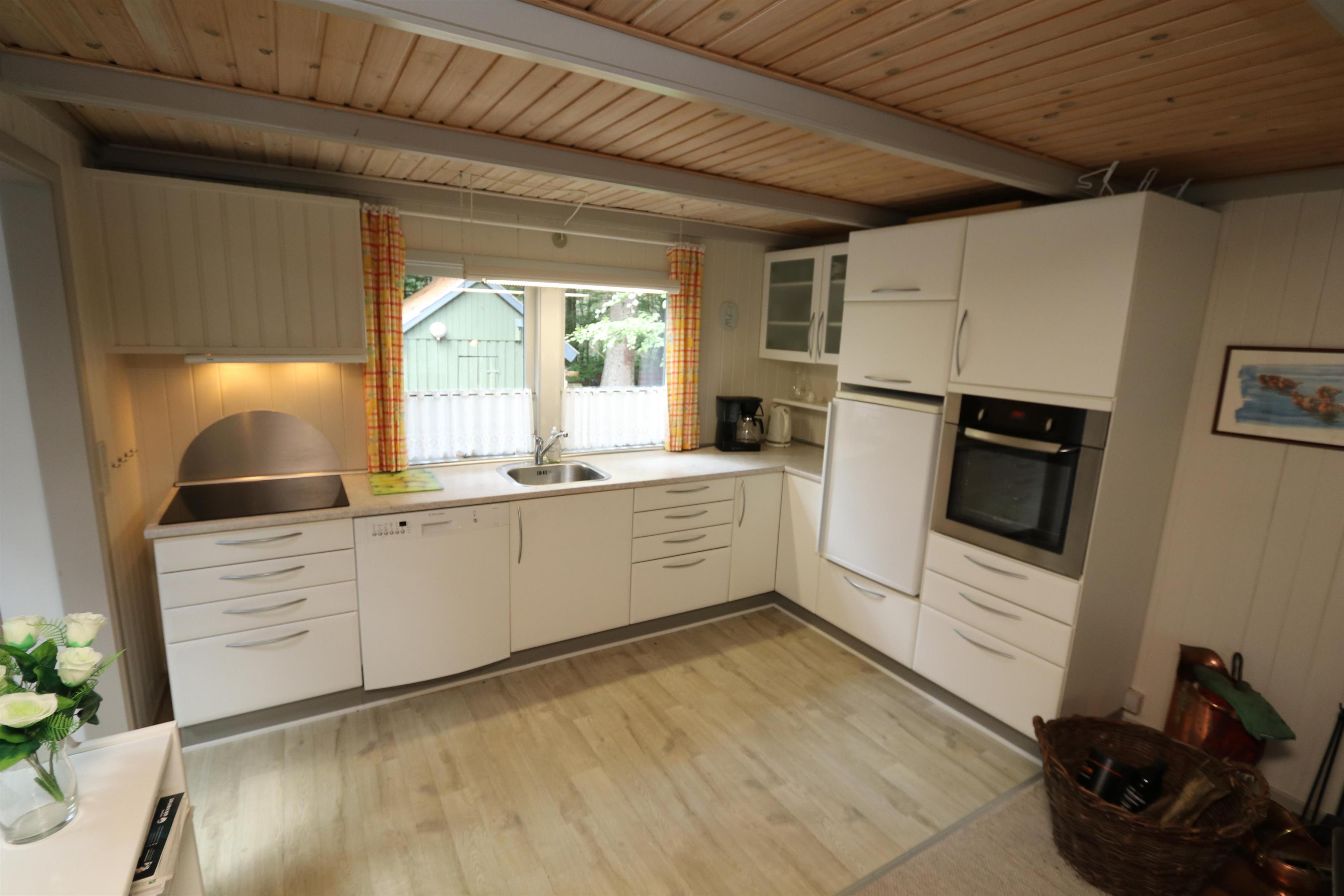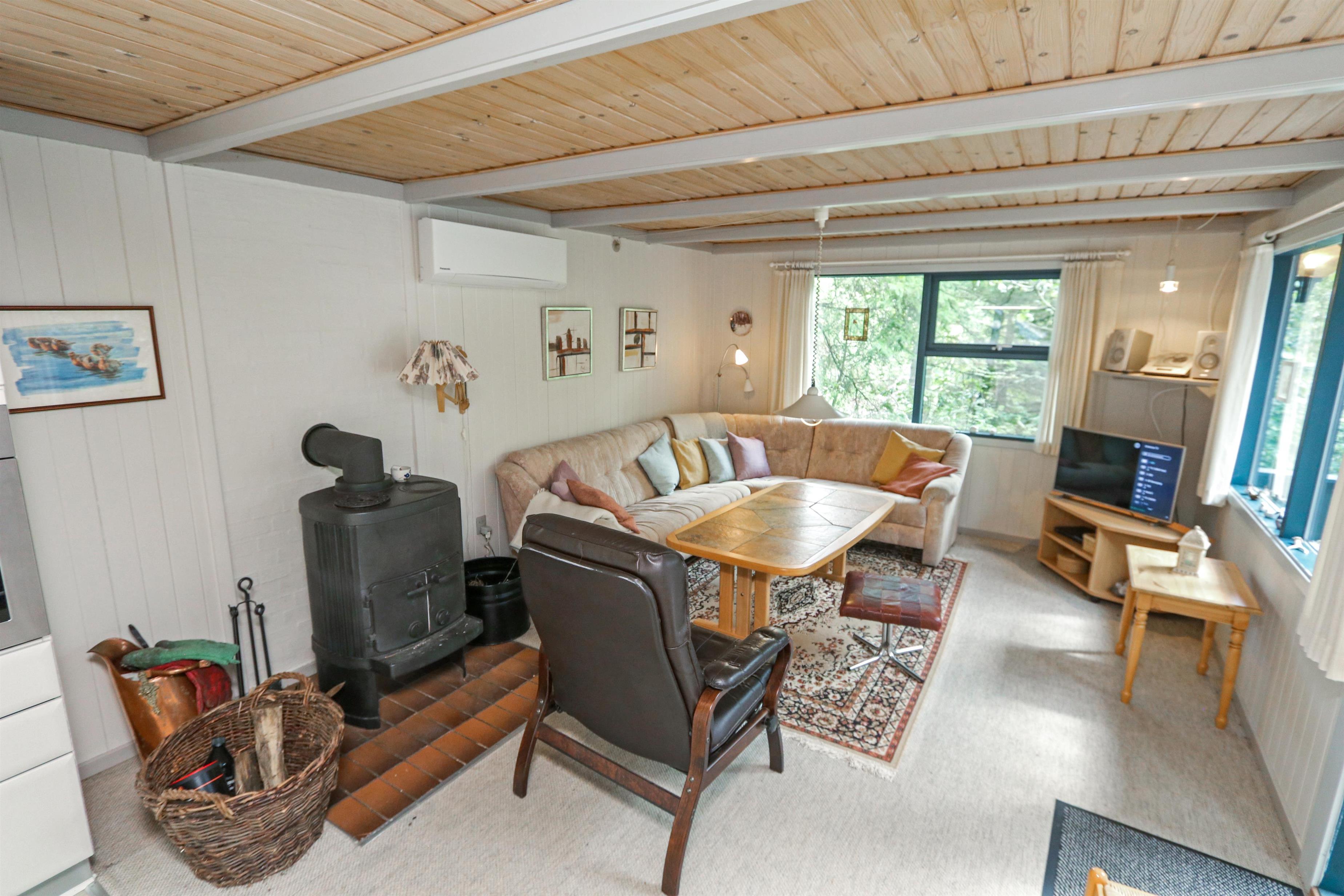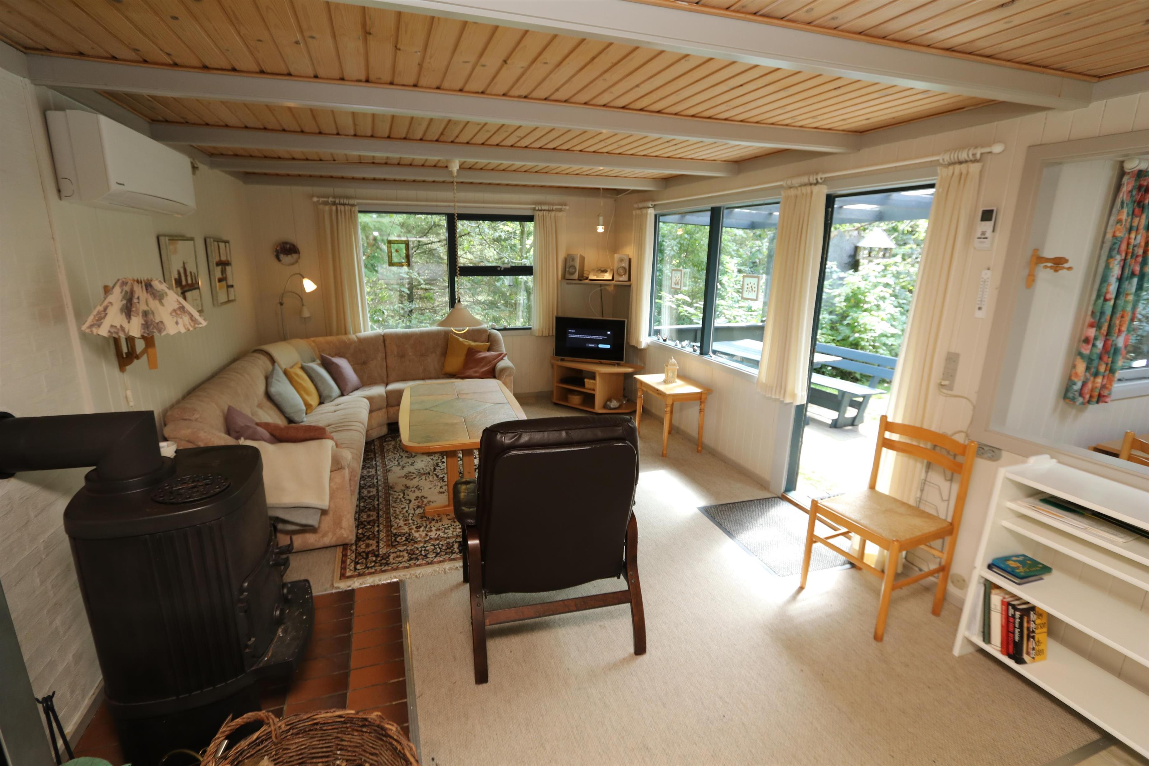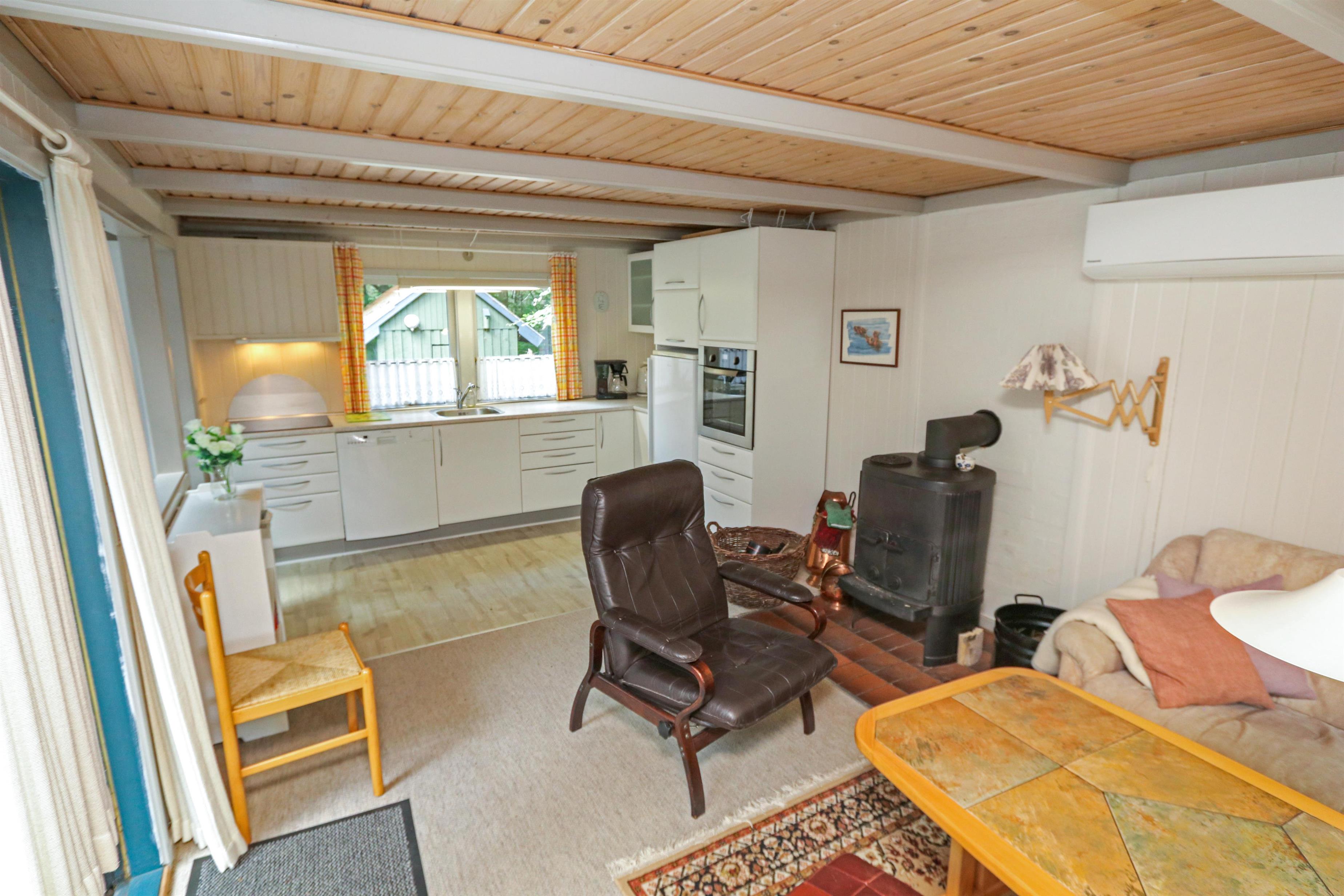 Hyggeligt, overskuelige feriehus på ca. 56 m2. Der er kombineret køkkenhjørne og opholdsstue. I det nyere køkkenhjørne er der keramiske kogeplader, indbygningsovn, mikroovn, emhætte, køleskab med lille fryseboks og opvaskemaskine. Tæt ved køkkenet står spisebordet med plads til 4 personer. Opholdsstue med polstermøbler, TV med danske kanaler, mulighed for streaming via Chromecast samt Radio- og CD-afspiller. Brændeovn sørger med varmepumpen for at reducere udgiften til varmeregningen. 2 soverum (1DS, 1DS). Lille badeværelse med toilet, bruser og håndvask. Ikke-rygerhus. Max 1 husdyr tilladt. Uden internet.