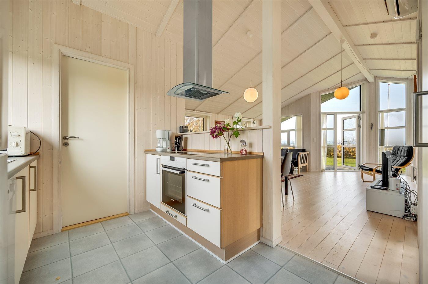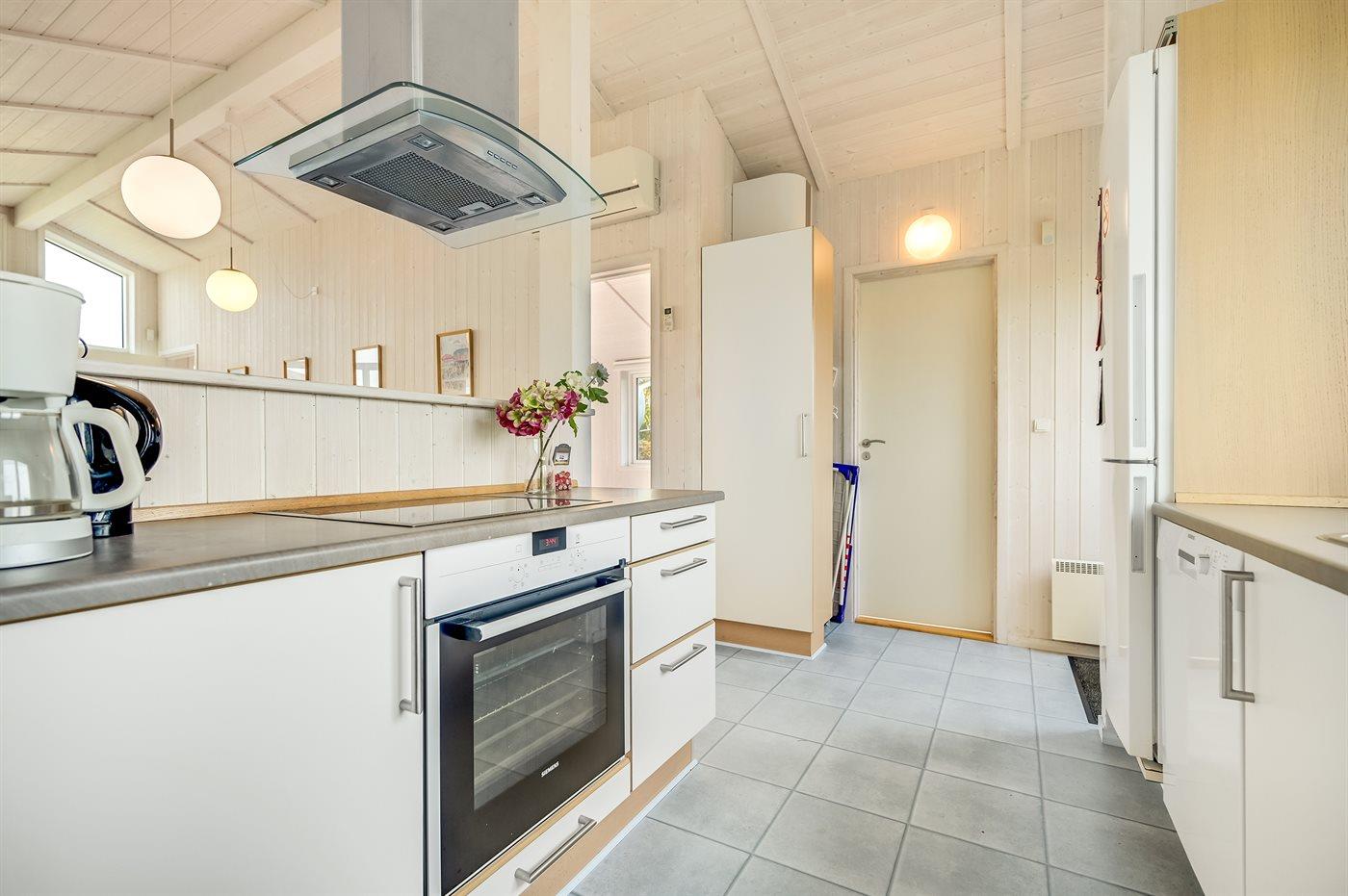 Køkkenet er udstyret med 1 køleskab. Der er 4 keramiske kogeplader, varmluftovn, mikrobølgeovn samt opvaskemaskine.