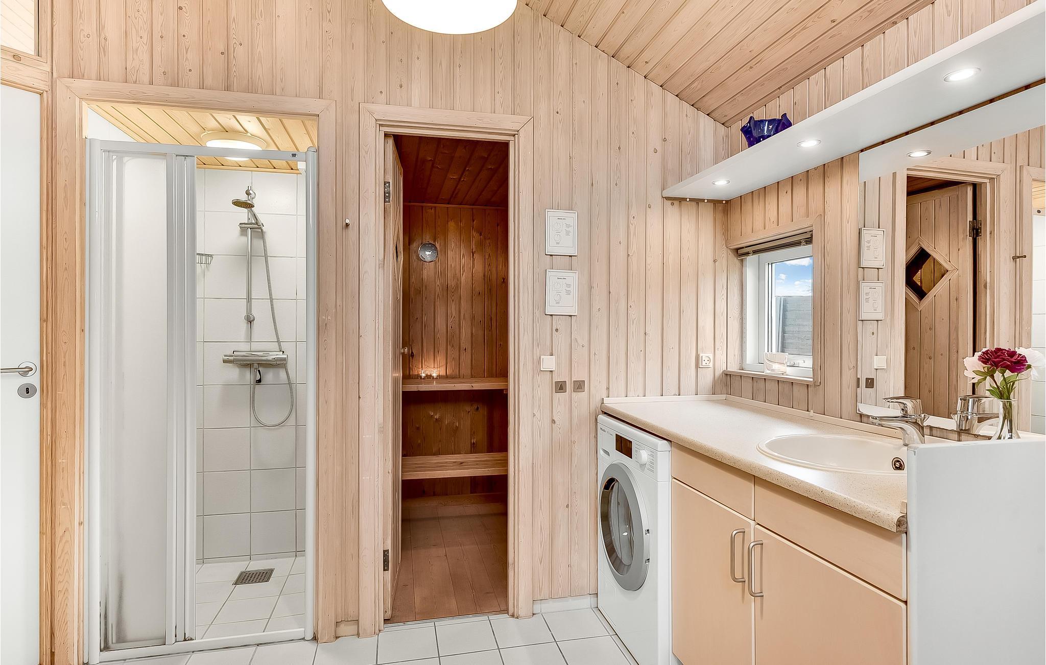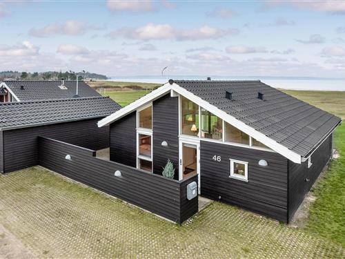 Velkommen til dette hyggelige, rummelige og lyse feriehus, der med åbent til kip og flotte trægulve, vægge- og lofter oser af feriestemning. Selv på kolde dage kommer der meget lys ind gennem de store vinduespartier. Efter en rask gåtur kan I tænde op i brændeovnen eller smutte en tur i saunaen, og om aftenen kan I flade ud i den bløde sofa og se en god film på fladskærmen eller afslutte dagen med en kølig drink i spabadet.