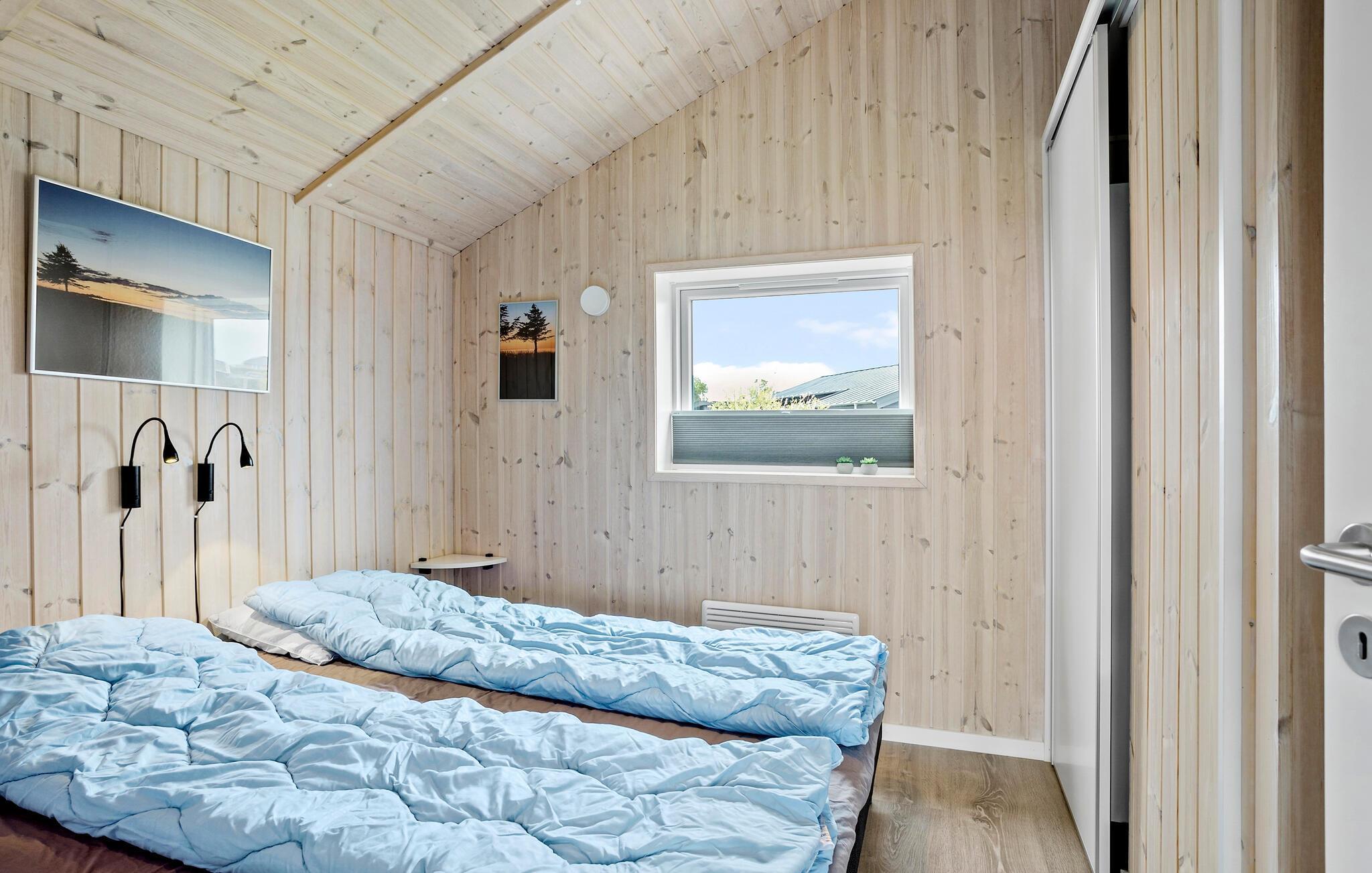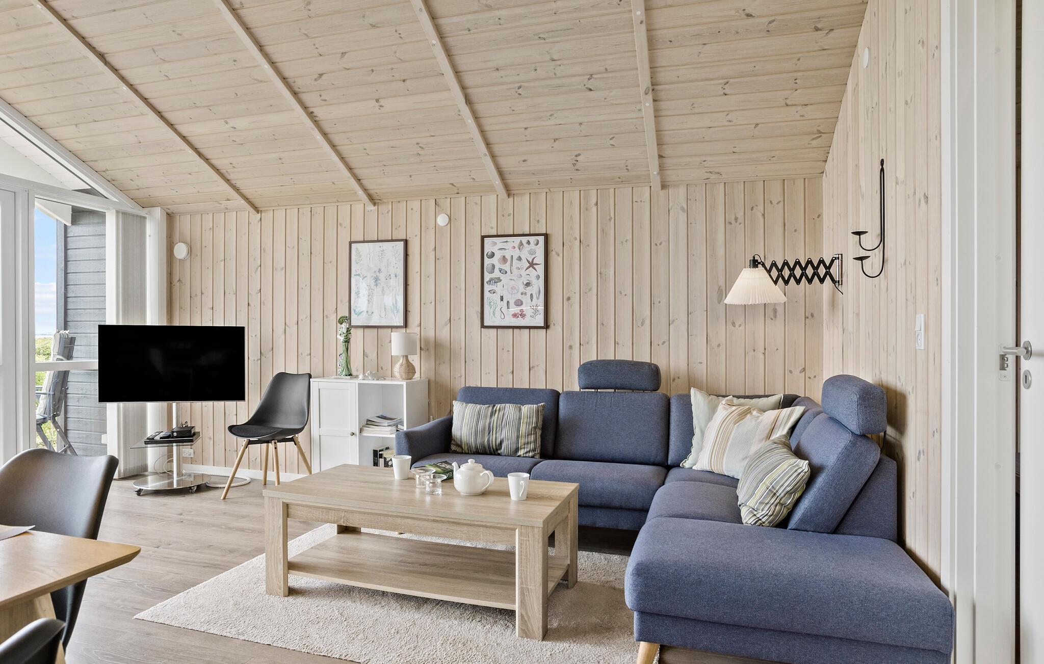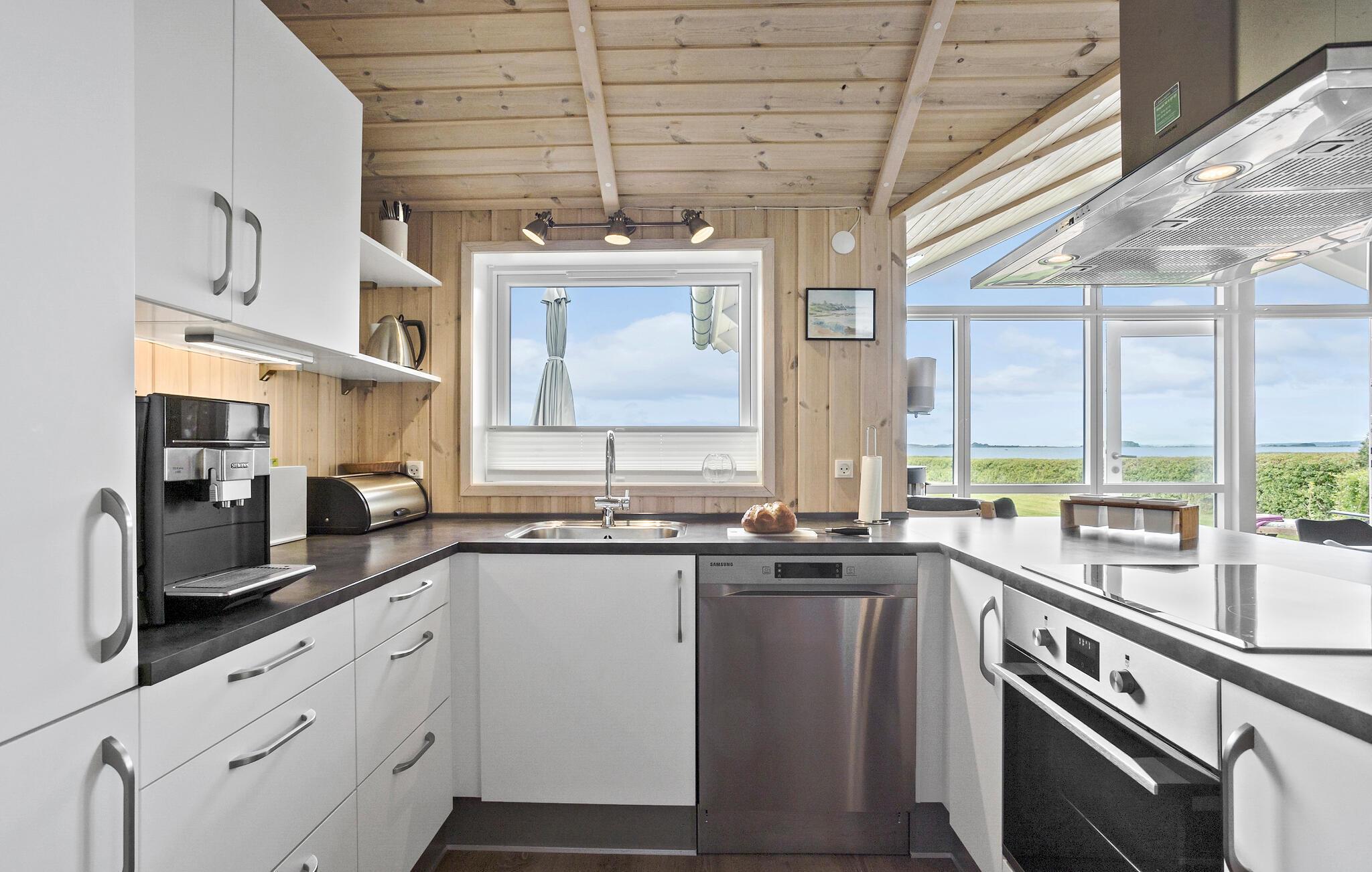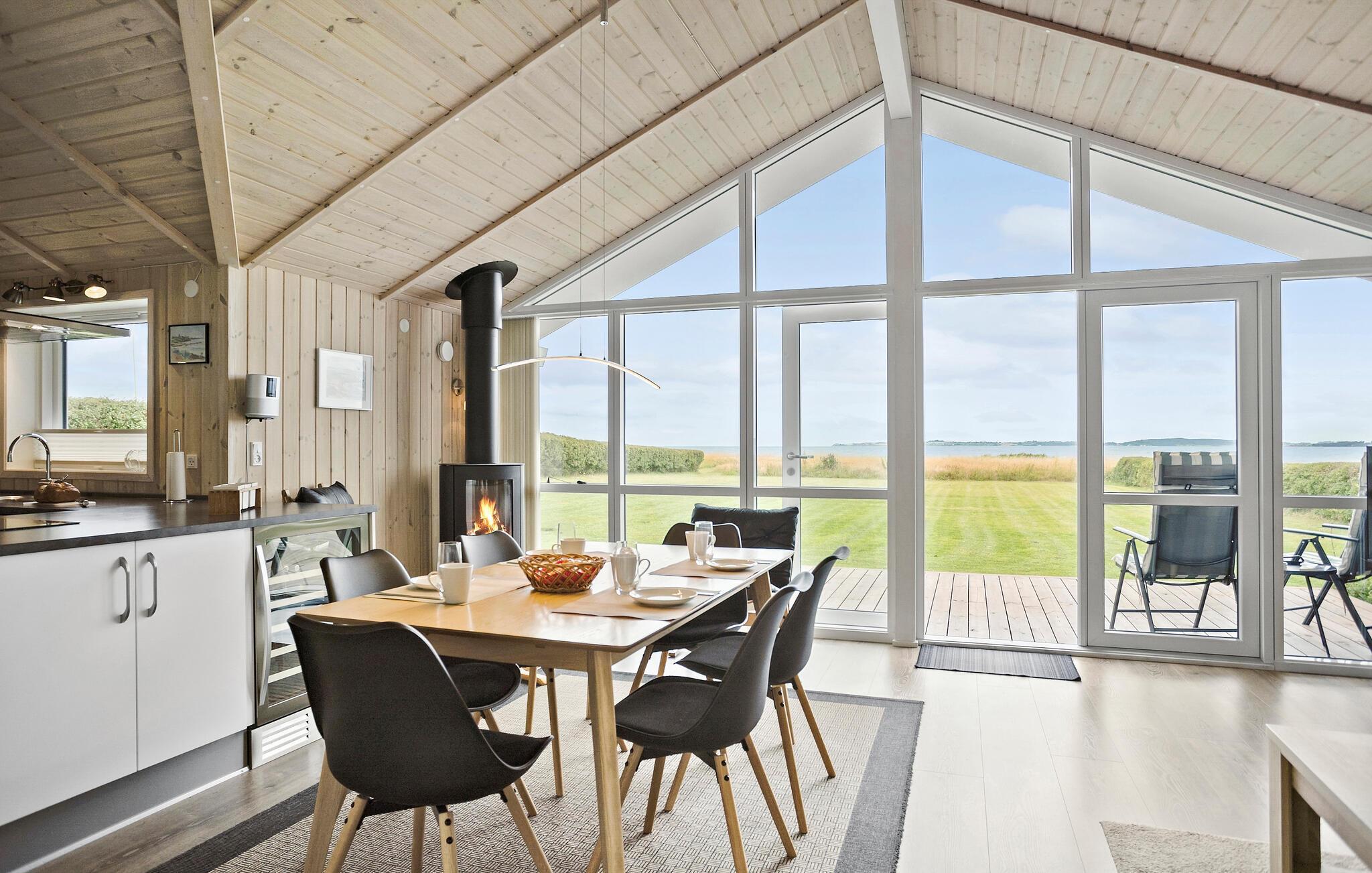 Velkommen til dette hyggelige sommerhus, som er indrettet med træbelagte lofter og vægge og højt til loftet. De store vinduespartier lukker både en masse lys ind og giver en fantastisk udsigt til haven og vandet i baggrunden. I det åbne køkken kan I lave lækre retter, eller smide jer i sofaen med en god film på tv’et om aftenen. På køligere dage kan I tænde op i brøndeovnen og lave en kop te at varme jer på.