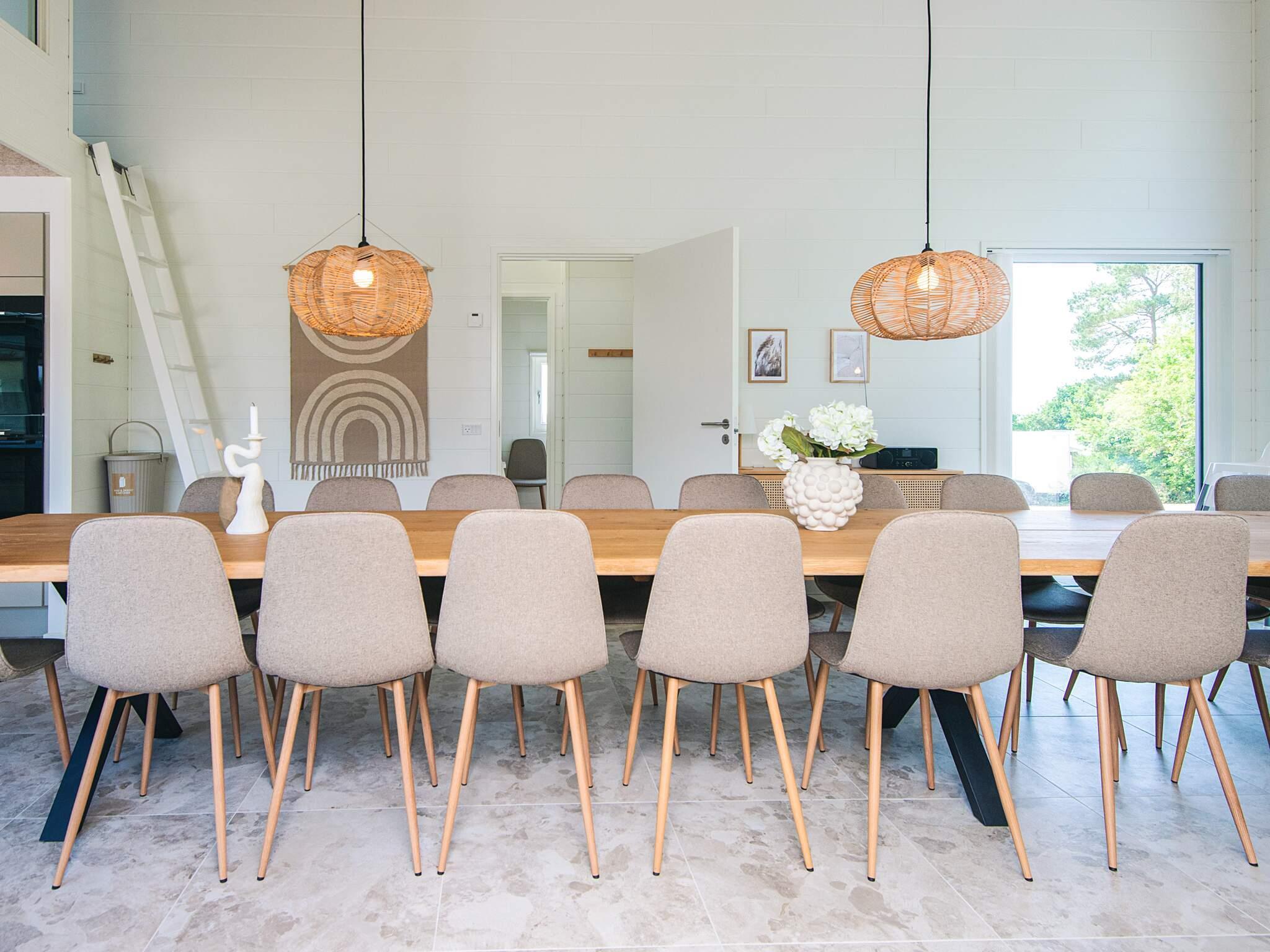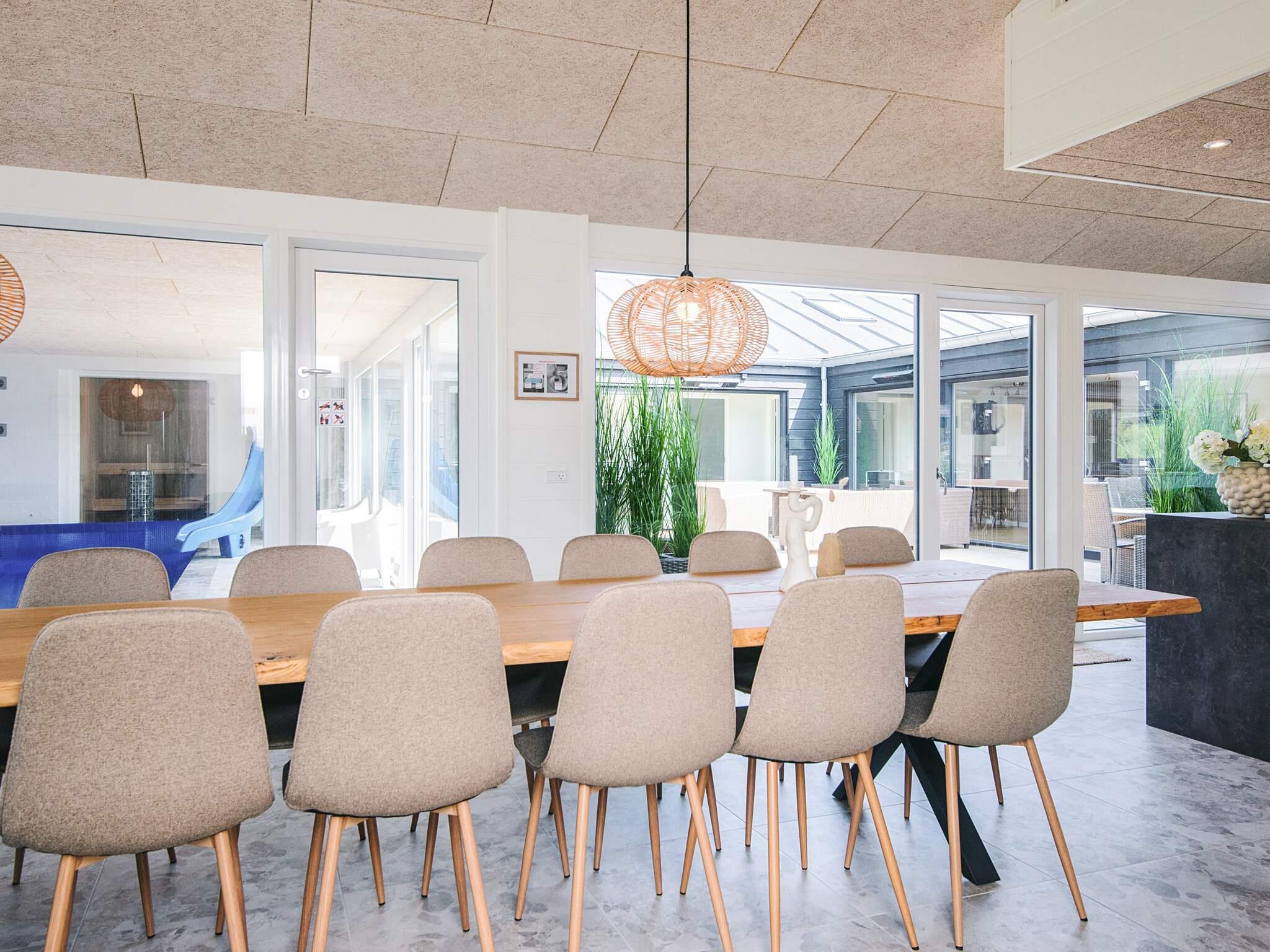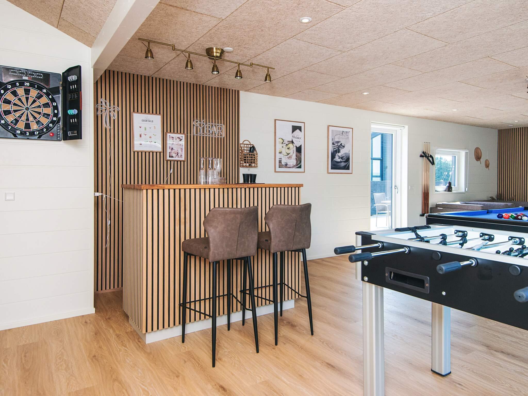 Denne rummelige og moderne feriebolig er ideel til op til 22 personer og rummer hele 268 m². Huset er opført i 2025 og er indrettet med fokus på komfort, energioptimering og gode faciliteter for både børn og voksne. Boligen opvarmes via en energivenlig luft-til-vand-varmepumpe, og der er desuden solvarme og gulvvarme i hele huset. Til de praktiske gøremål er der både vaskemaskine, tørretumbler og en fryser med en kapacitet på 160 liter. Der er også en hyggelig brændeovn, som skaber en varm og indbydende stemning. Til de mindste er der to barnestole og to barnesenge. Feriehuset ligger på en 2.023 m² stor naturgrund, blot 800 meter fra havet og samme afstand til nærmeste indkøbsmulighed. Udendørs finder du en lukket terrasse med både gynge, sandkasse, trampolin, legetårn og rutsjebane. Der er også et udekøkken samt gasgrill, så du kan nyde maden under åben himmel (gas skal selv medbringes). Desuden er der installeret stik til opladning af elbil (Type 2) med en ladeeffekt på 11 kW, og der er parkering lige ved boligen. Indendørs byder boligen på en dejlig swimmingpool med en temperatur mellem 24 og 28 °C. Poolen er 6 meter lang, 3 meter bred og op til 1,4 meter dyb – perfekt til både leg og afslapning. I aktivitetsrummet er der rig mulighed for underholdning med billard, bordtennis, dart og bordfodbold. Feriehuset rummer i alt 7 soveværelser fordelt på: 3 soveværelser med dobbeltsenge 2 værelser med en dobbelt og enkeltseng 2 værelser med 2 enkeltsenge 6 sovepladser på madrasser fordelt på 3 hemse Køkkenet er godt udstyret til store grupper med 3 køleskabe, 4 induktionskogeplader, 2 varmluftsovne, mikrobølgeovn og 2 opvaskemaskiner. Der er i alt 4 badeværelser med bruser og 3 toiletter – alle badeværelser har gulvvarme. Til afslapning tilbyder huset både en indendørs spa med plads til 4 personer, en udendørs spa med stående vand til 7 personer samt en sauna. På terrassen er der desuden 4 terrassevarmere med indbyggede højttalere, så I kan nyde aftenerne udendørs – også når temperaturen falder. Underholdningen er også sikret med 2 Smart TV'er, hvor der kan modtages 1-3 hollandske kanaler, mindst 4 tyske og 1-3 engelske kanaler. Trådløst internet er naturligvis tilgængeligt i hele huset. Bemærk: Det er ikke tilladt at leje huset som ungdomsgruppe.