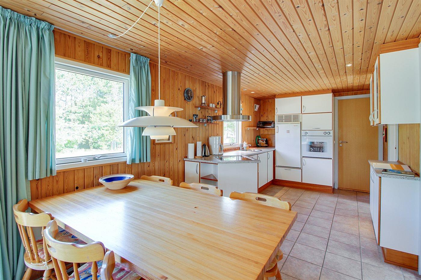 Køkkenet er udstyret med 1 køleskab. Der er 4 keramiske kogeplader, varmluftovn, mikrobølgeovn samt opvaskemaskine.