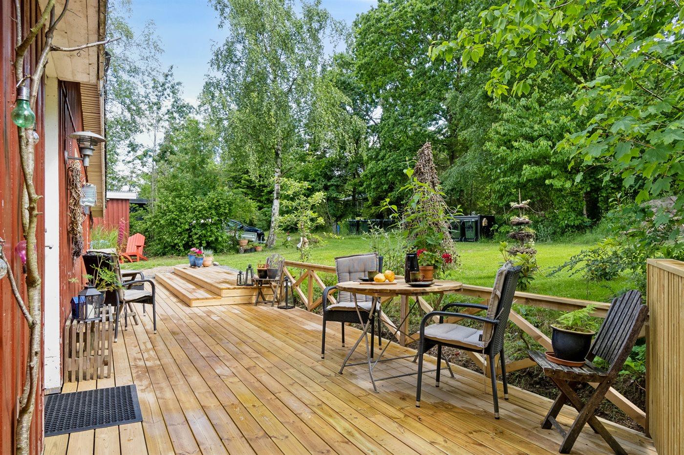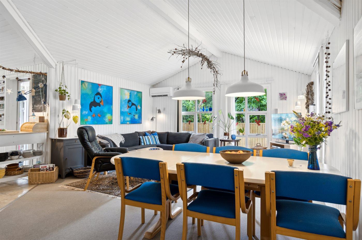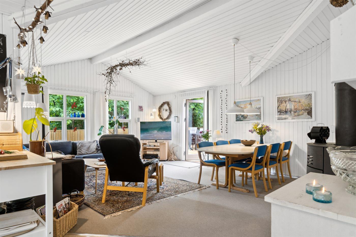 Dette sommerhus ligger på en ugeneret grund med udgang til skønne terrassearealer. Her findes gode udendørsmøbler, hvor i solen kan nydes i naturskønne omgivelser. Havet og den gode badestrand ligger lige i nærheden. Desuden byder området på en hyggelig havn.