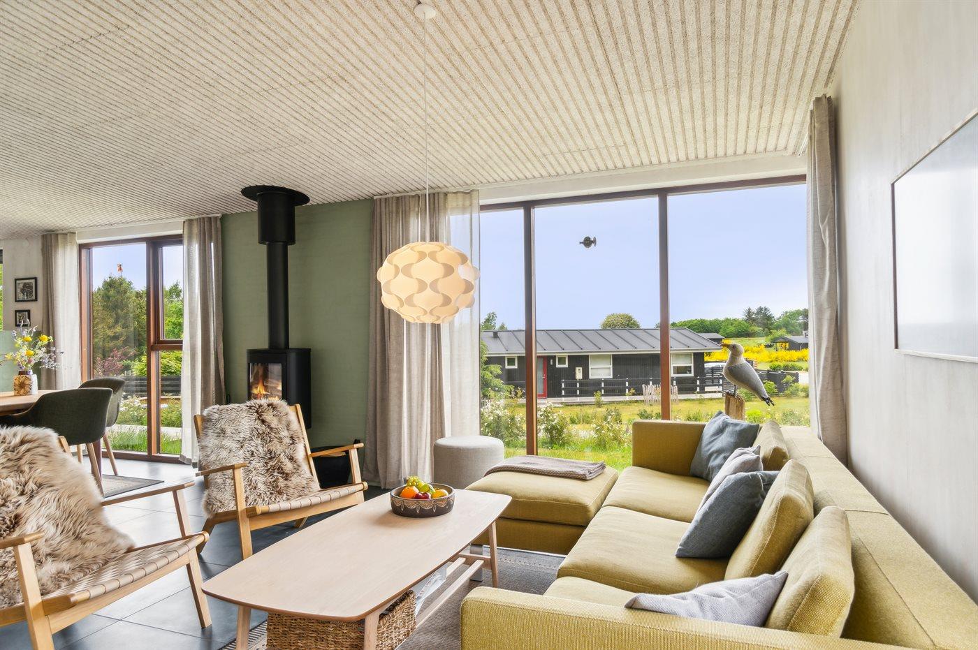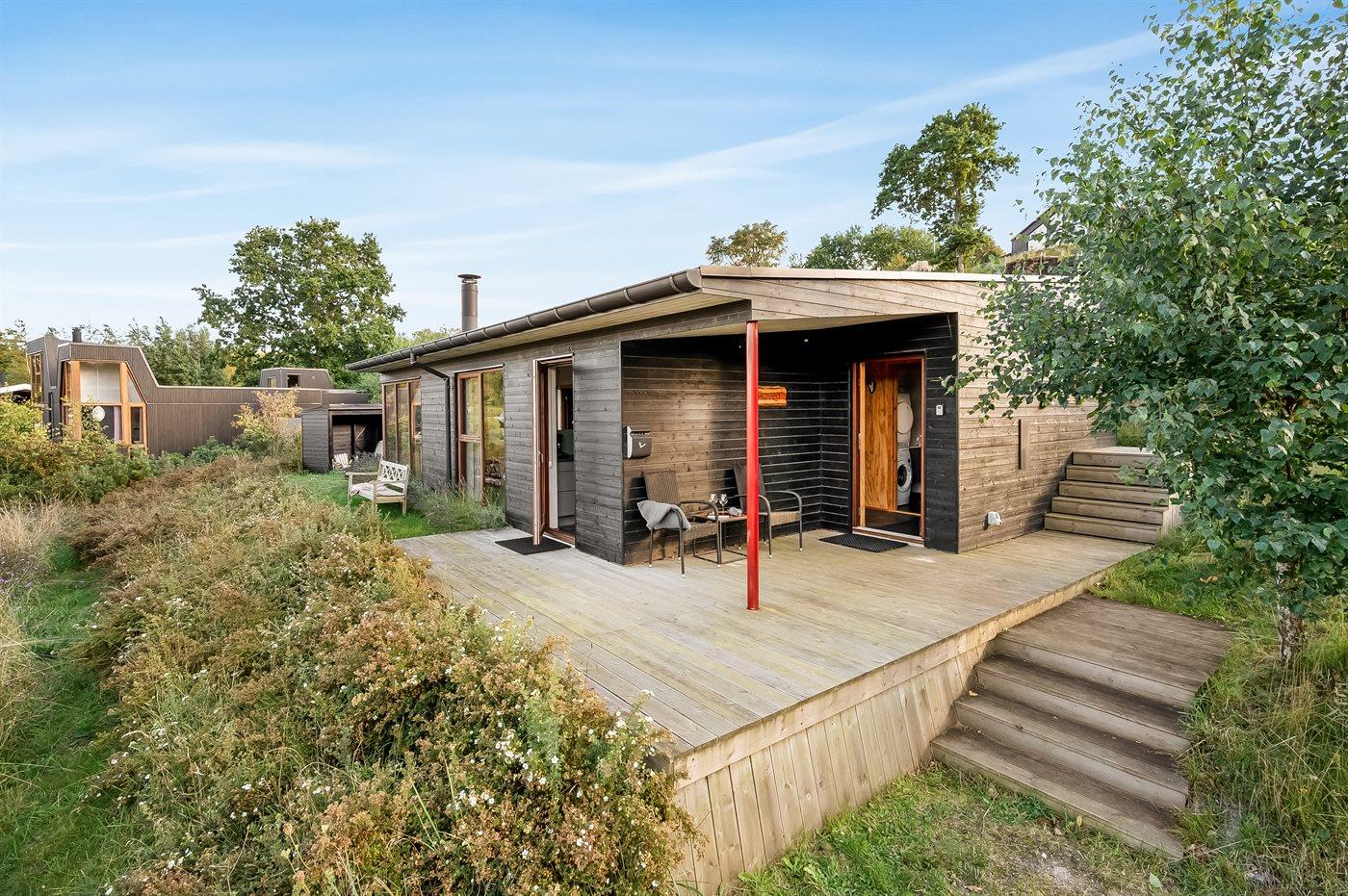 Dette flotte og særdeles moderne sommerhus, bygget i 2021, ligger i et skønt og attraktivt ferieområde. Husets store køkkenalrum/stue er en oplevelse værd med spændende detaljer og med et godt lysindfald fra de store vinduer. På bagsiden af huset findes en trappe, som fører op til en udsigtsterrasse. Her finder I en 5-pers. udendørs spa, som kan benyttes hele året og hvorfra der er flot udsigt over vandet.