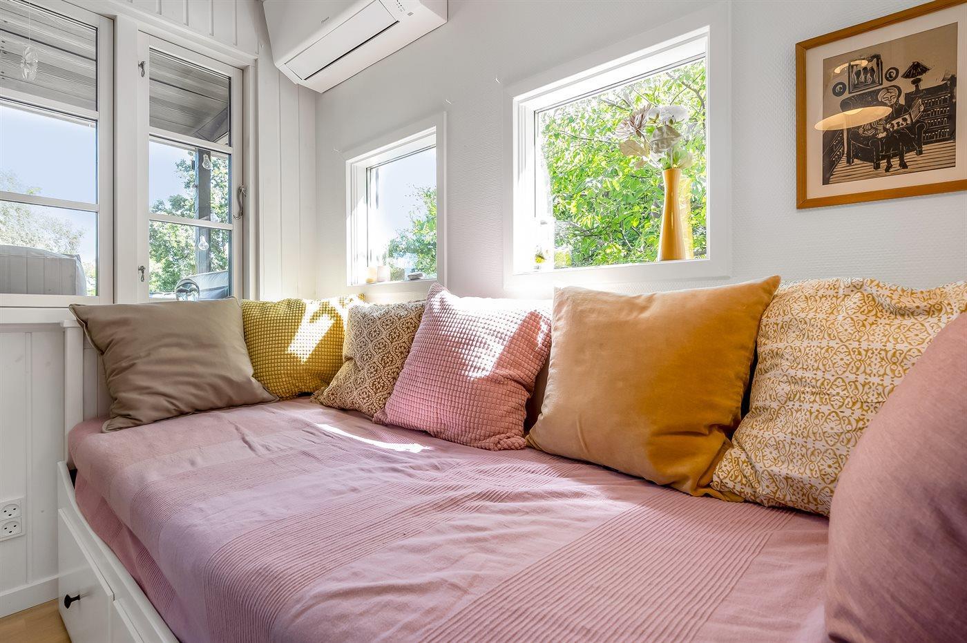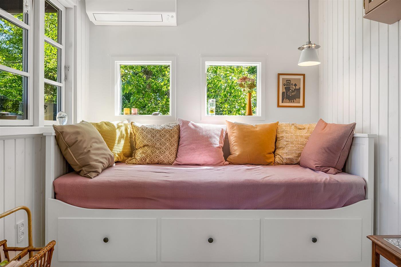 Der er i alt 2 soveværelser. Sovepladserne fordeler sig på: 2 sovepladser i dobbeltseng. 3 sovepladser i køjesenge. 1 soveplads i sovesofa (enkelt). 1 af disse sovepladser befinder sig i stuen. Derudover er der 1 stk. barneseng.