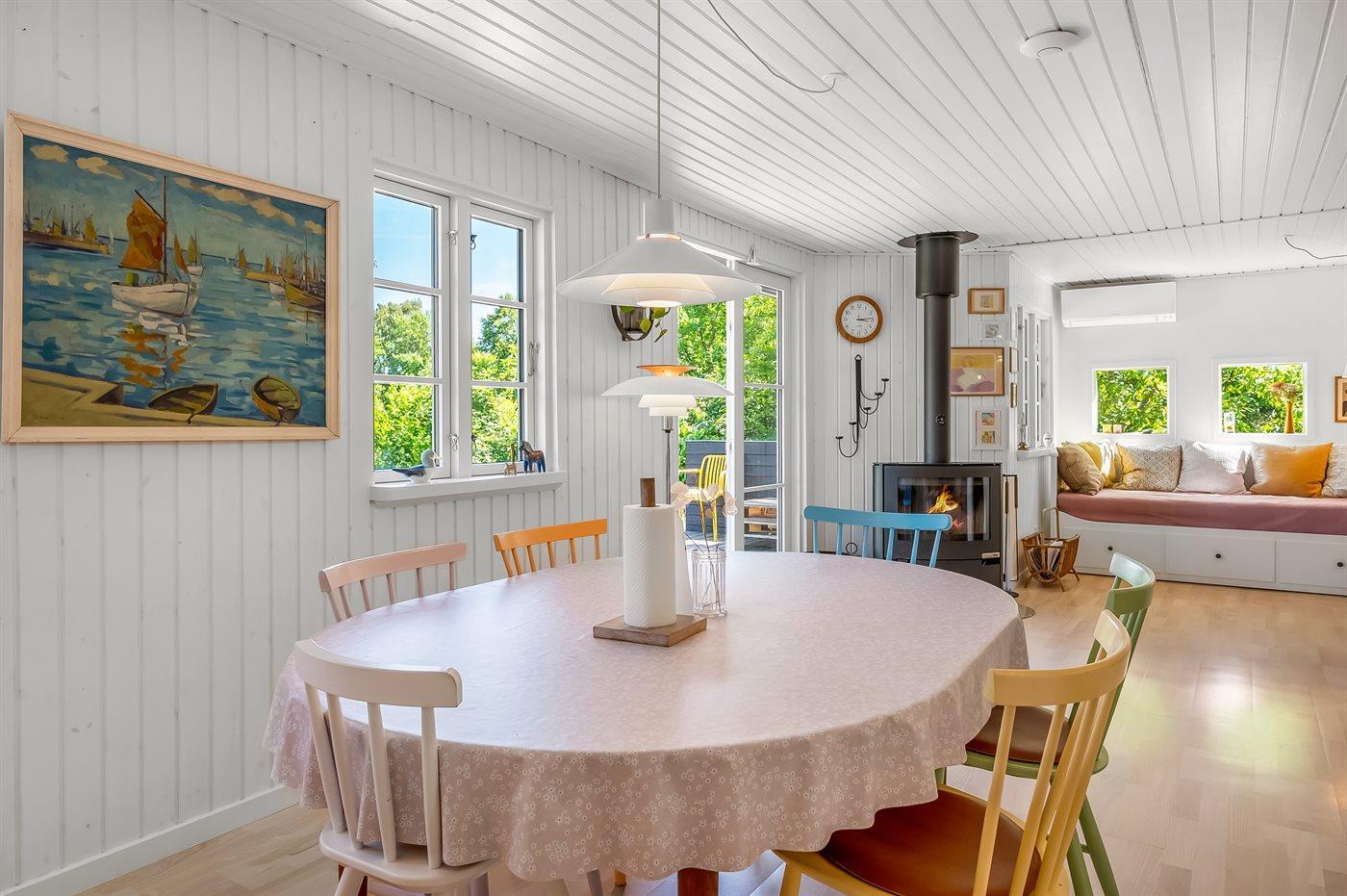 Huset passer rigtig fint til f.eks. en familie med børn eller blot et par, som ønsker at holde ferie i disse skønne omgivelser. Husets midtpunkt er køkken-alrummet, som er kombineret med opholdsstuen, hvor de store vinduespartier giver et virkelig godt lysindfald samt smuk udsigt til de grønne omgivelser. Der er fra stuen direkte adgang til den skønne terrasse. Ikke langt fra huset er der en fantastisk kuperet bøgeskov, hvor børnene kan bygge huler eller gynge i tov, ligesom hele familien kan gå en tur. Der går en hyggelig sti gennem skoven, som fører jer ned til havnen/byen.