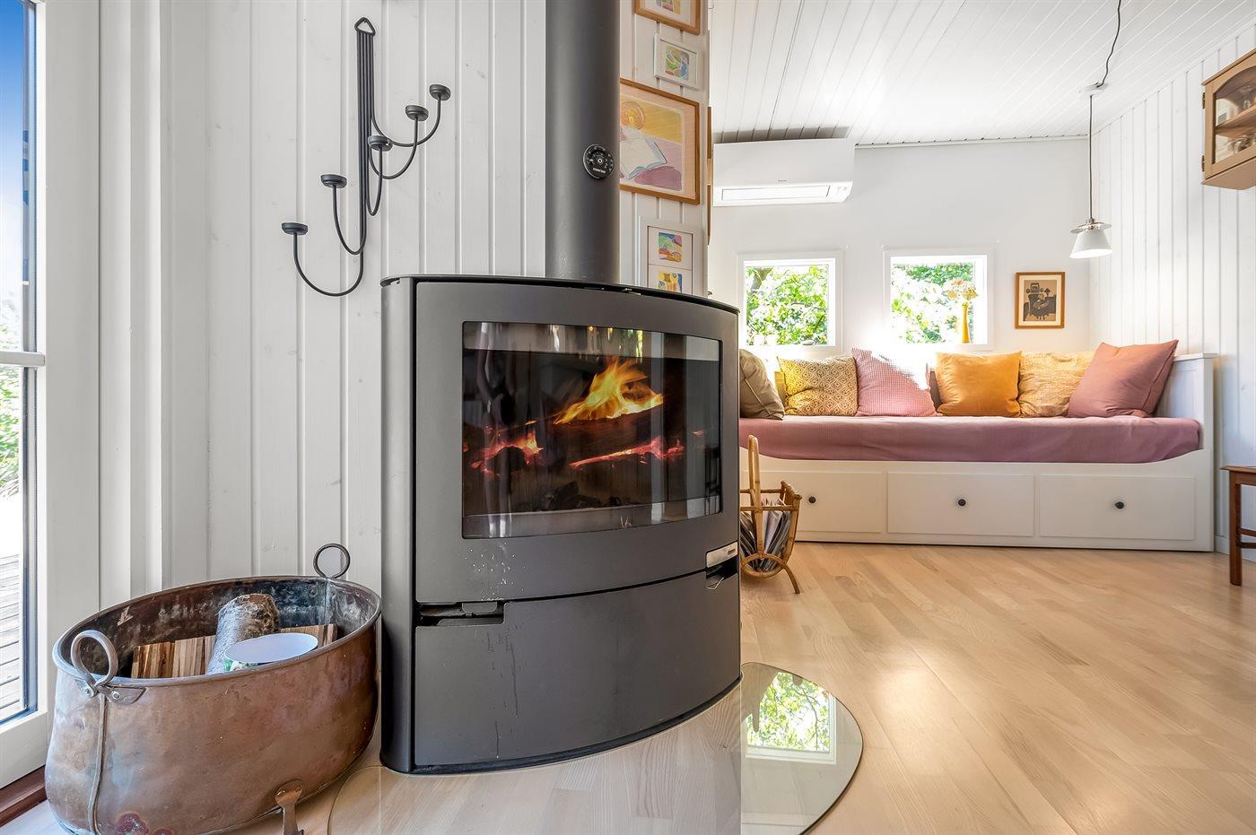 Indvendig fremstår sommerhuset lyst og med en god indretning, som passer rigtig fint til f.eks. en familie med børn eller blot et par, som ønsker at holde ferie i disse skønne omgivelser. Husets midtpunkt er køkken-alrummet, som er kombineret med opholdsstuen, hvor de store vinduespartier giver et virkelig godt lysindfald. Der er fra stuen direkte adgang til den skønne terrasse. Ikke langt fra sommerhuset midt i skoven findes en legeplads, hvor børn kan boltre sig.