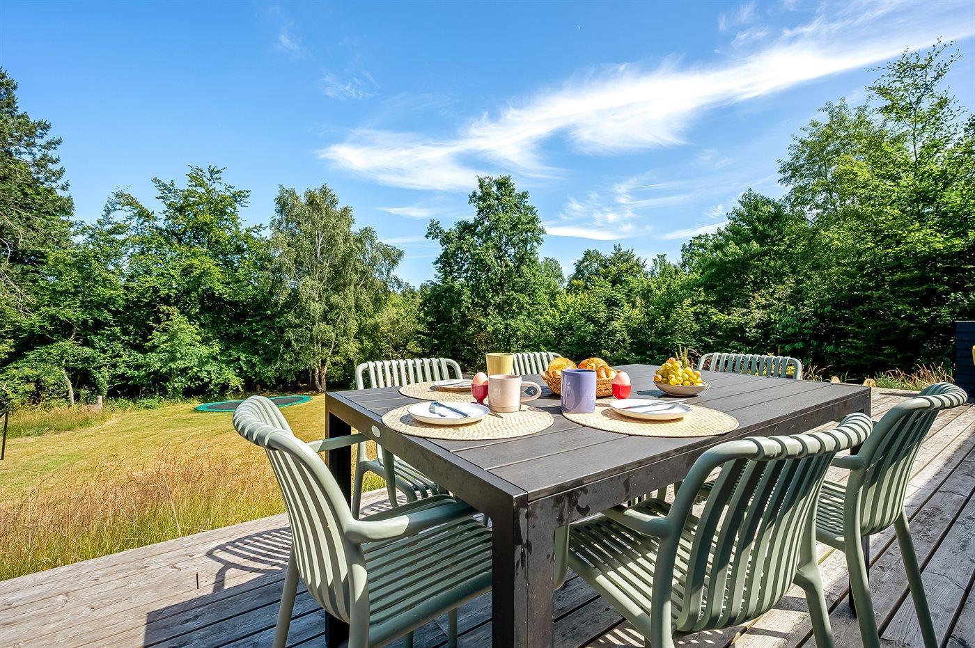 Sommerhuset ligger på en skråning helt ugenert omkranset af store træer og på en stor og skøn grund. Fra den store, delvist overdækkede terrasse er det muligt at have et godt overblik over haven, imens børnene hygger og leger. Derudover er det på grunden muligt at følge solen det meste af dagen og man kan altid finde en krog med læ – her kan stilheden nydes til fulde. Indvendig fremstår sommerhuset lyst og den åbne planløsning sikrer ekstra samvær og nærvær, ligesom lyse farver, små detaljer og hyggekroge sørger for en afslappende
