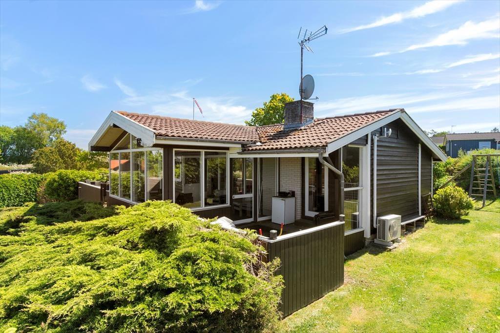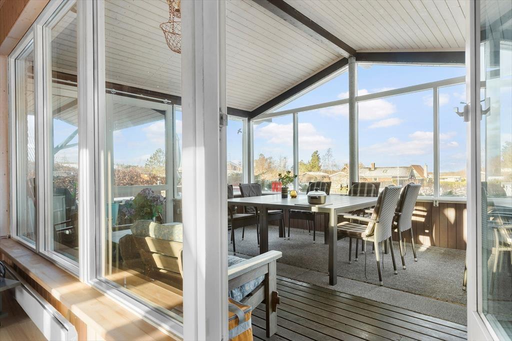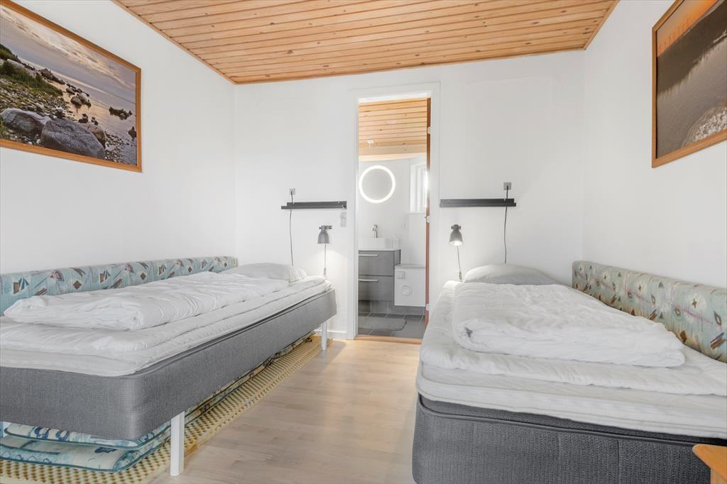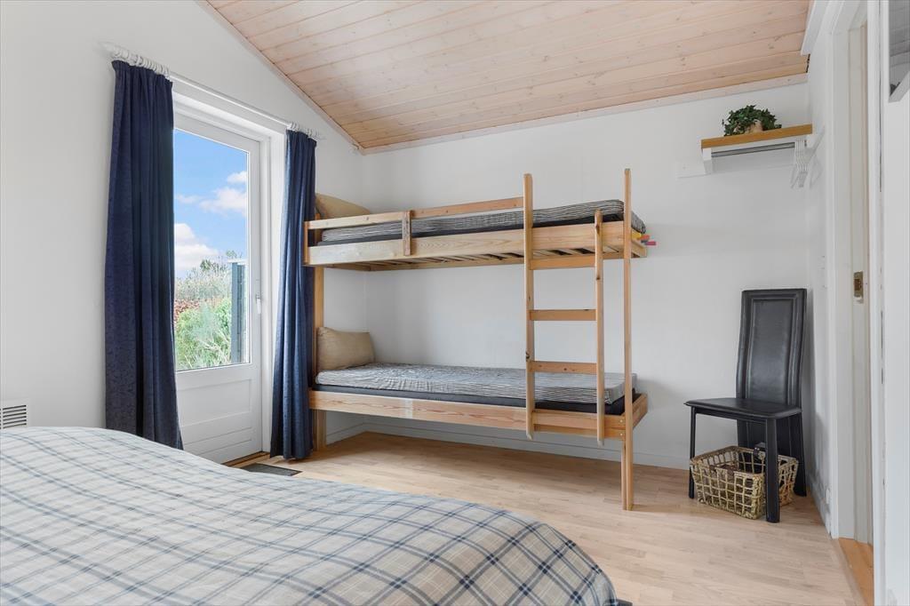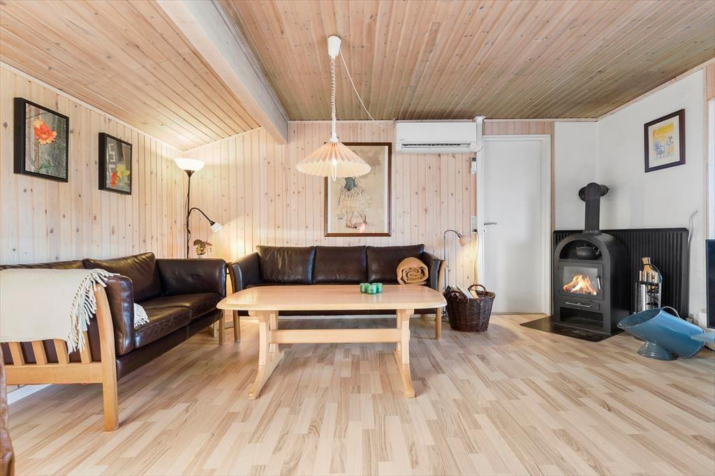Hyggeligt og rummeligt sommerhus, hvor den store familie vil stortrives. Stort og veludstyret køkken i åben forbindelse med fin spiseplads samt dagligstue med gode møbler, hvor du kan se tv og slappe af til brændeovnens knitren. Fra køkken/stue er der udgang til dejlig havestue med spisepladser til alle husets gæster. Havestuen forlænger sæsonen eller gør en regnvejrsdag hyggelig. I den ene ende af huset er der badeværelse med vaskemaskine og tørretumbler samt 2 soveværelser - ét med dobbeltseng og køjeseng og ét med 2 enkeltsenge. I den anden ende er der ét stort soveværelse med 2 enkeltsenge samt badeværelse. En rigtig fin planløsning.