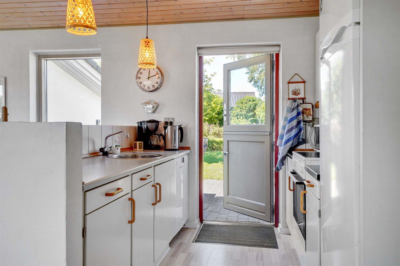 Køkkenet er udstyret med 1 køleskab. Der er 4 keramiske kogeplader, varmluftovn, mikrobølgeovn samt opvaskemaskine.