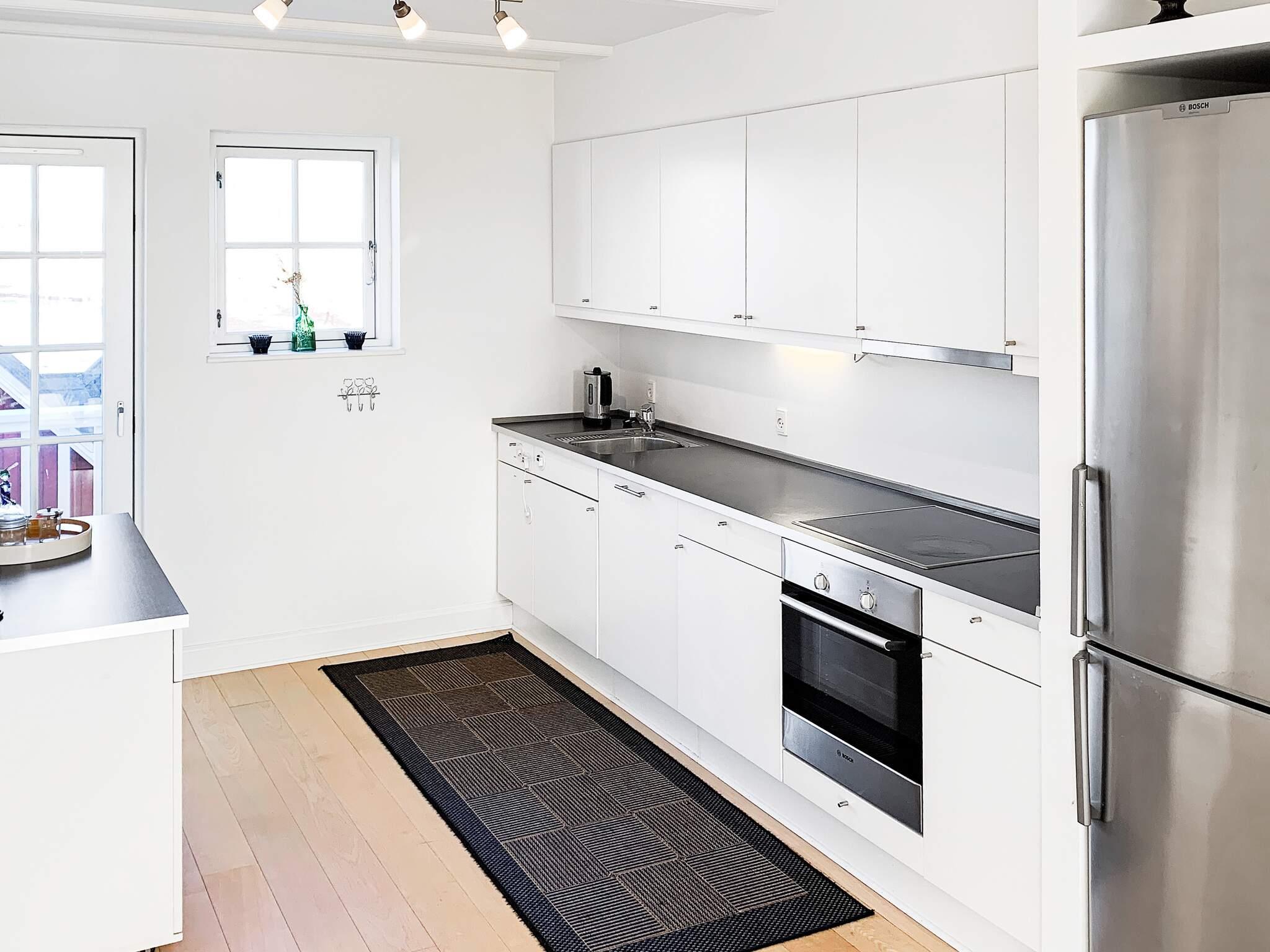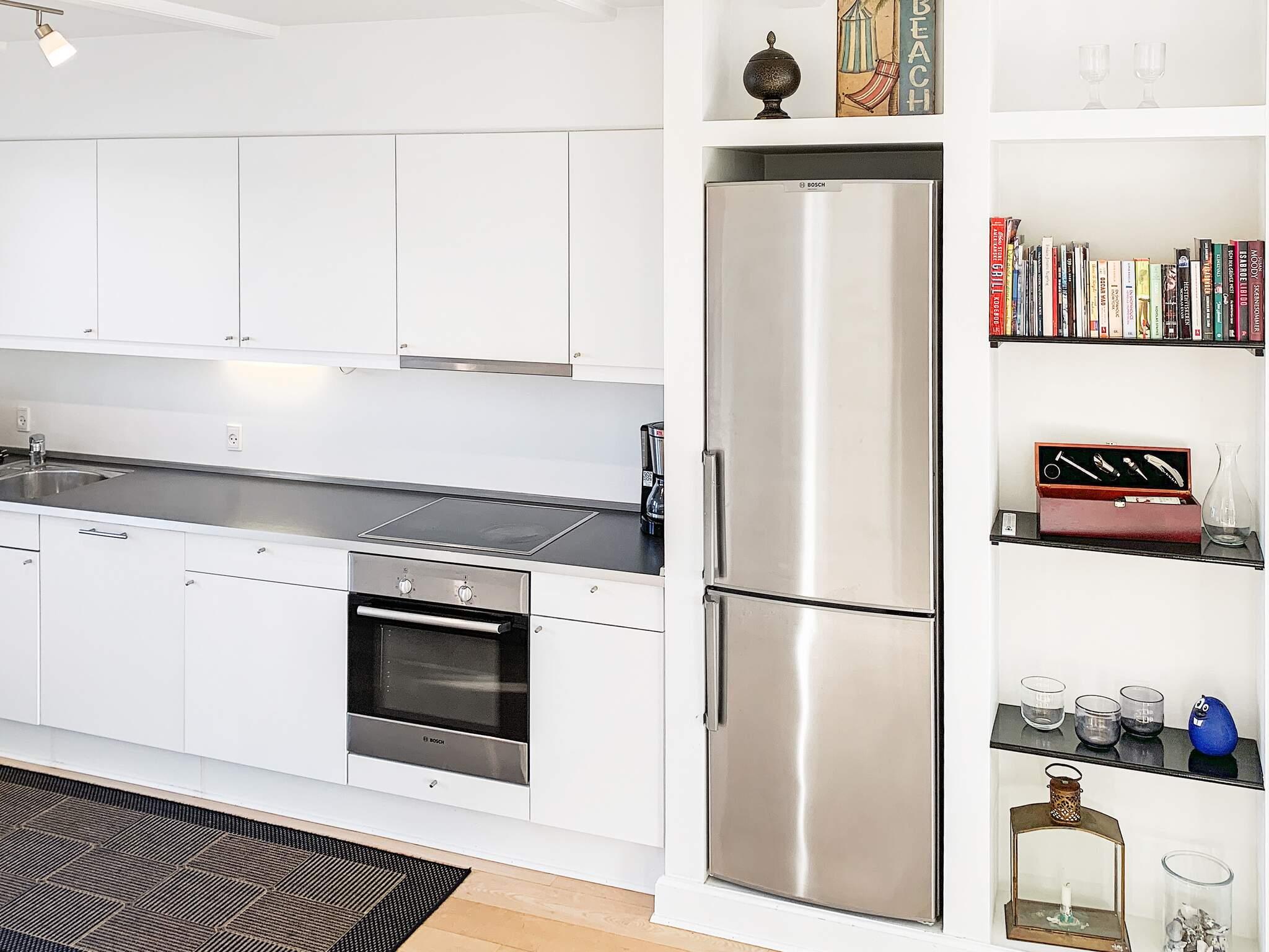 Køkken: El-komfur, køle-frys, emhætte, kaffemaskine, opvaskemask.