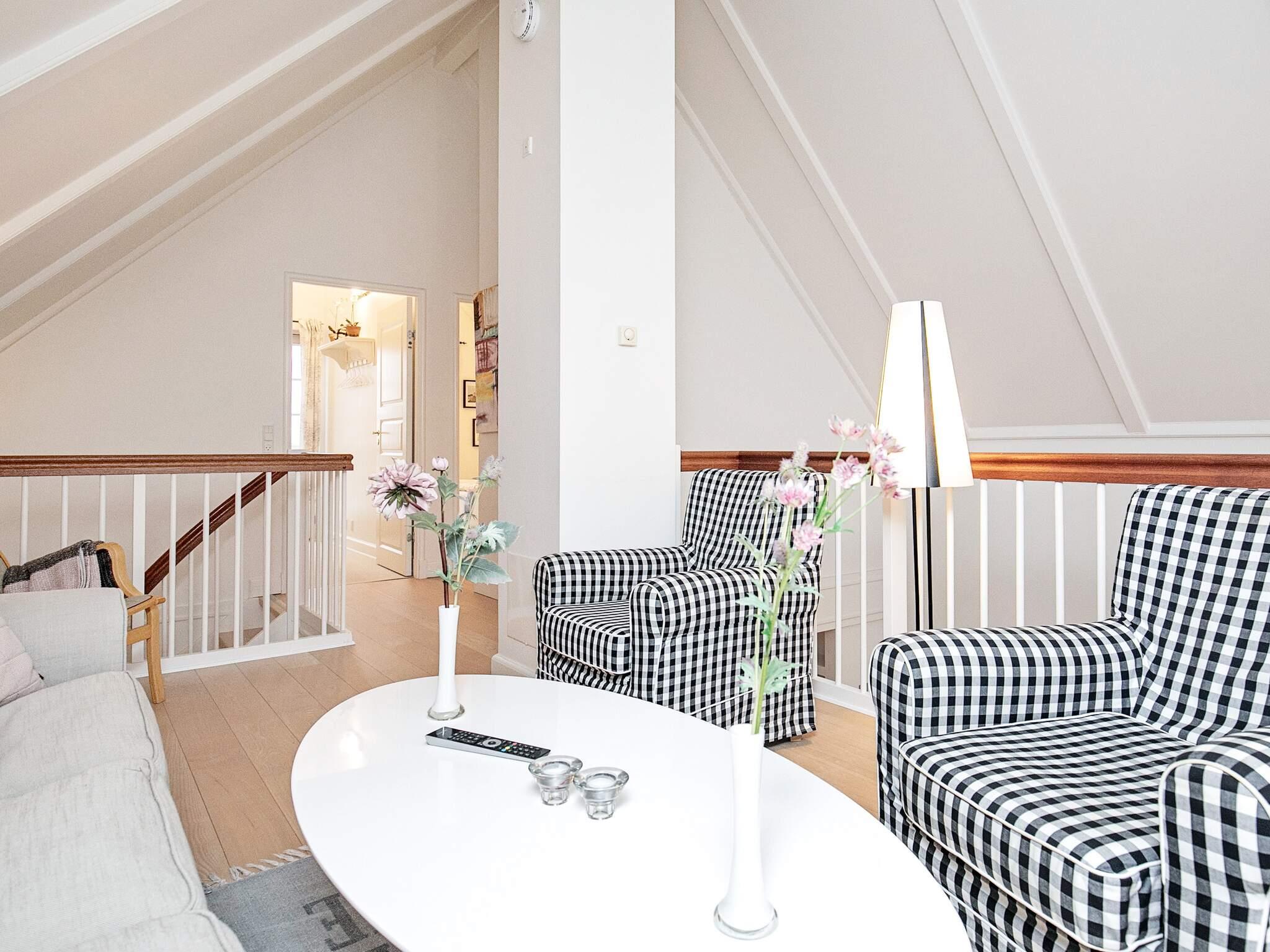 Lejligheden ligger både på 1. og 2. sal og er møbleret med moderne kvalitetsmøbler. 1. sal indeholder garderobe, kombineret køkken og spisestue samt et soverum med mørklægningsgardiner. Badeværelse med 3-personers spabad, bruseniche og sauna til 3 personer.