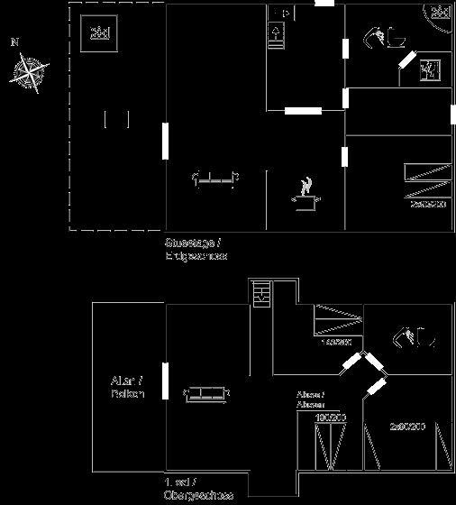 Bemærk at der på hemsene er to boxmadrasser og, at de to af sovepladserne er i alkove på 1. salen.