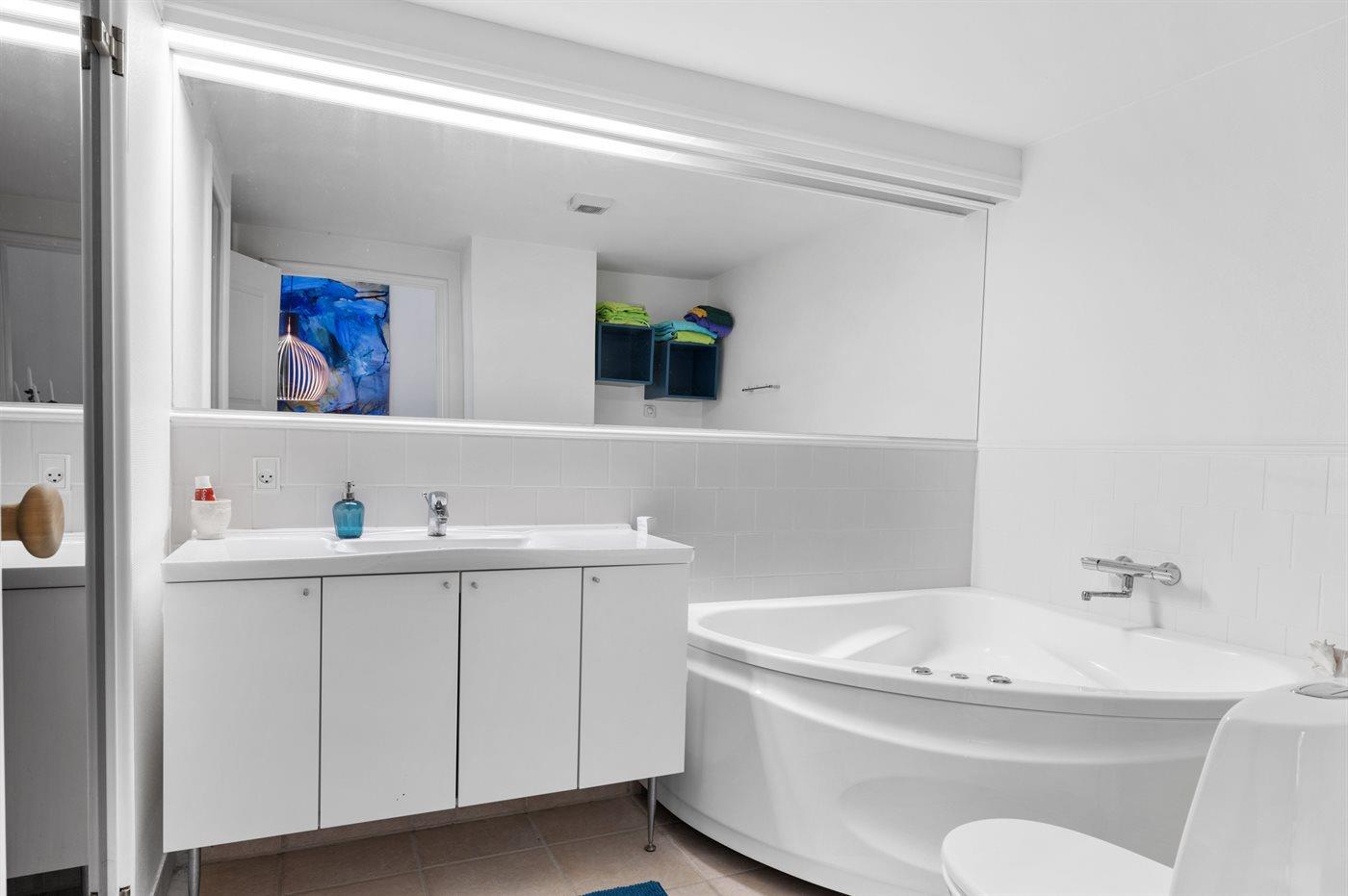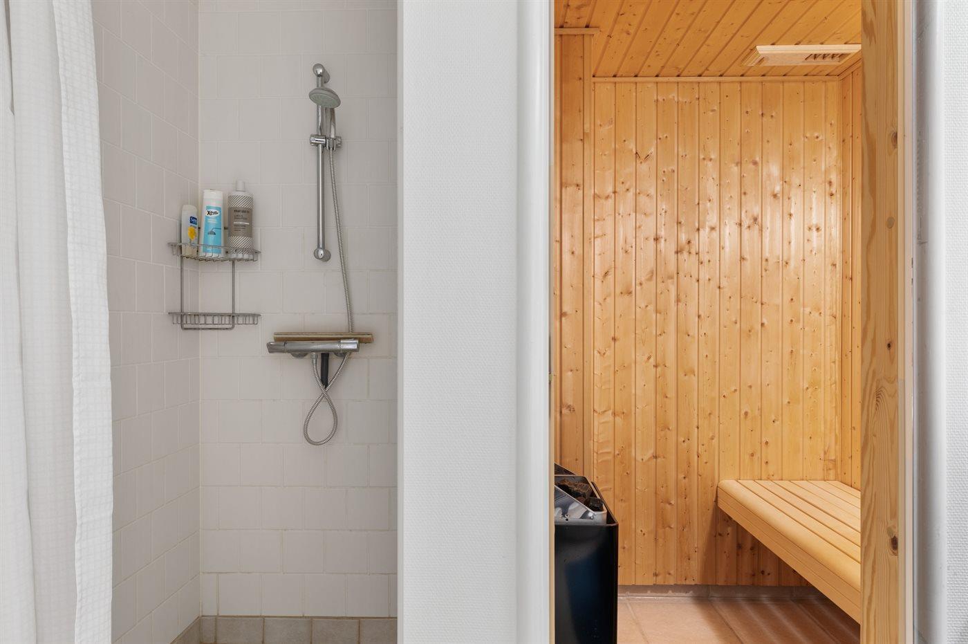 Der er 2 badeværelser med bruseniche og 2 toiletter. Der er gulvvarme på 2 badeværelser. I saunaen er der mulighed for afslapning.
