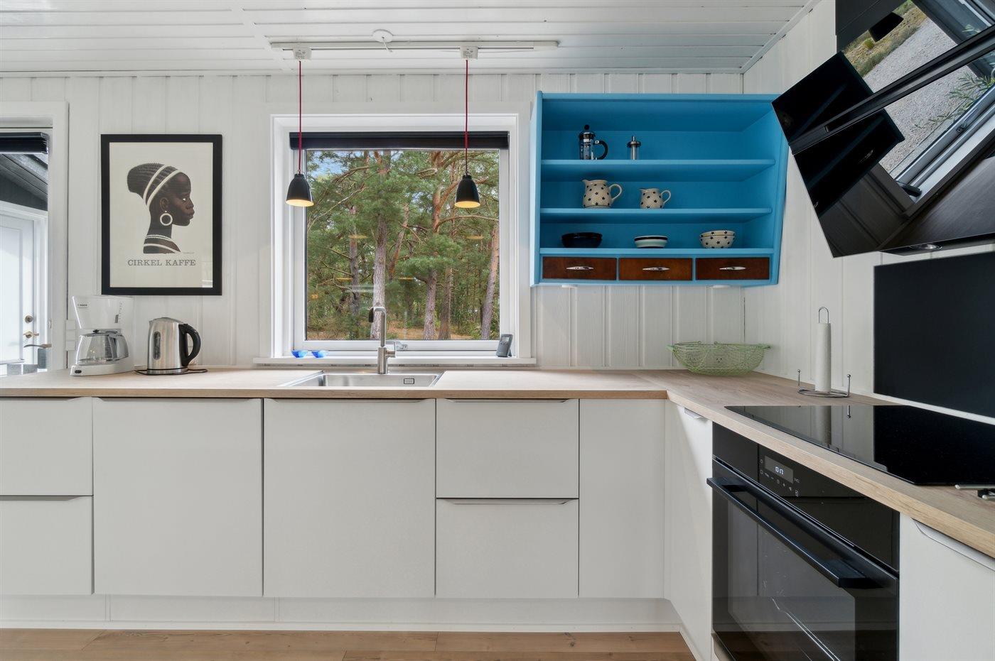 Køkkenet er udstyret med 1 køleskab. Der er 4 keramiske kogeplader, varmluftovn, mikrobølgeovn samt opvaskemaskine.
