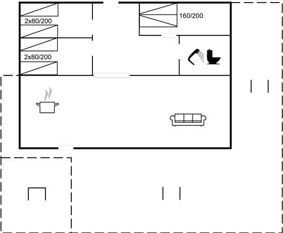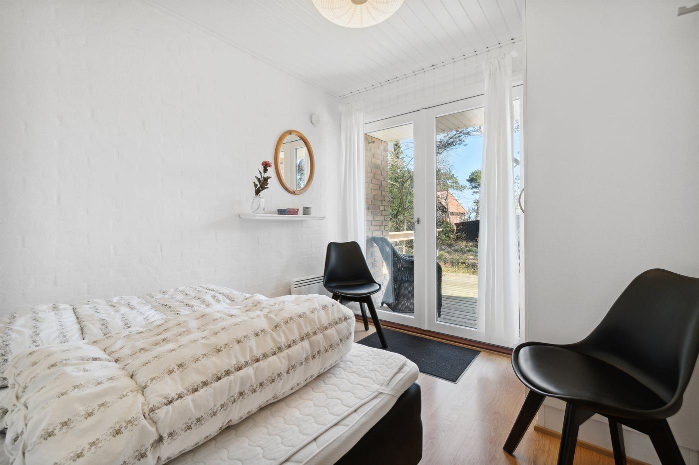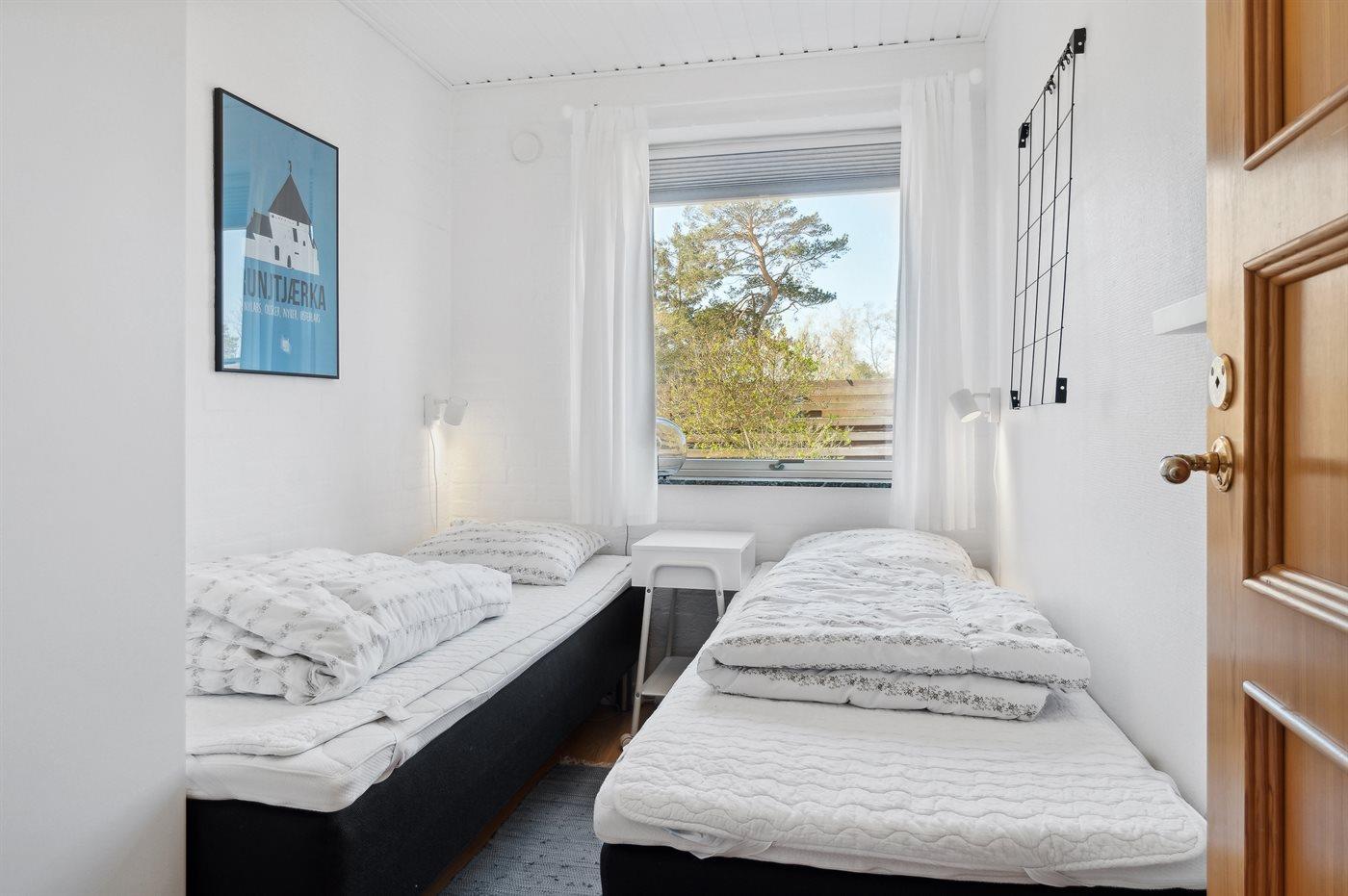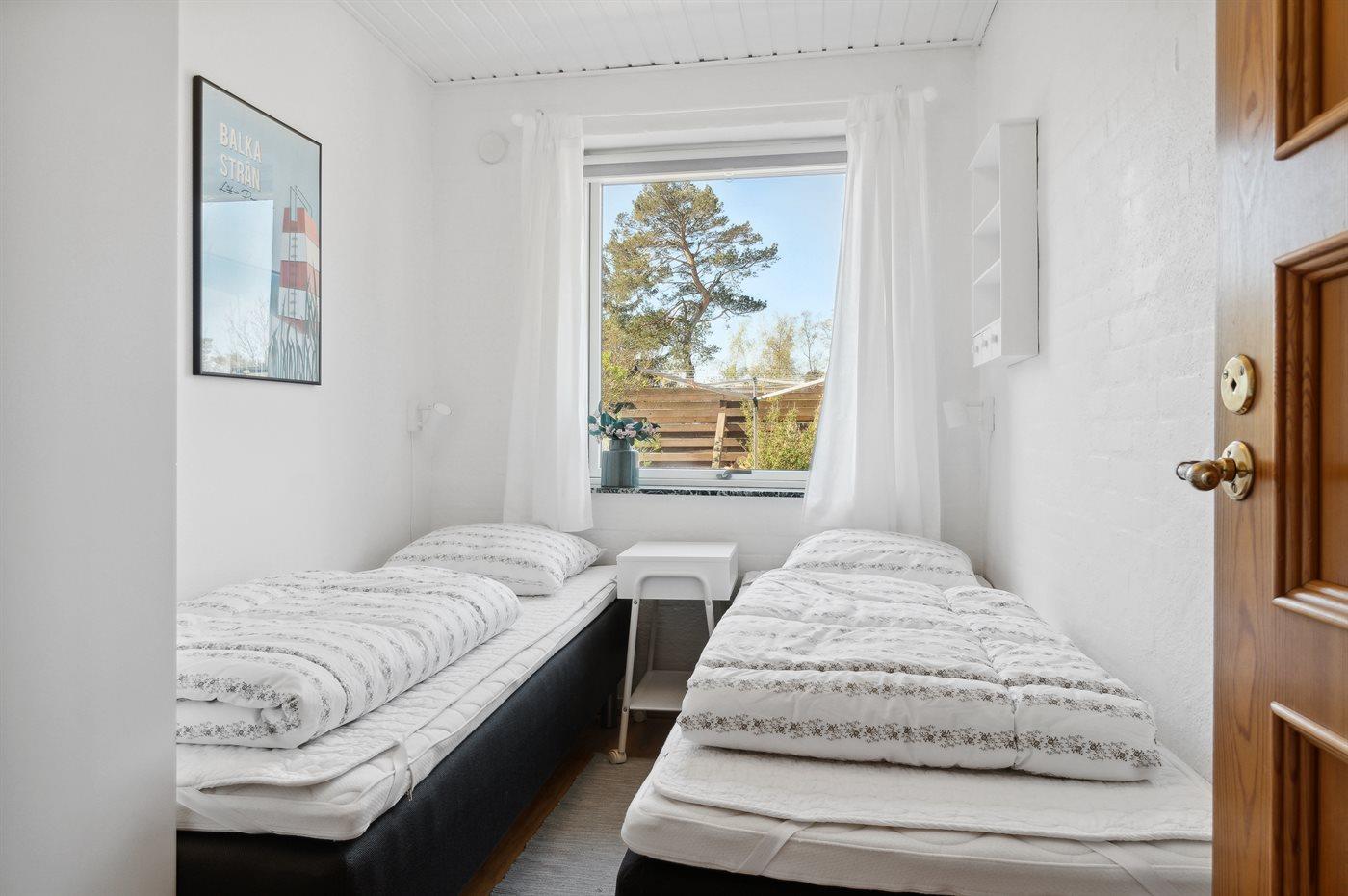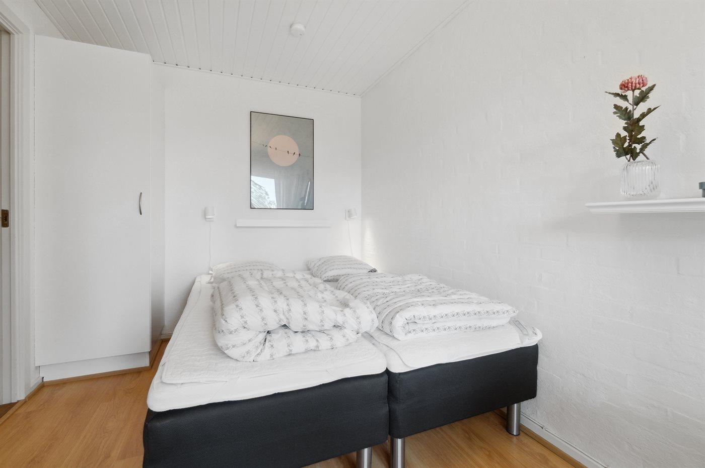Der er i alt 3 soveværelser. Sovepladserne fordeler sig på: 2 sovepladser i dobbeltseng. 4 sovepladser i enkeltsenge. Derudover er der 1 stk. barneseng.