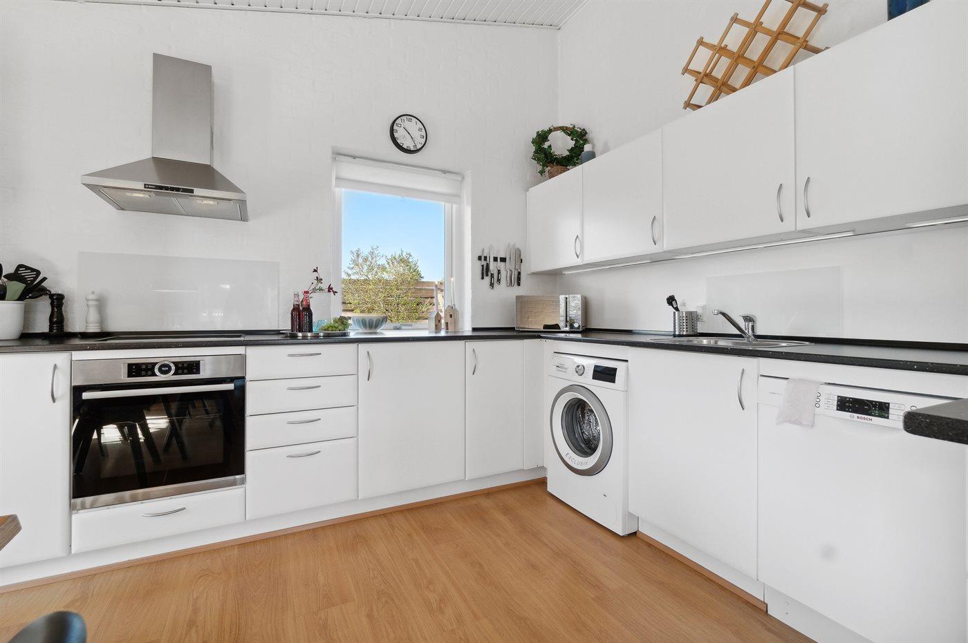 Køkkenet er udstyret med 1 køleskab. Der er 4 induktionskogeplader, varmluftovn, mikrobølgeovn samt opvaskemaskine.